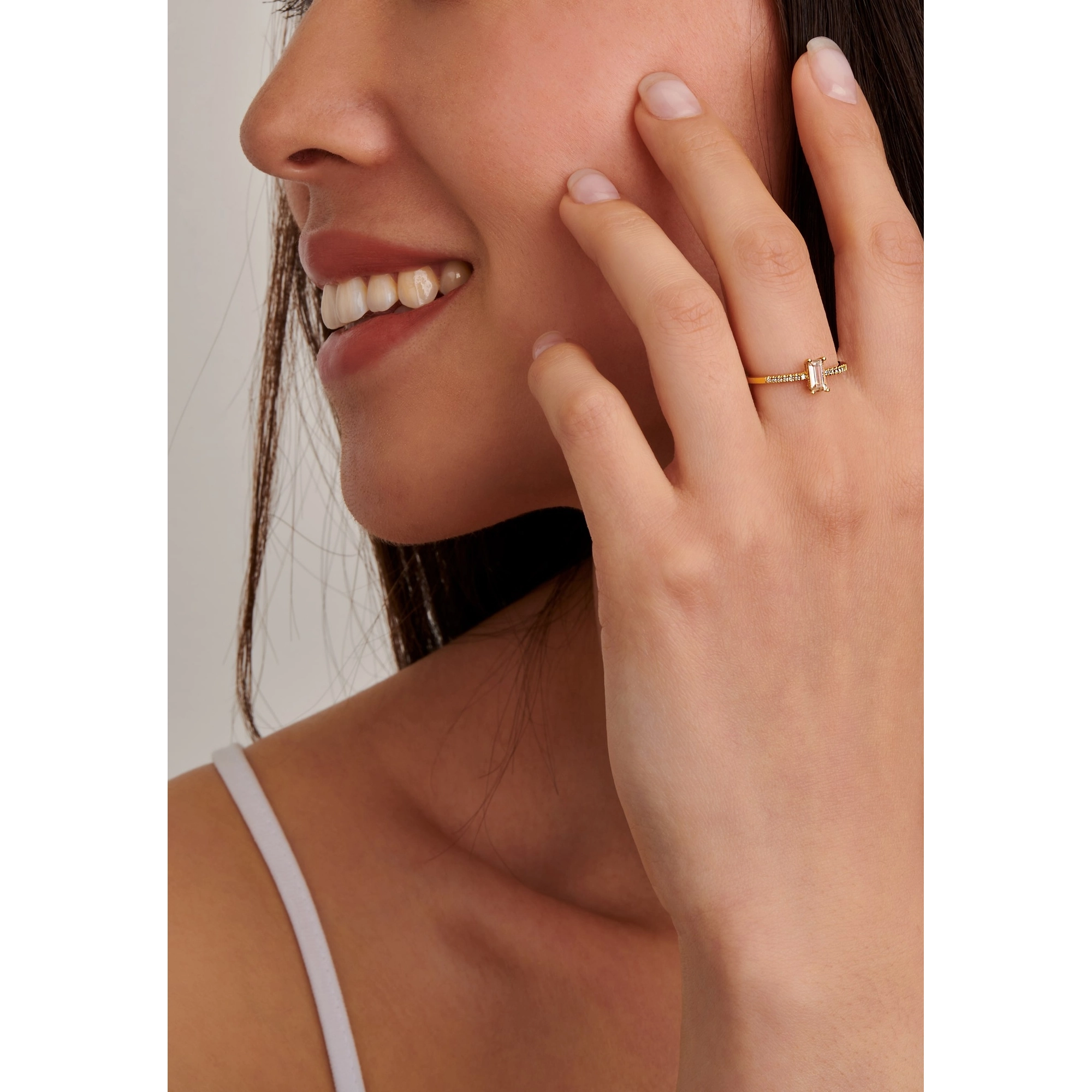 An alluring baguette-shaped Morganite, the gemstone of divine love, surrounded by 14x white diamonds for a romantic and sophisticated look.