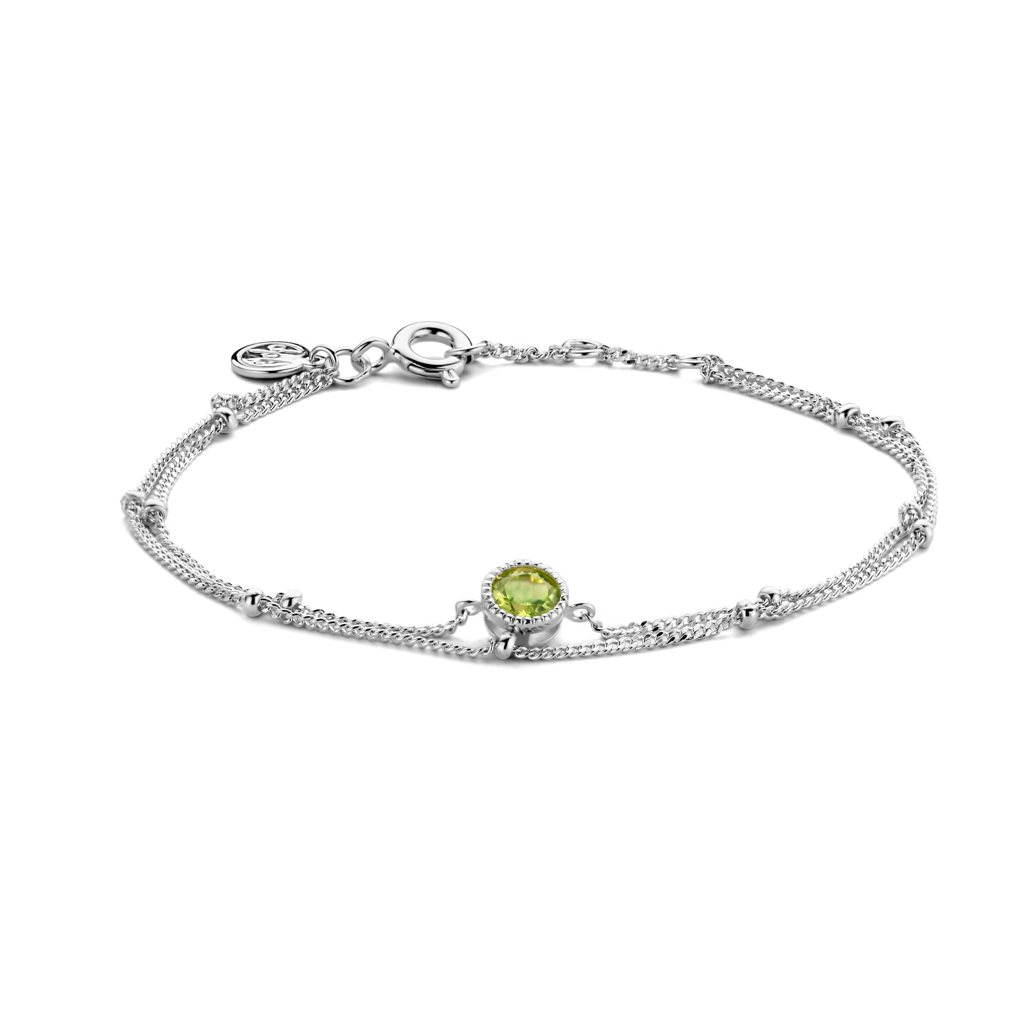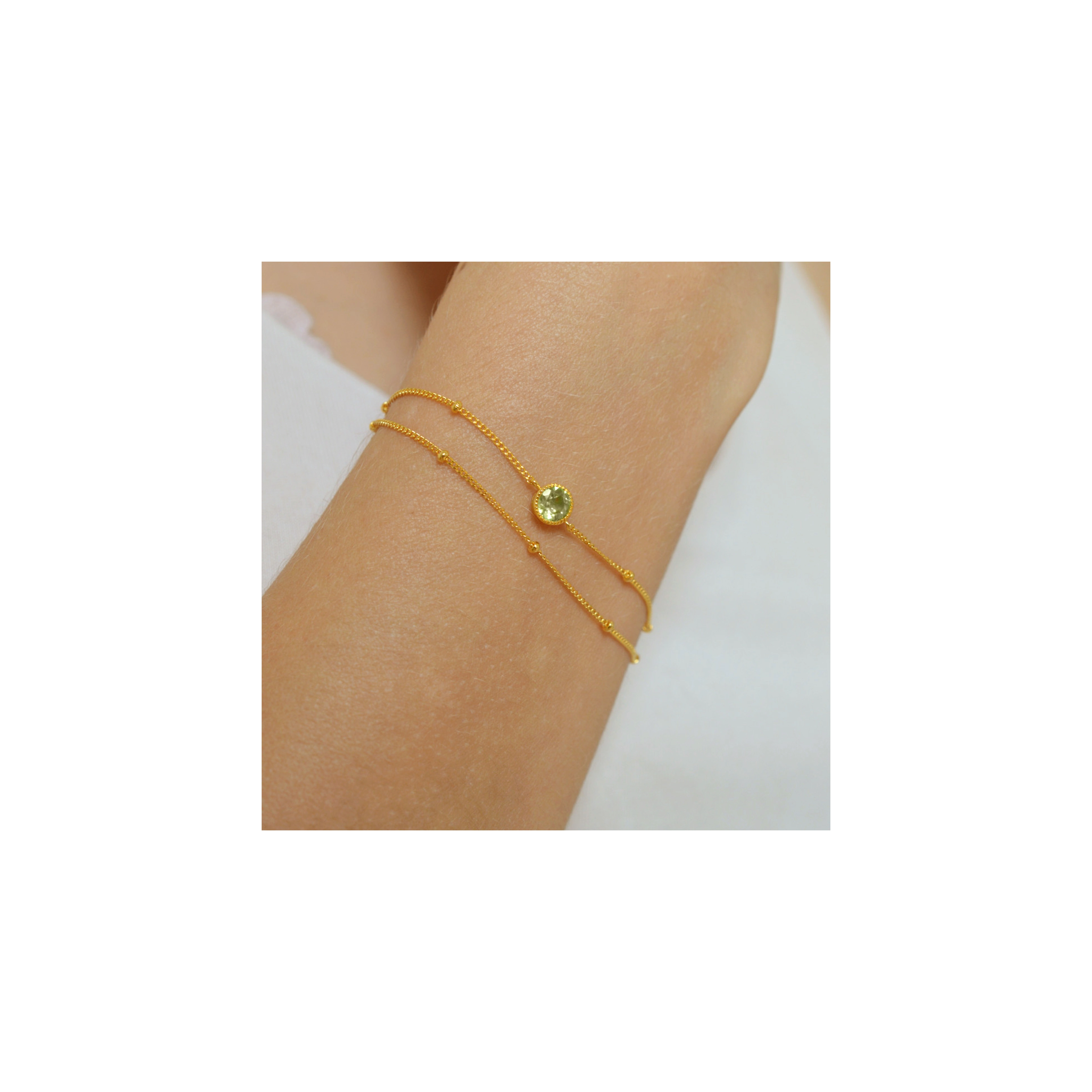 An invigorating green Peridot at the heart of our Blossom bracelet, featured in a milgrain setting and beads cable chain for a soft, cheerful and frisky look.