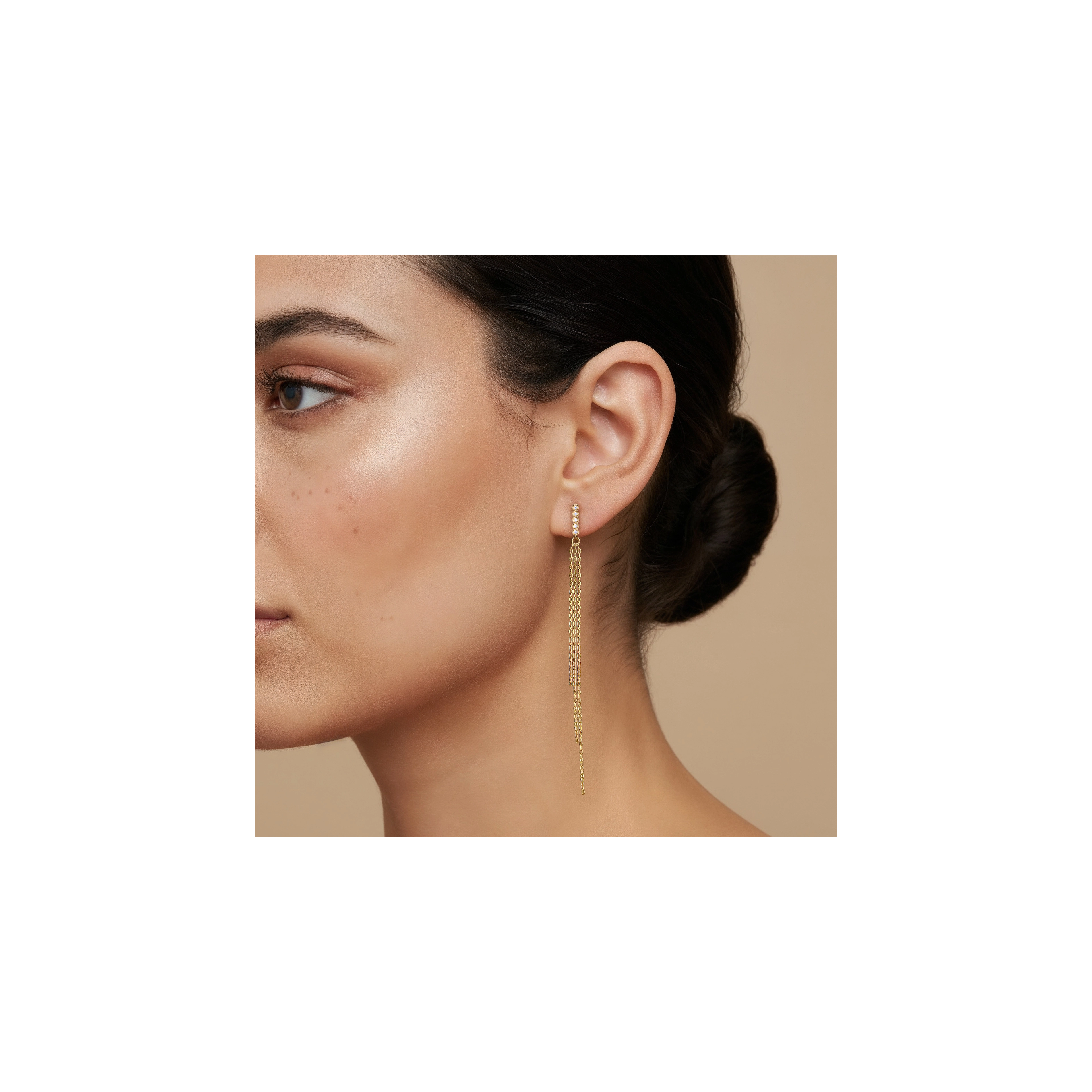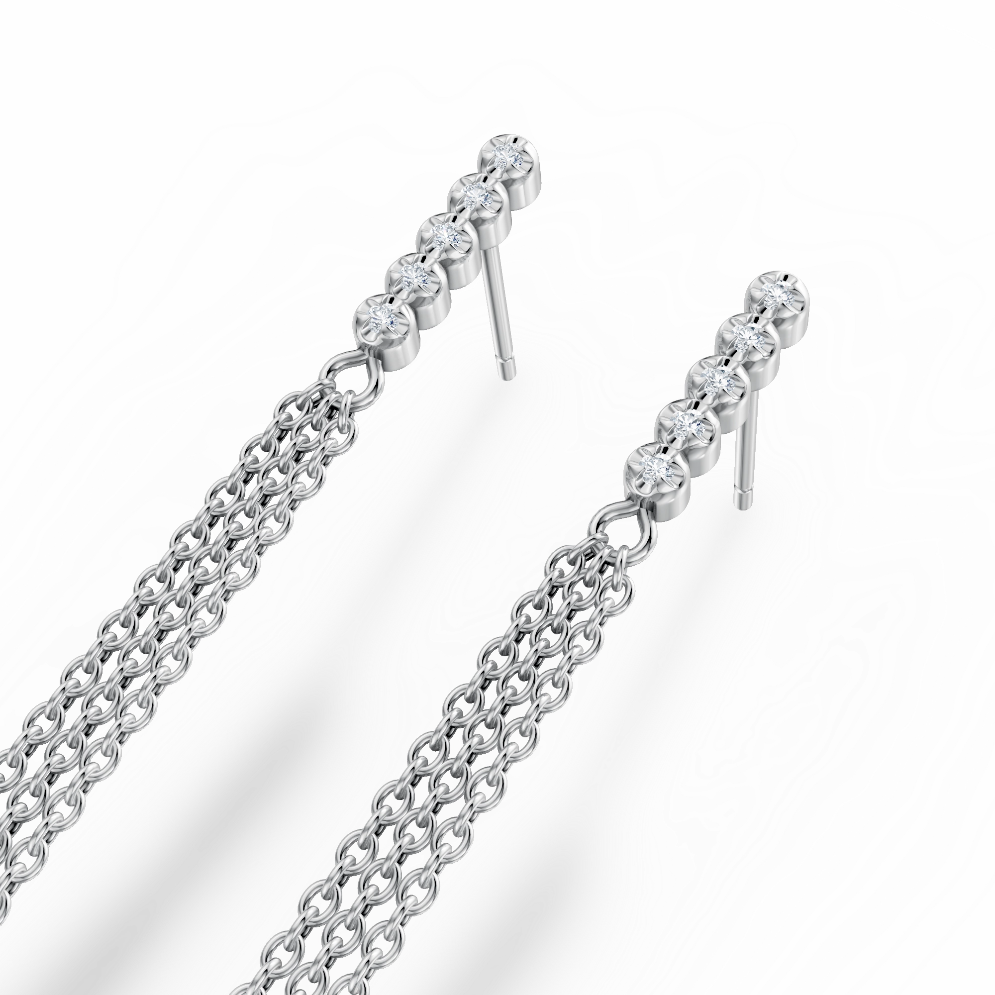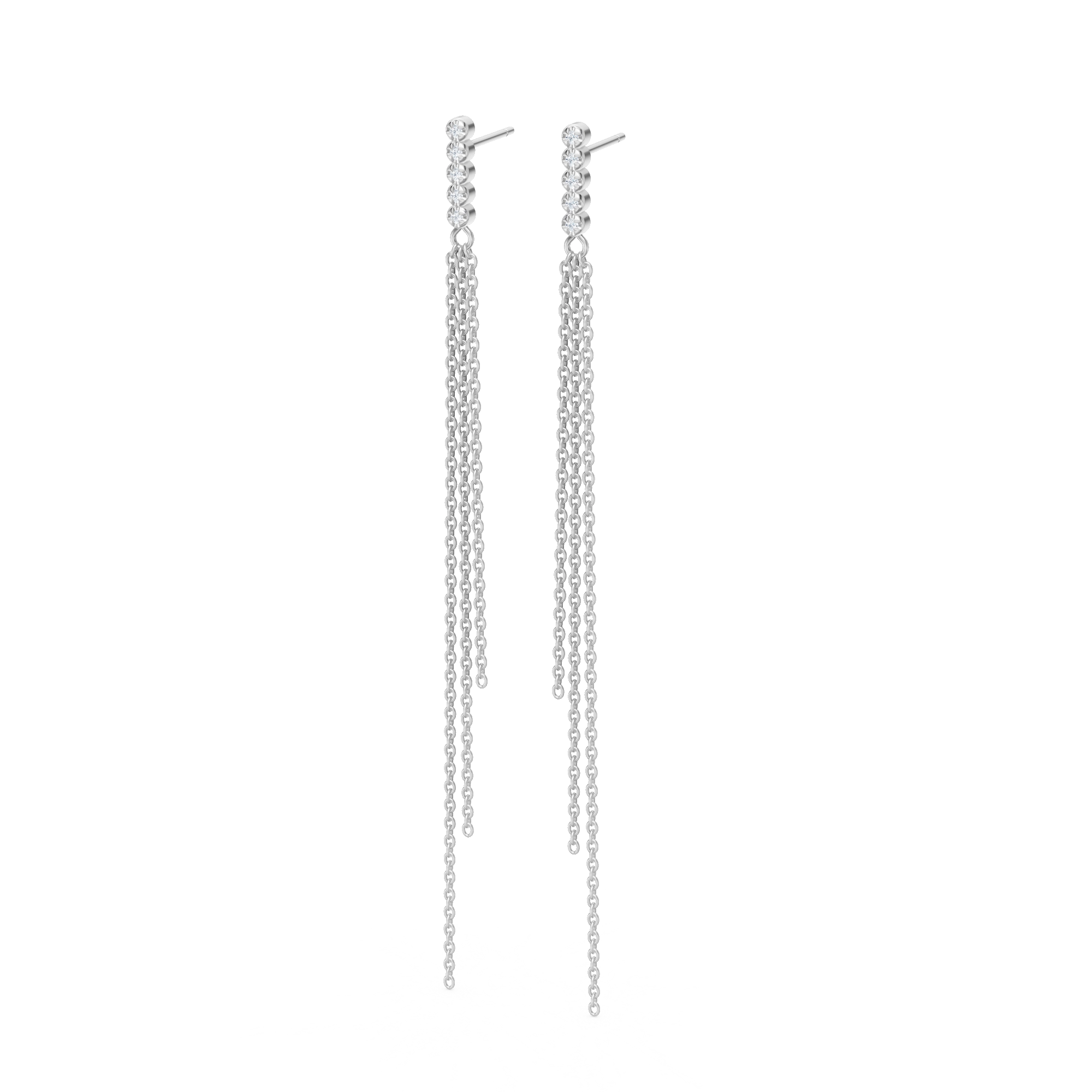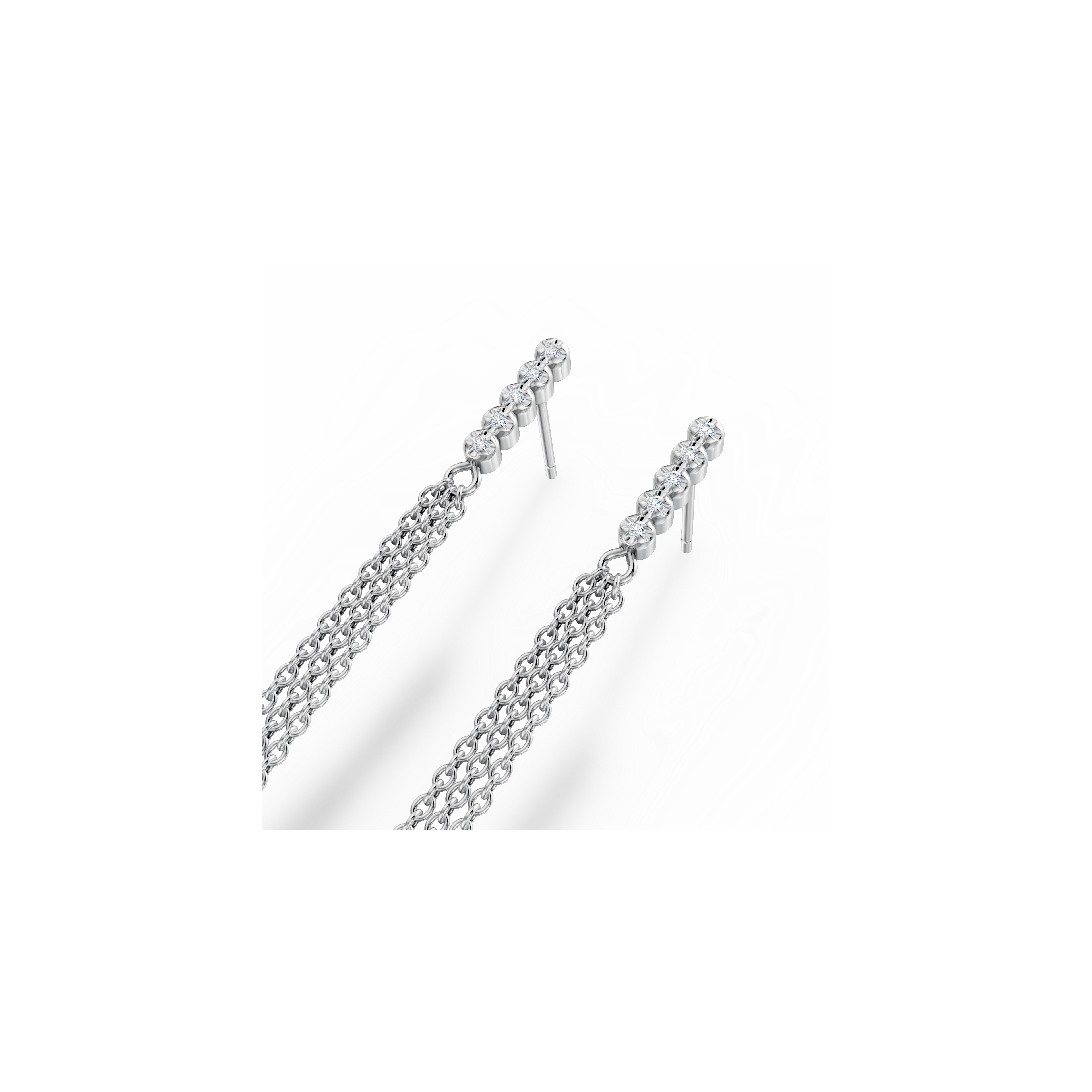 Striking the perfect balance of elegance and movement, these earrings feature a dotted line of 5x handset natural diamonds anchoring a trio of chains that dance in asymmetrical perfection. Their rhythmic sway echoes the structured beauty of a peacock’s layered feathers.
