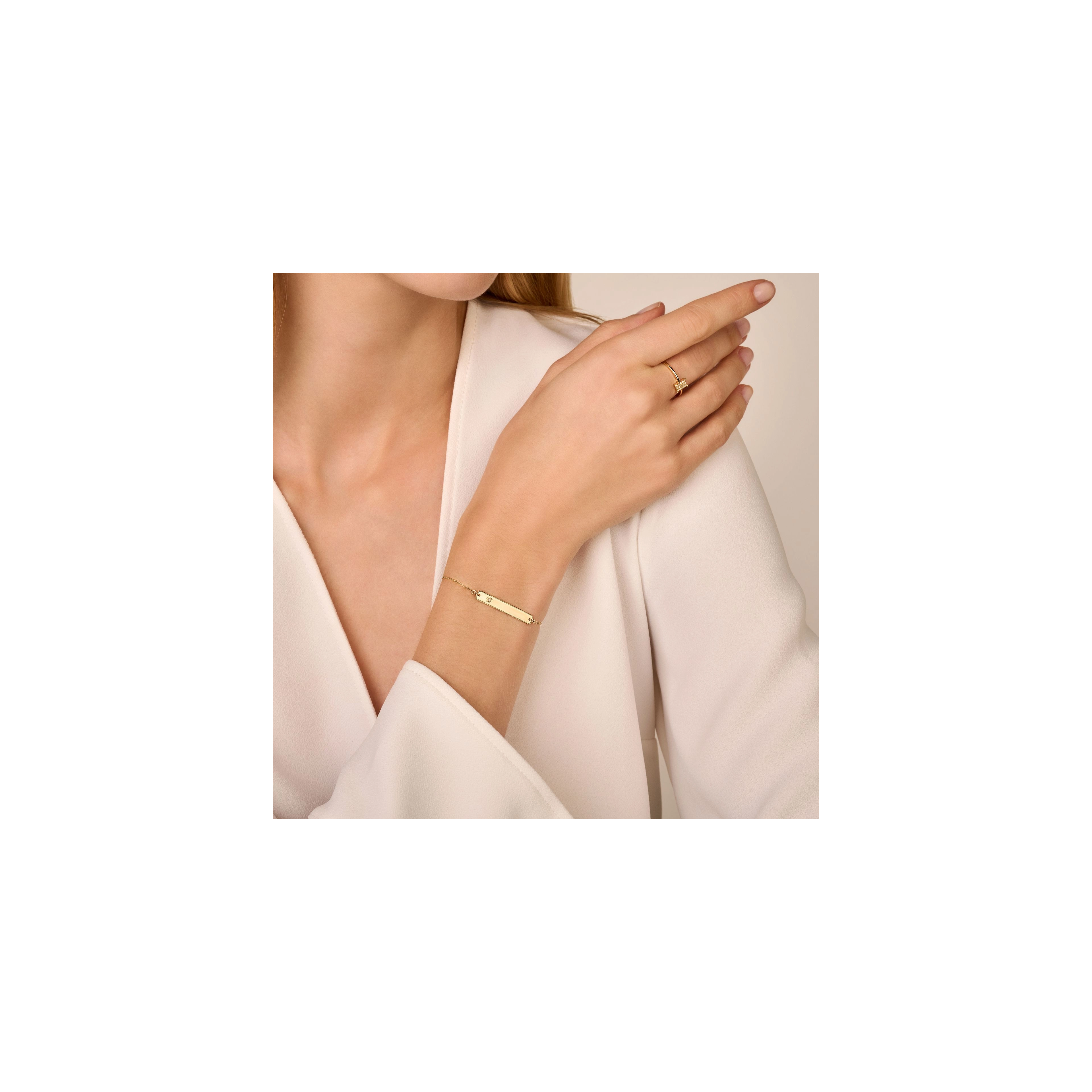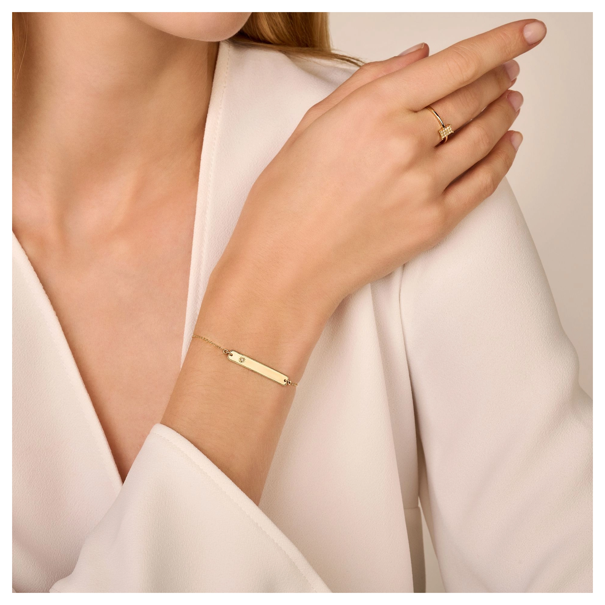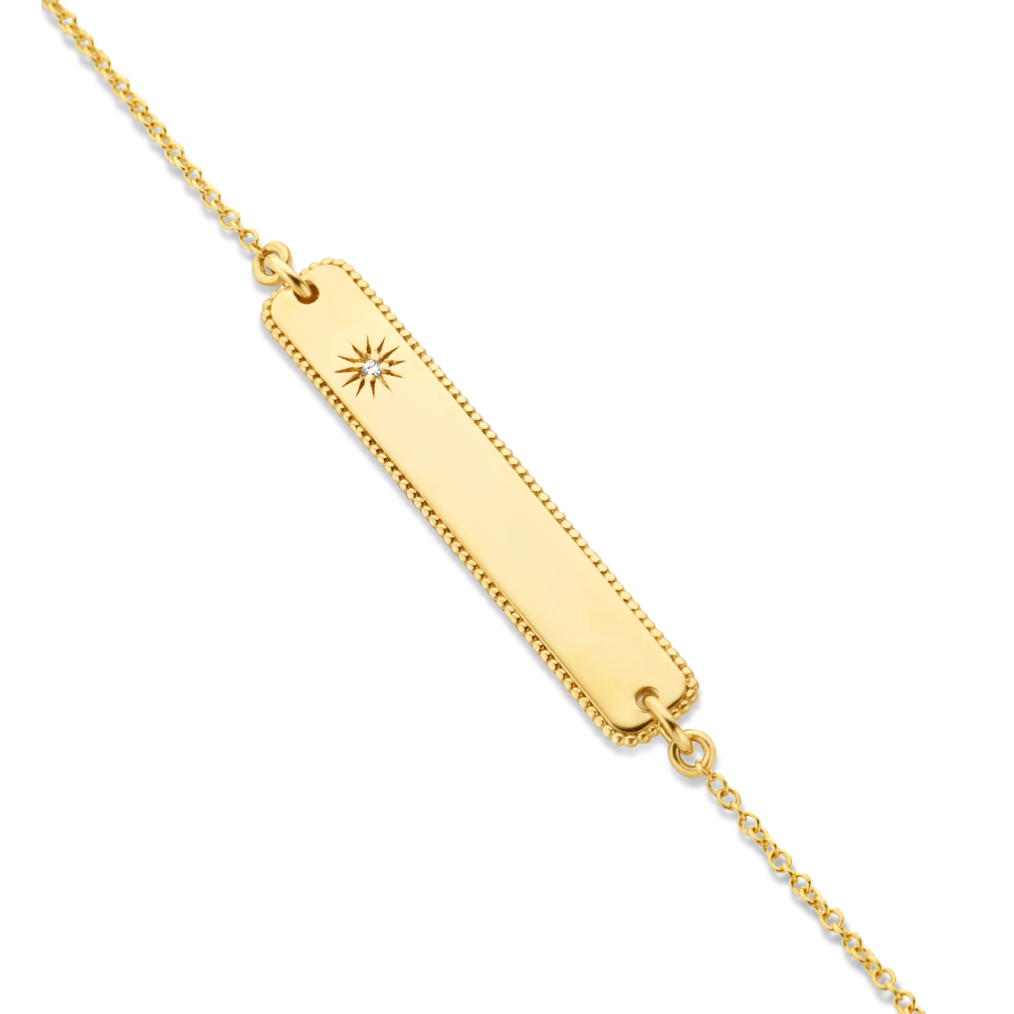 The ultimate engravable bar bracelet — the name of a loved one, a special date or place, your life motto, you name it. Topped off with a subtle shining star diamond, this meaningful piece will be cherished to infinity and beyond.» READ MORE on our engraving options.