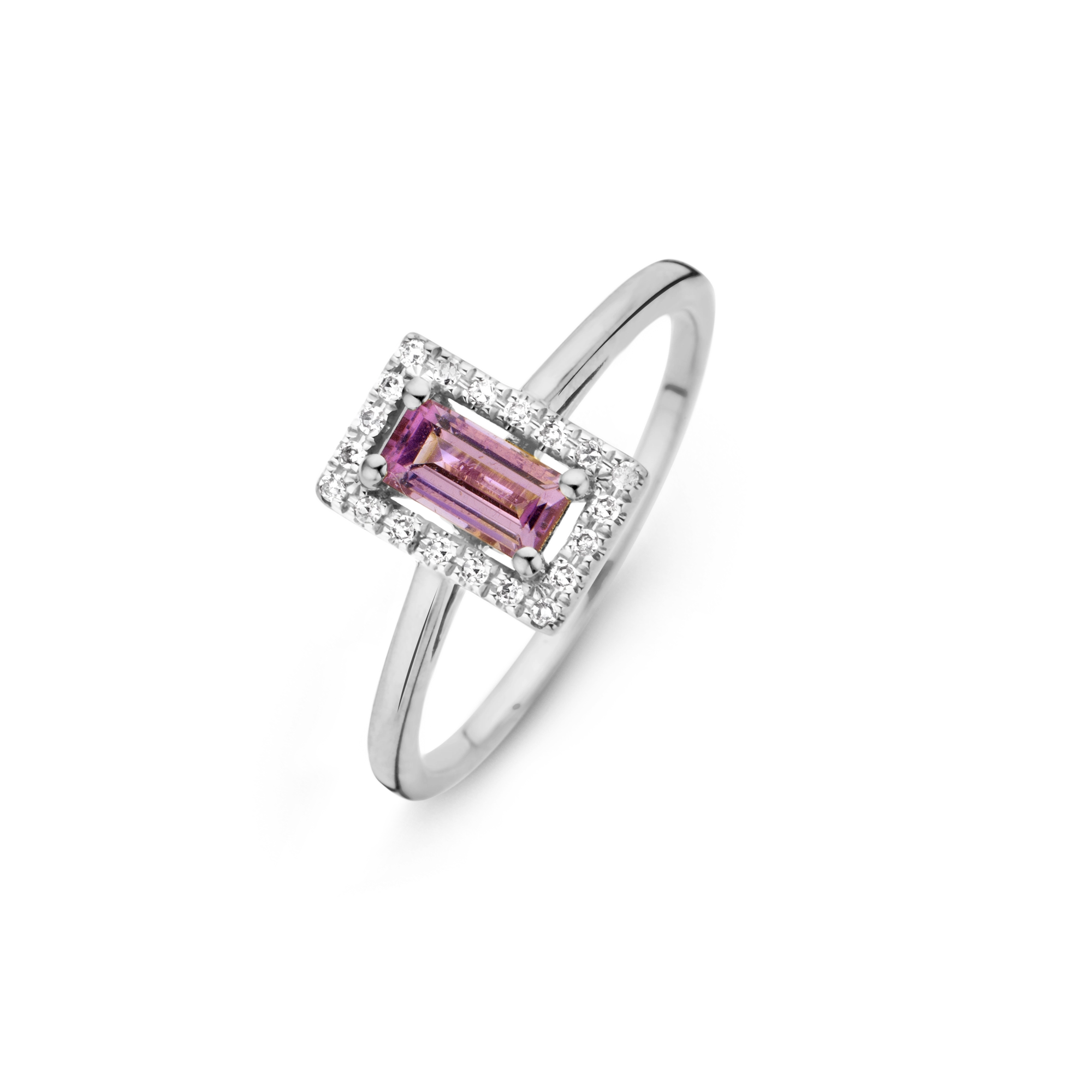 A striking pink Tourmaline adds a soft touch to this bold and ravishing 14 carat gold design. Defining pure beauty as 20x white diamonds catch the playful light of day.