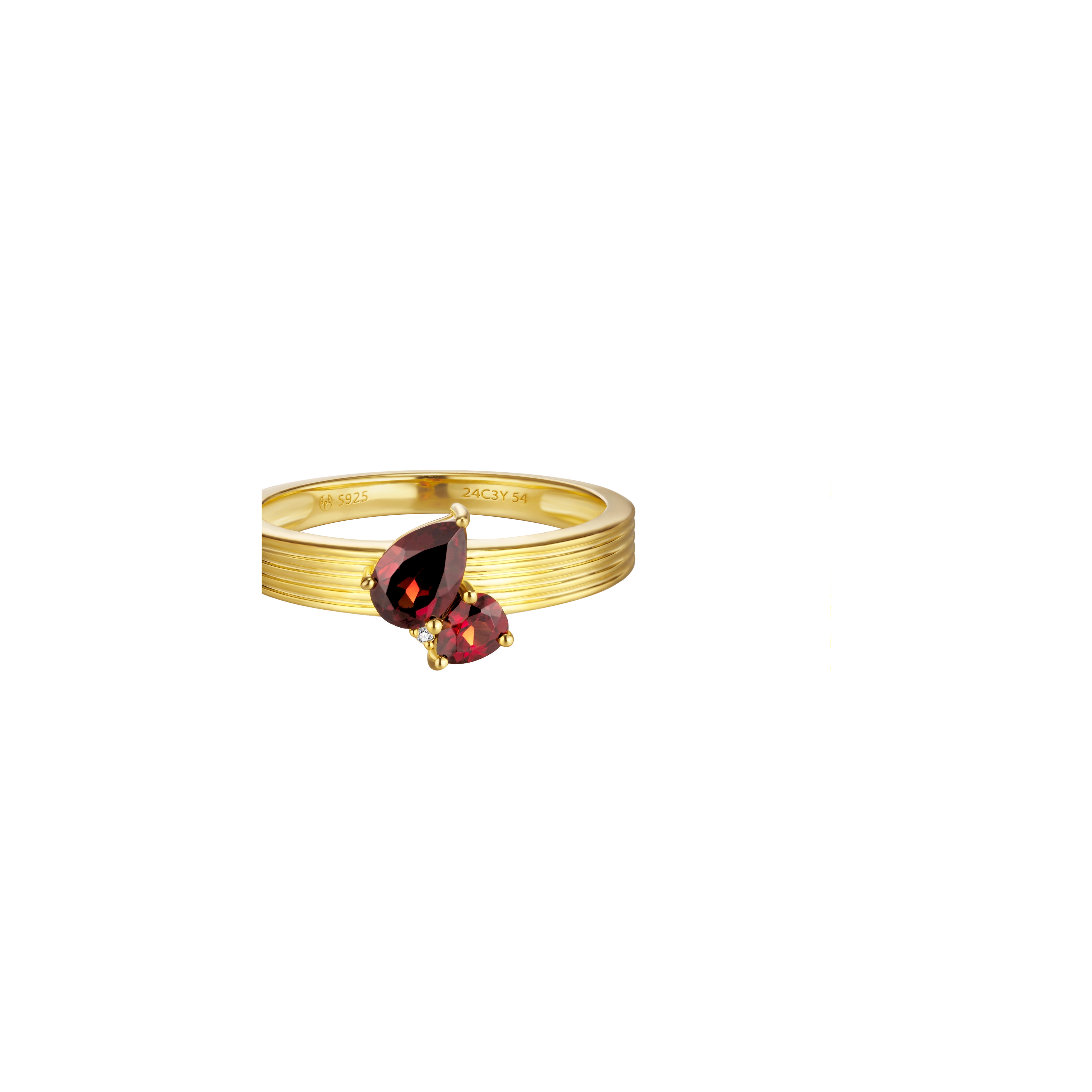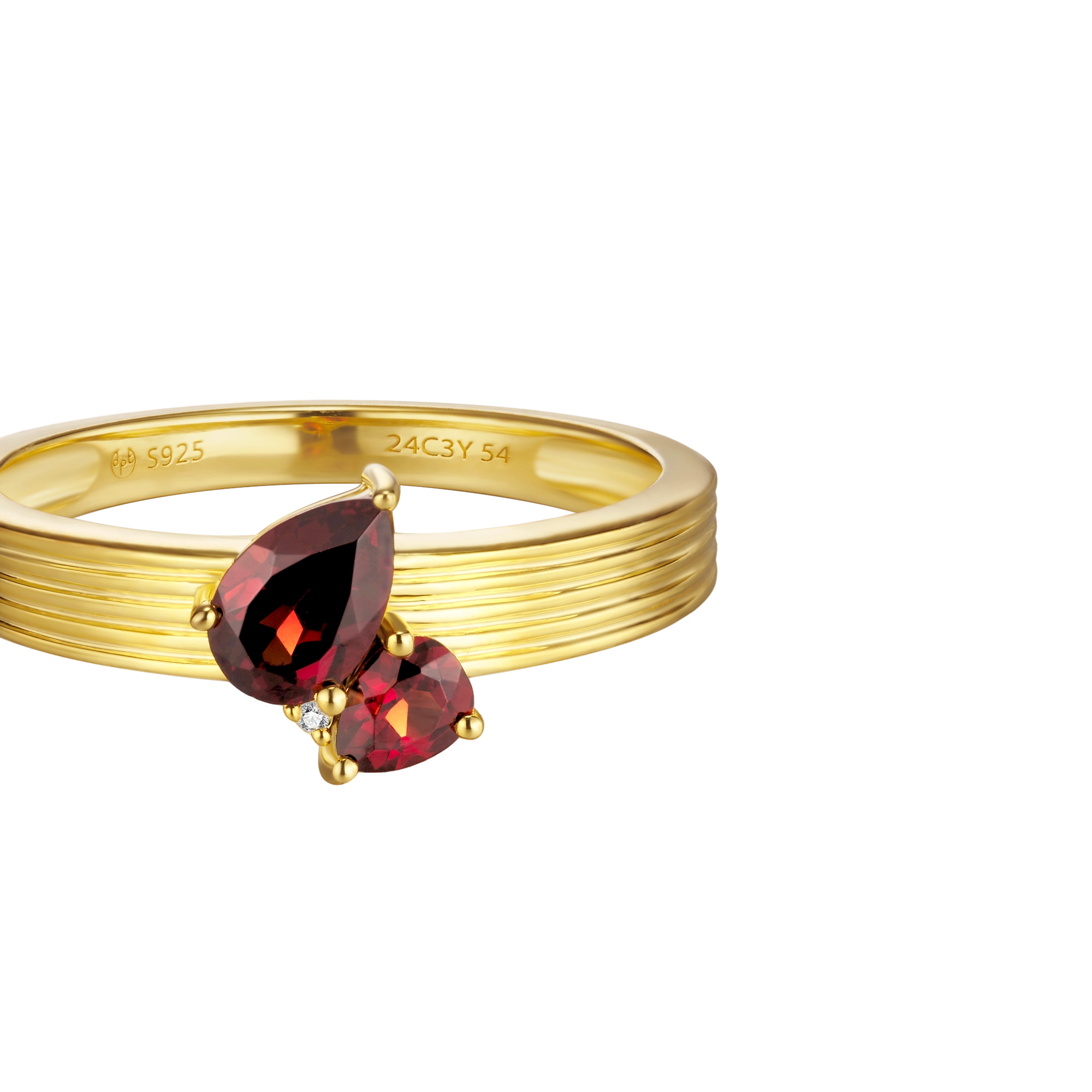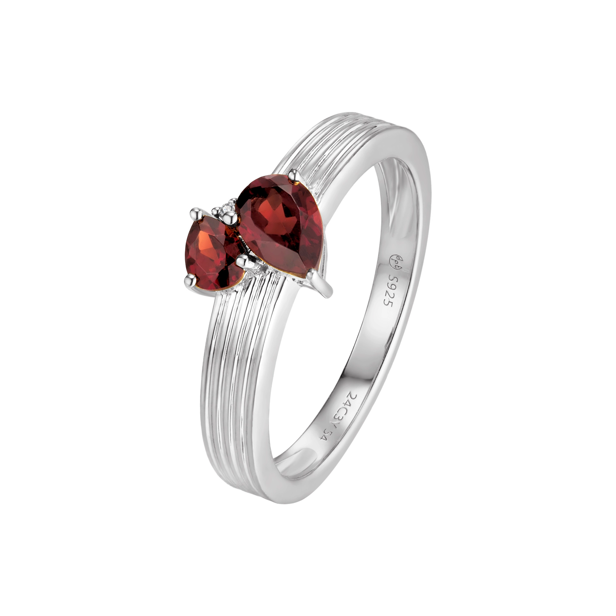Starring 2x pear-cut red Garnet gemstones, beautifully connected by a sparkling white diamond, handset on a delicately engraved shank – this ring radiates an air of classic refinement. Let the rich hues of the red Garnet and the brilliance of white diamonds brighten everyday life into your glory days.