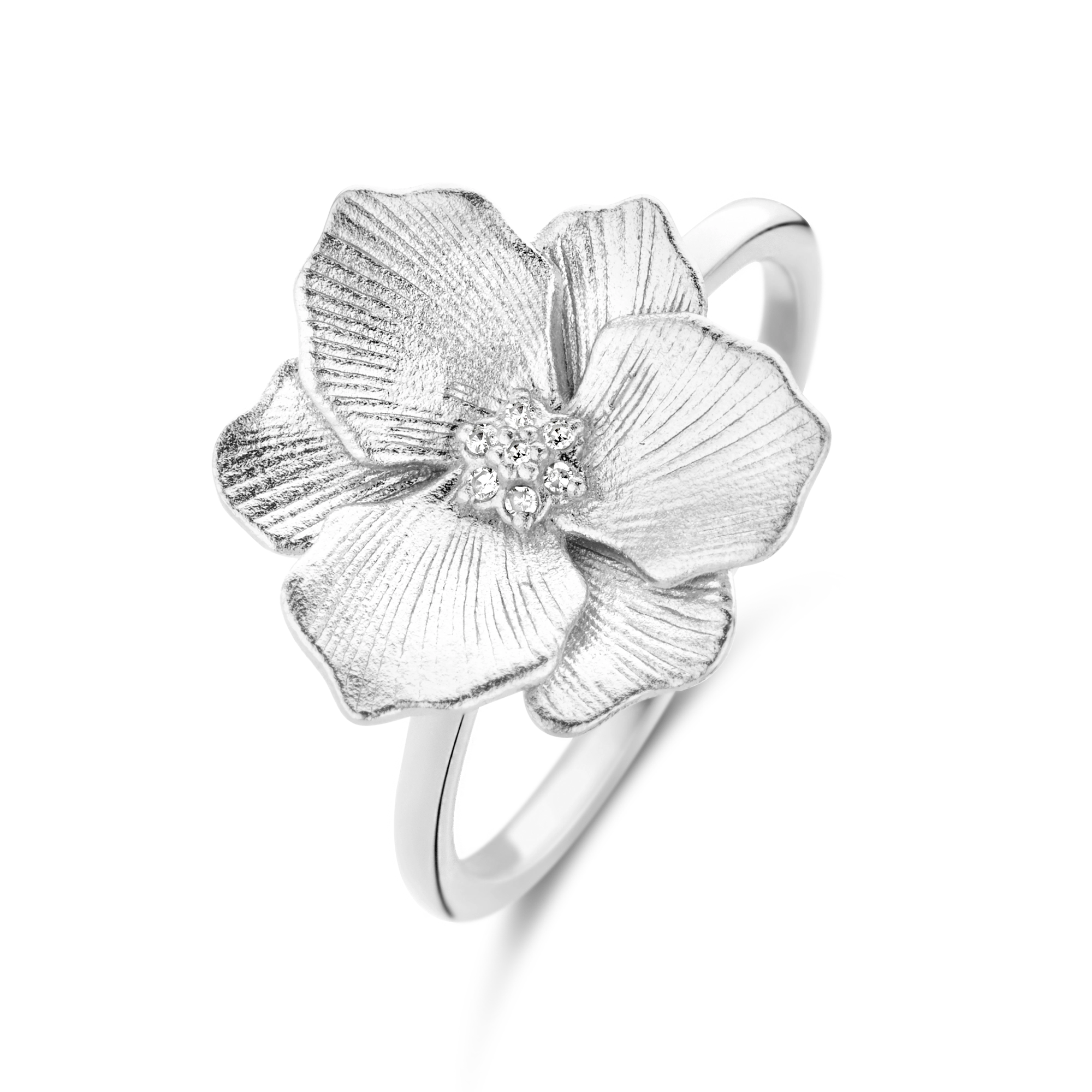 <p>A delicately detailed and engraved Jasmine flower, with a brightly gleaming diamond heart, handset in a rustic brushed finish. Whatever the season, this floral ring will spark an immediate burst of springtime happiness.</p>