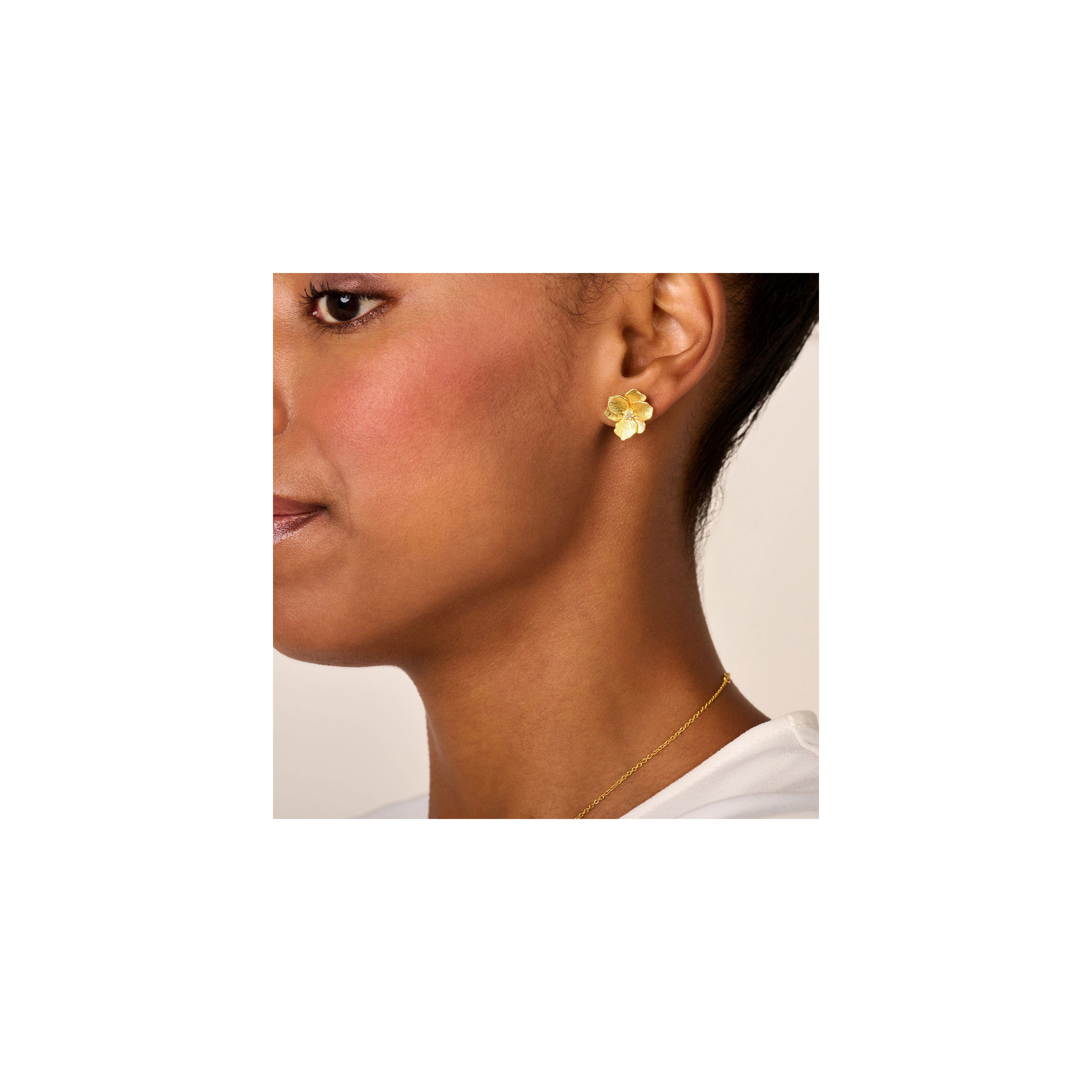 A delicately detailed and engraved Jasmine flower, with a brightly gleaming diamond heart, handset in a rustic brushed finish. Whatever the season, this single stud will spark an immediate burst of springtime happiness.P.S.: This stud also comes in a larger edition for a more outgoing look or to play with a variety of sizes, whatever tickles your pickle.