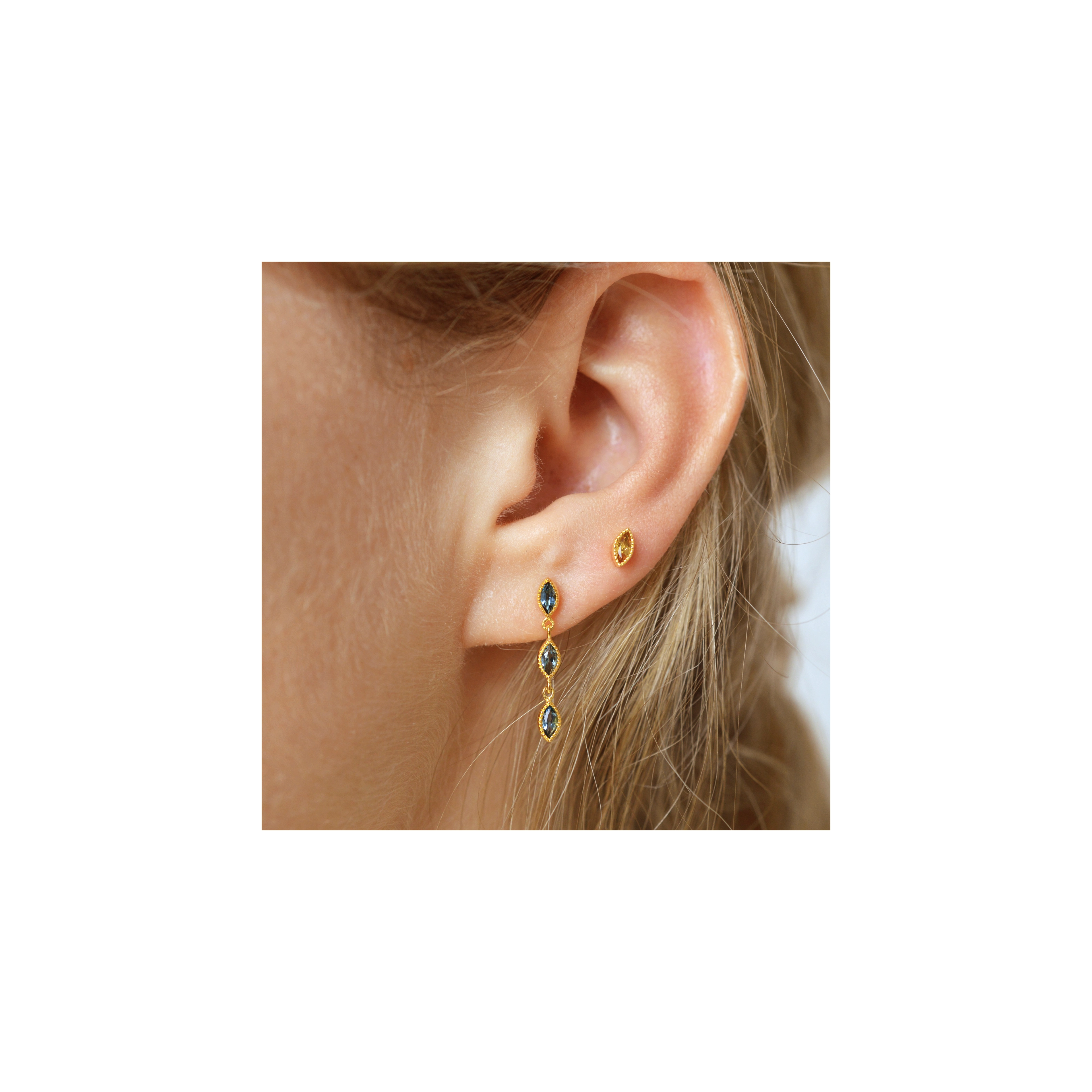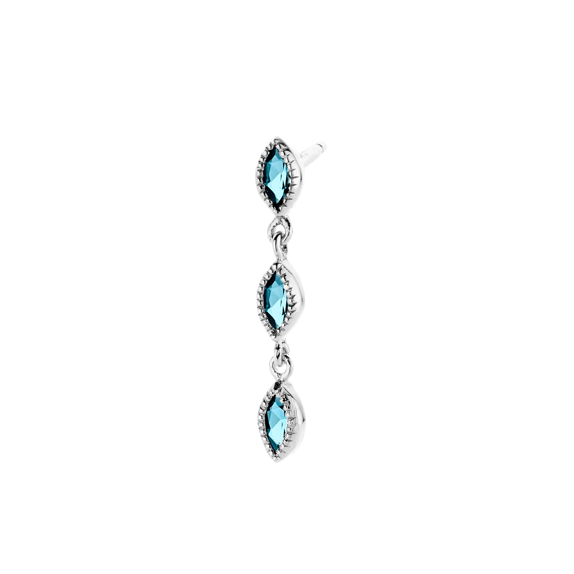 A trio of marquise-shaped London blue Topazes in a dreamy milgrain setting, like shimmering dew drops in fields of gold.