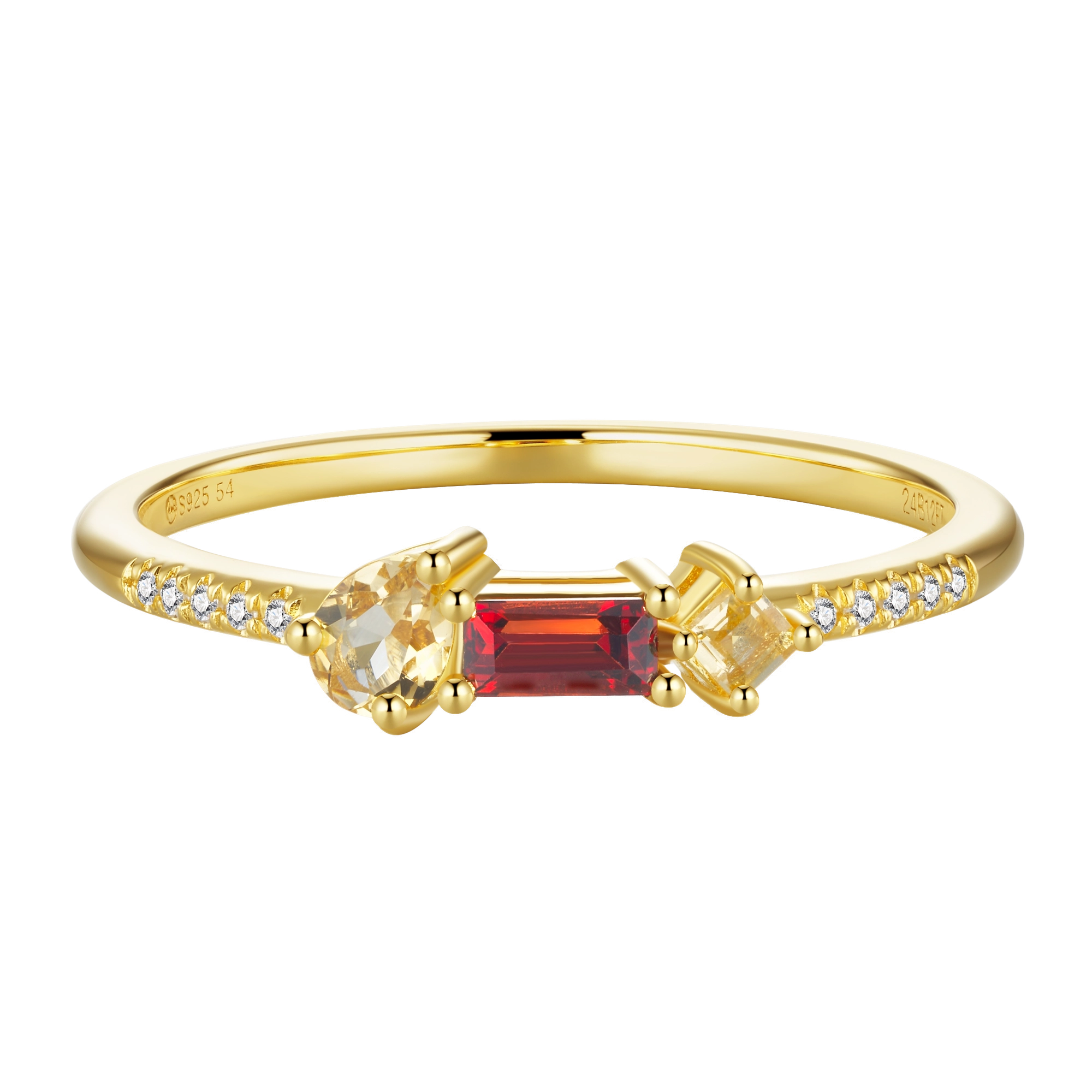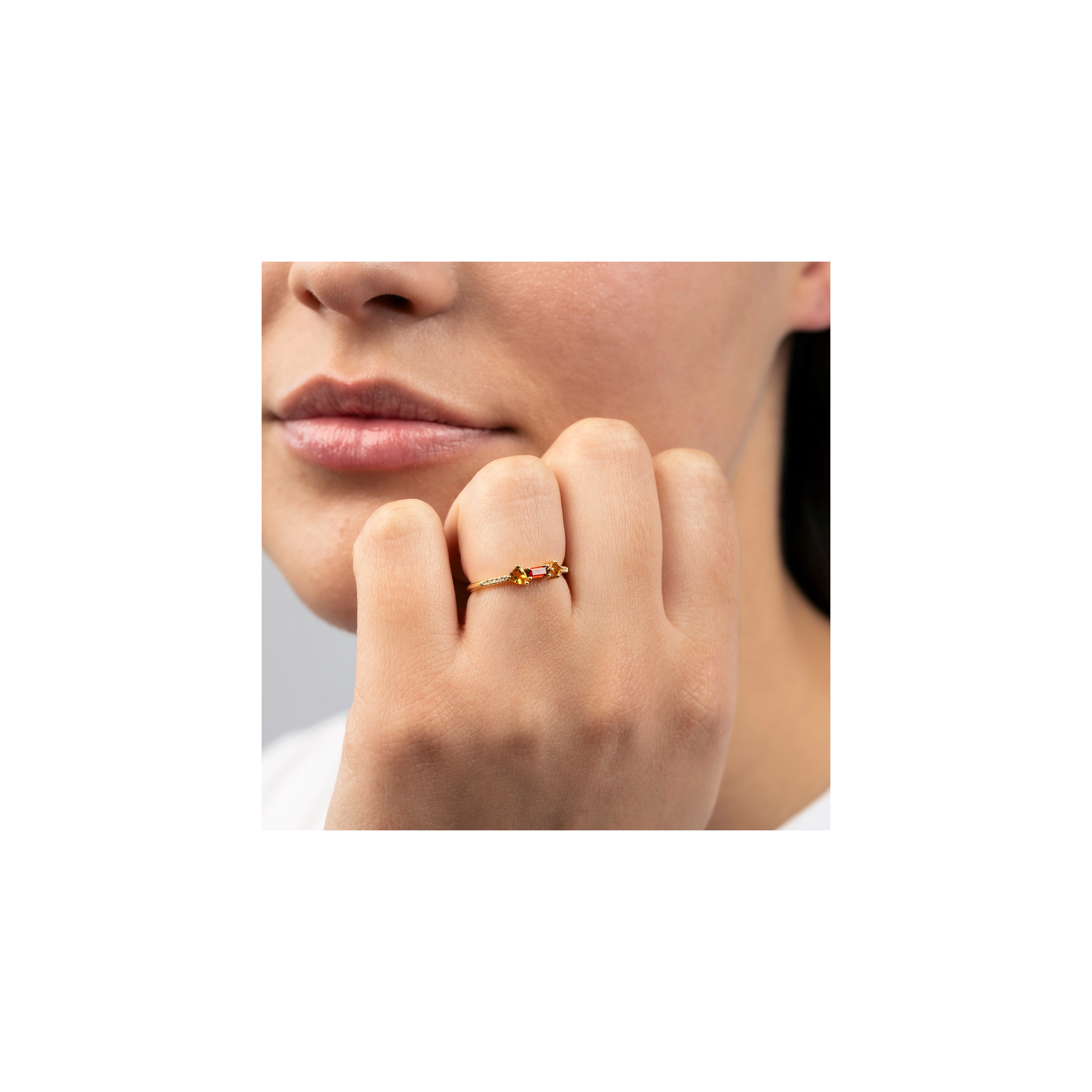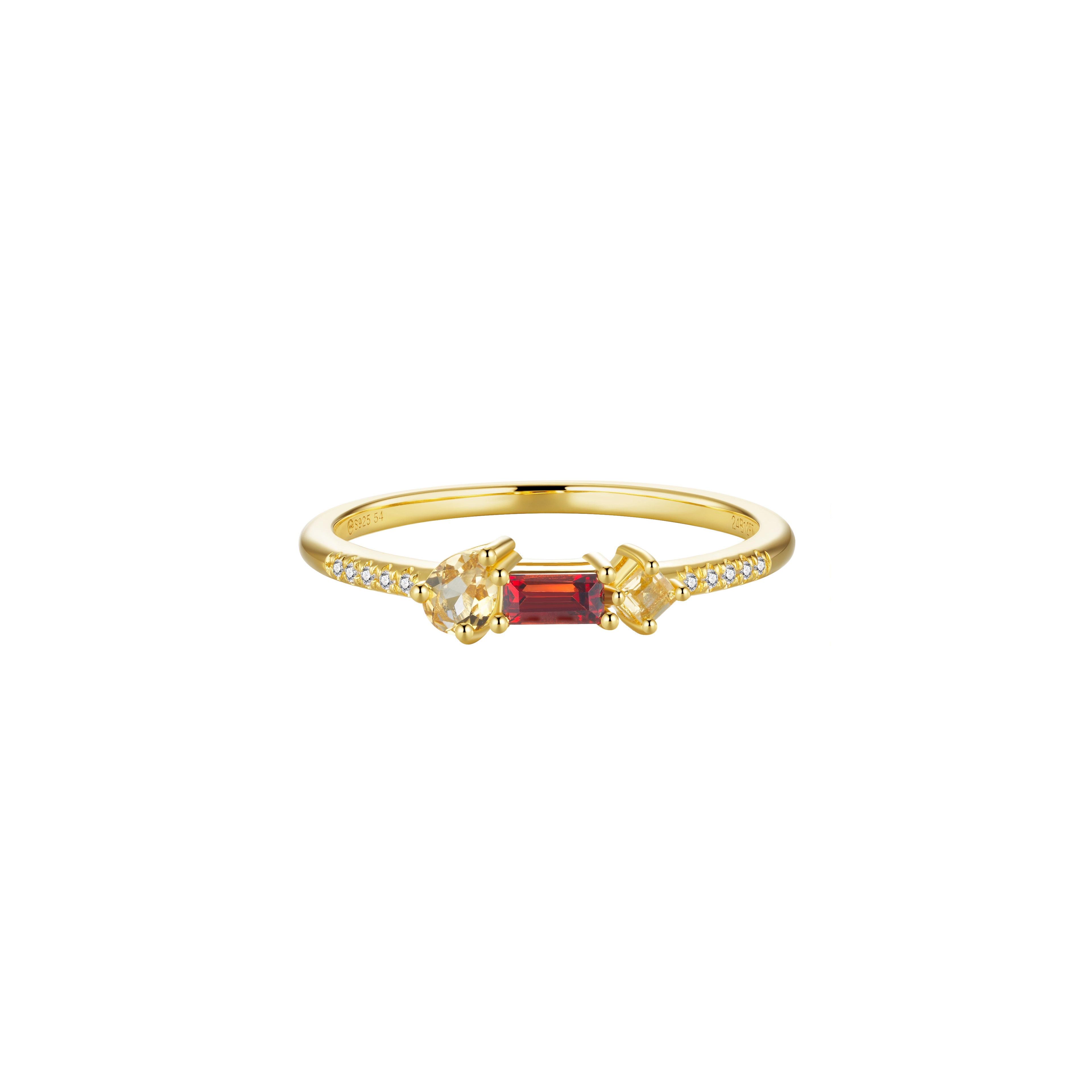 Featuring a smoldering cluster of garnet and citrine gemstones in a playful variety of cuts — handset on a diamond (10x) band, this design captures the glowing intensity of a crackling flame. With its radiant hues and fierce sparkle, it truly is the ring of fire.
