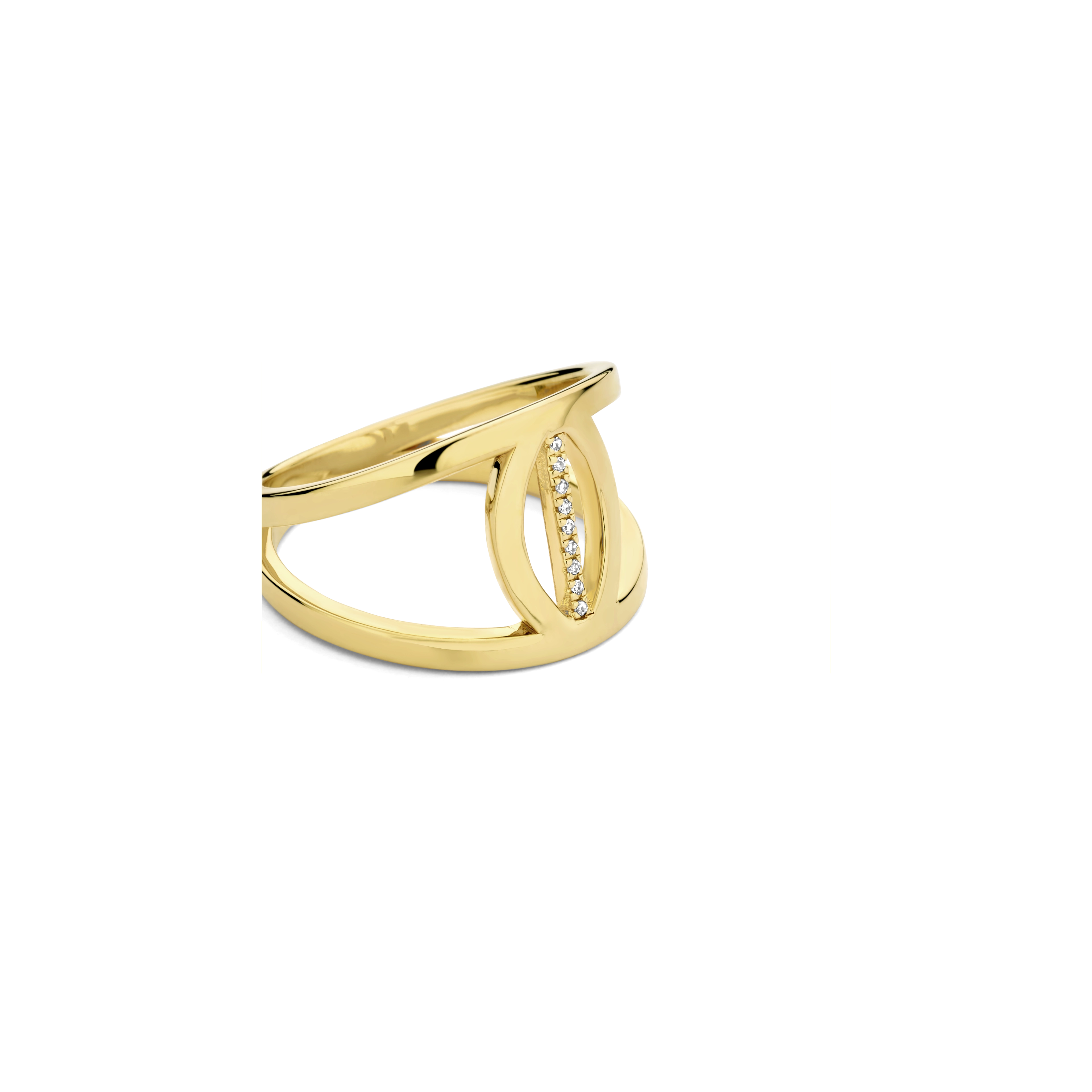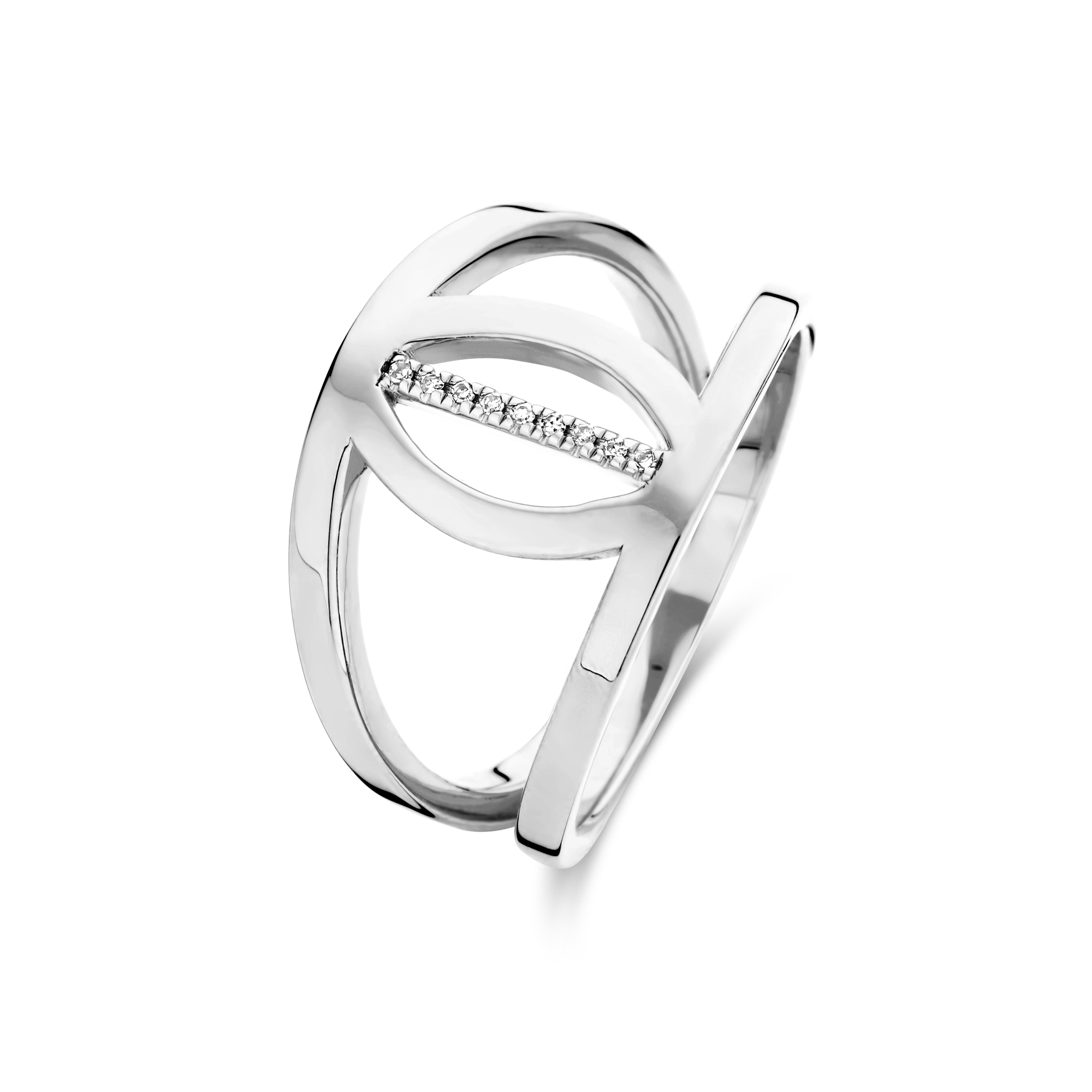 A curved cut-out style shank with a contrasting straight centerpiece, handset with 9x illuminating diamonds. It’s a modern statement piece to get in a mad dash about.
