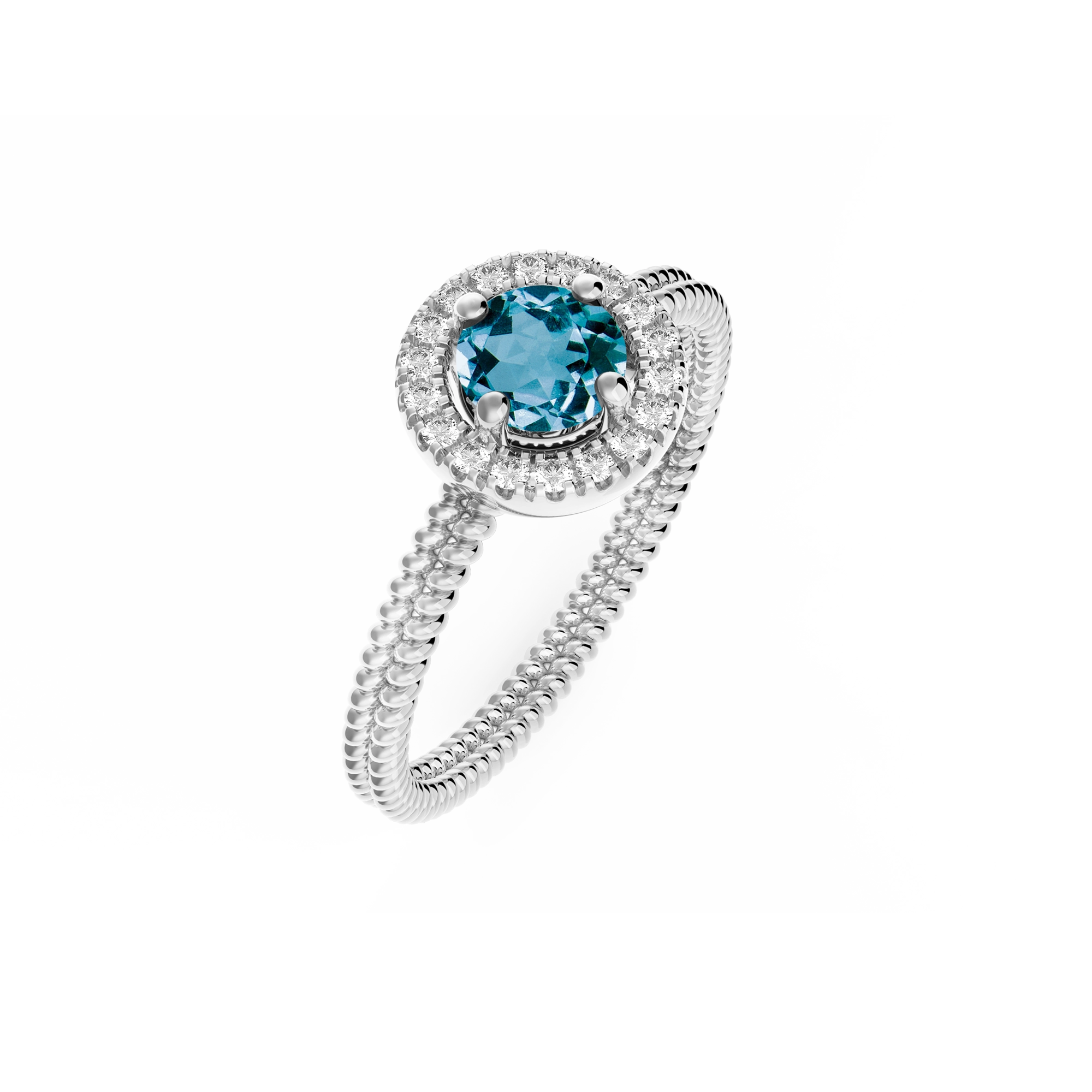 Named after Aurora, the goddess of dawn in Roman mythology - this exquisite diamond ring features an eye-catching round London blue Topaz, paved with 18x white diamonds. A true definition of beauty and brightness.