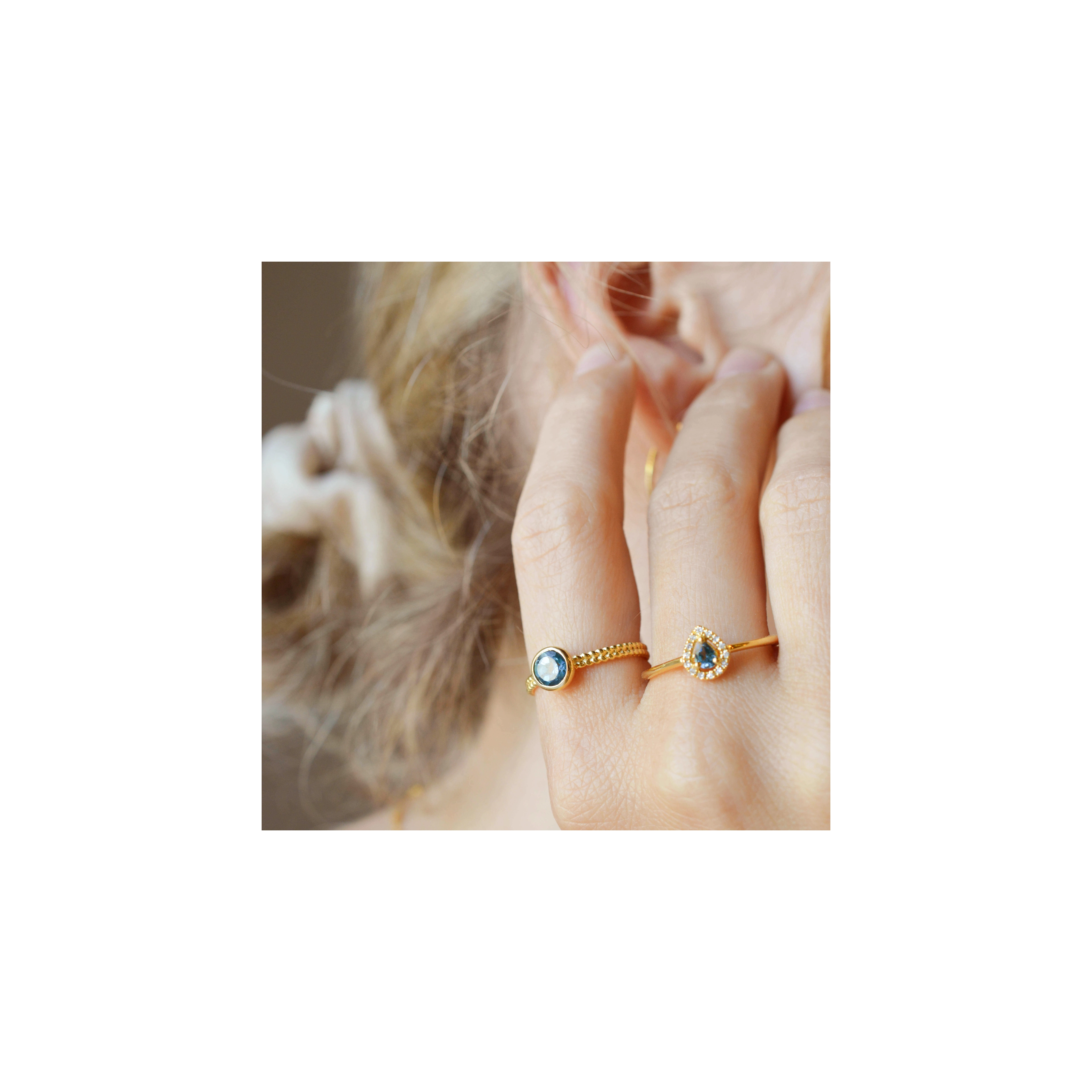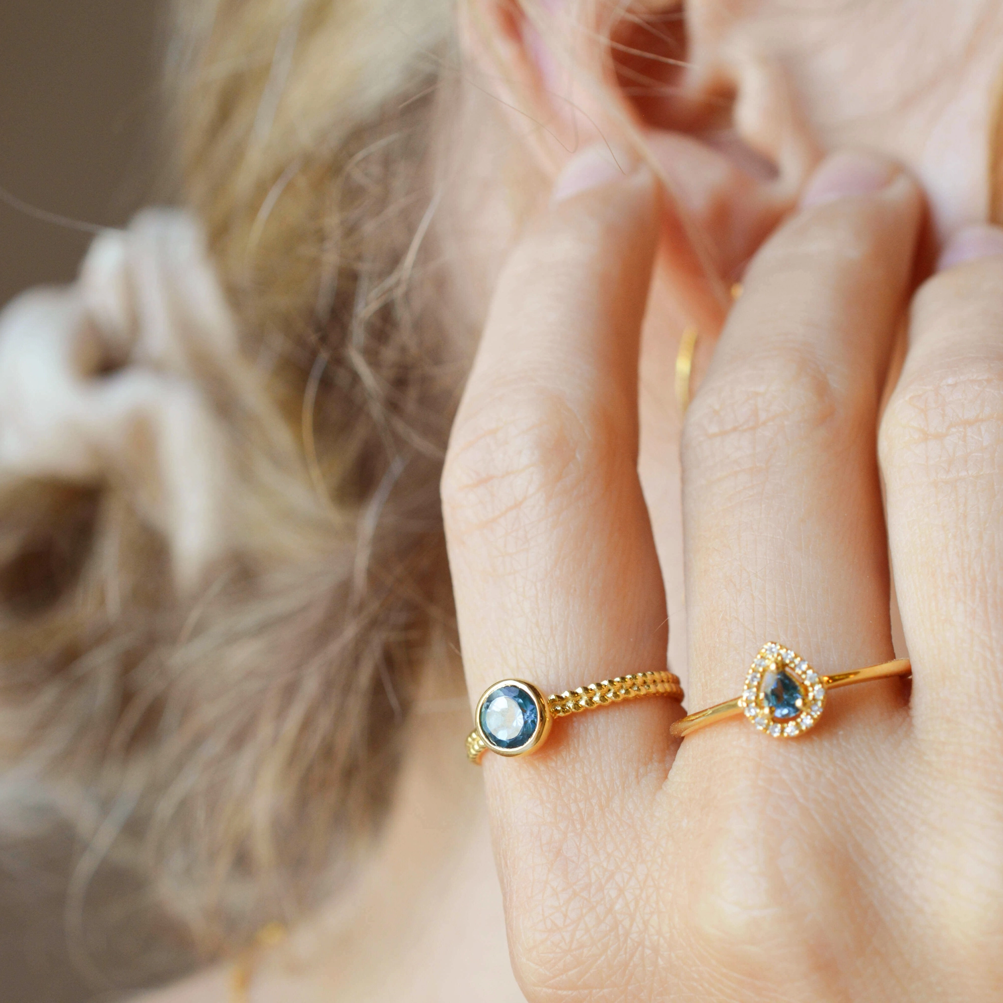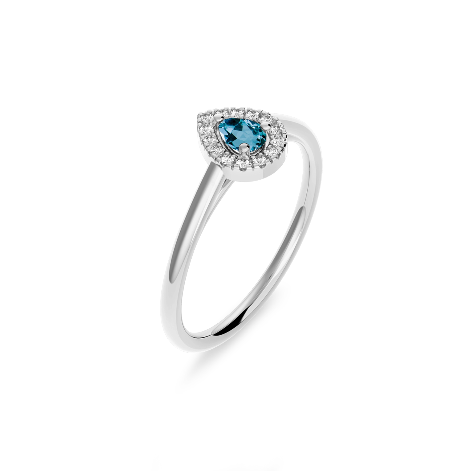 A striking pear-shaped London blue Topaz at the heart of our Drip ring, surrounded by 14x white diamonds, sparkling like shimmering dew drops.
