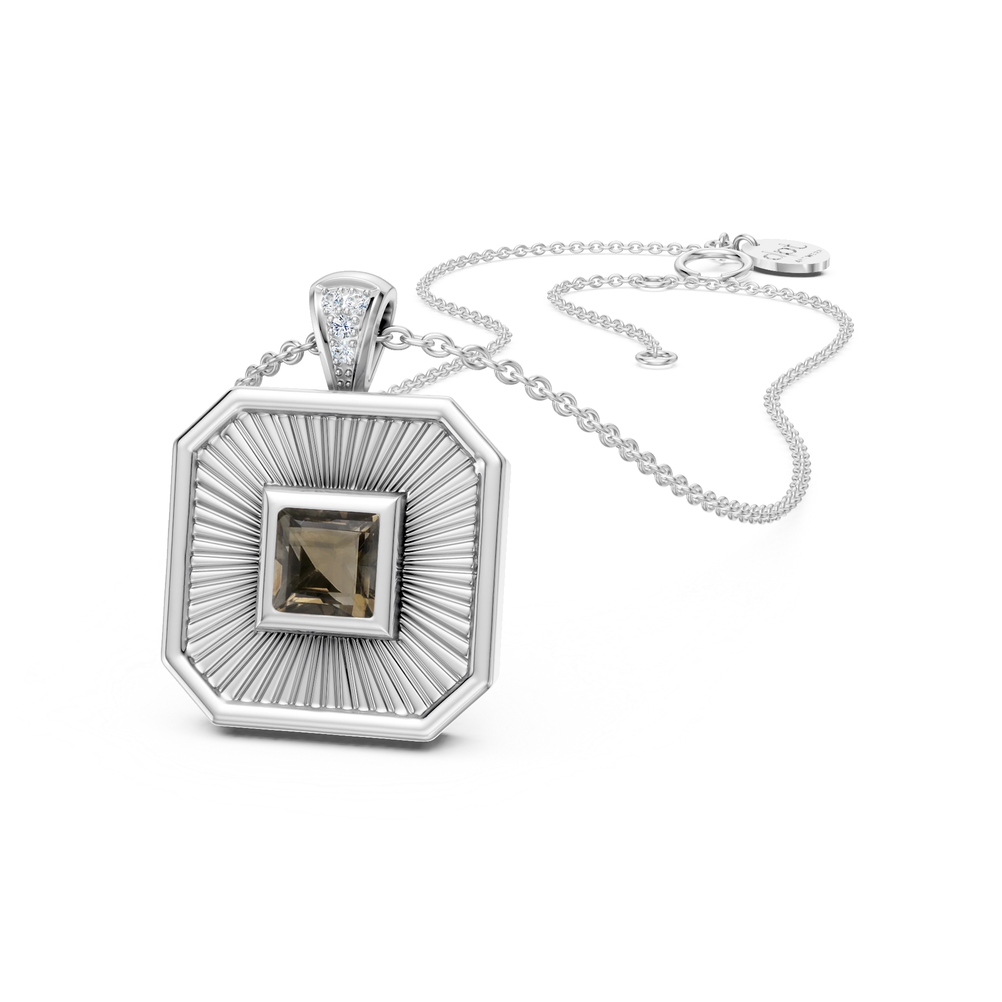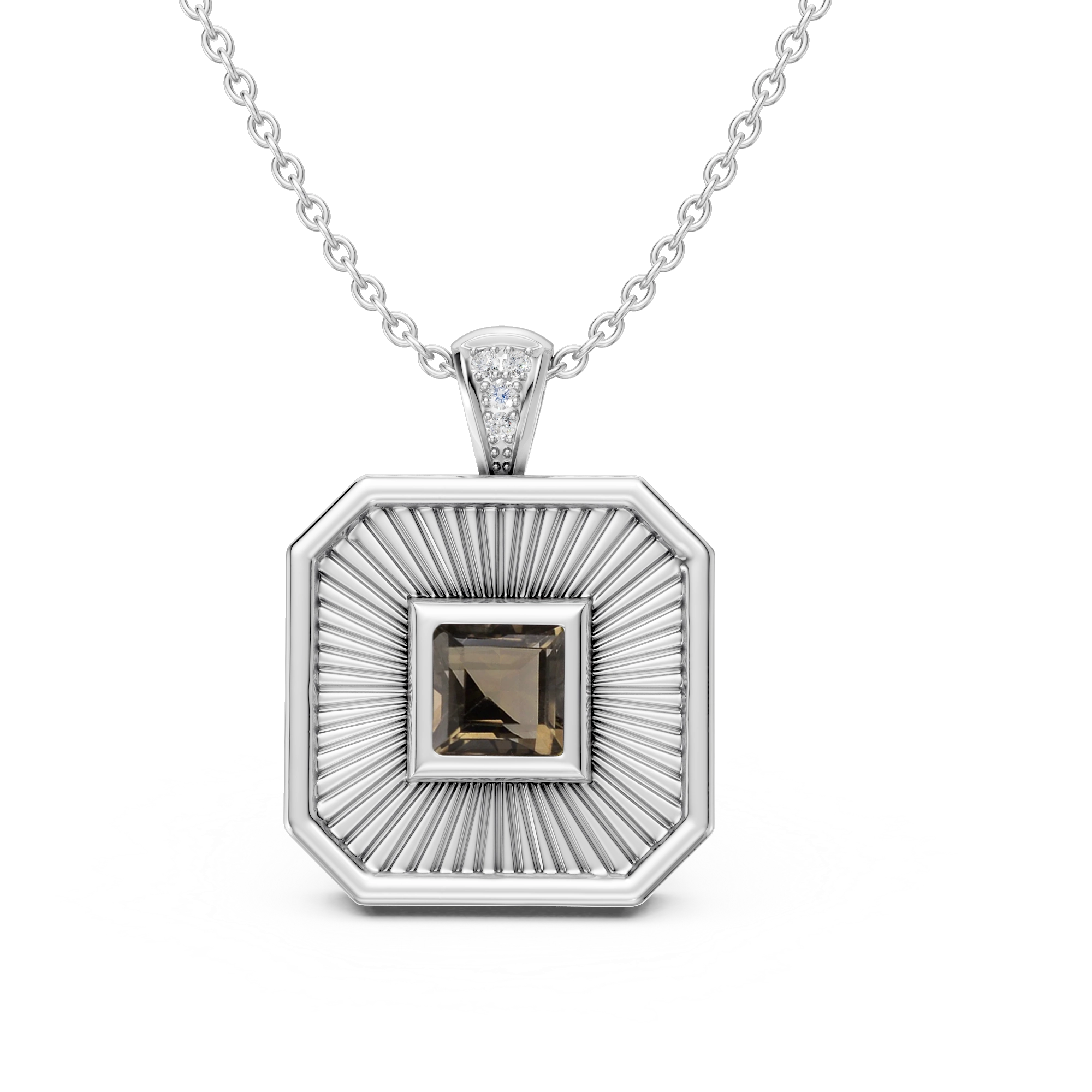 Striking yet timeless, this necklace features an octagonal amulet engraved with a radiating burst pattern that hints to vintage treasures. A square-cut smokey quartz glows at the center, framed by 3x natural diamonds set into the connector. A modern heirloom as your statement of fierce and grounded grace.