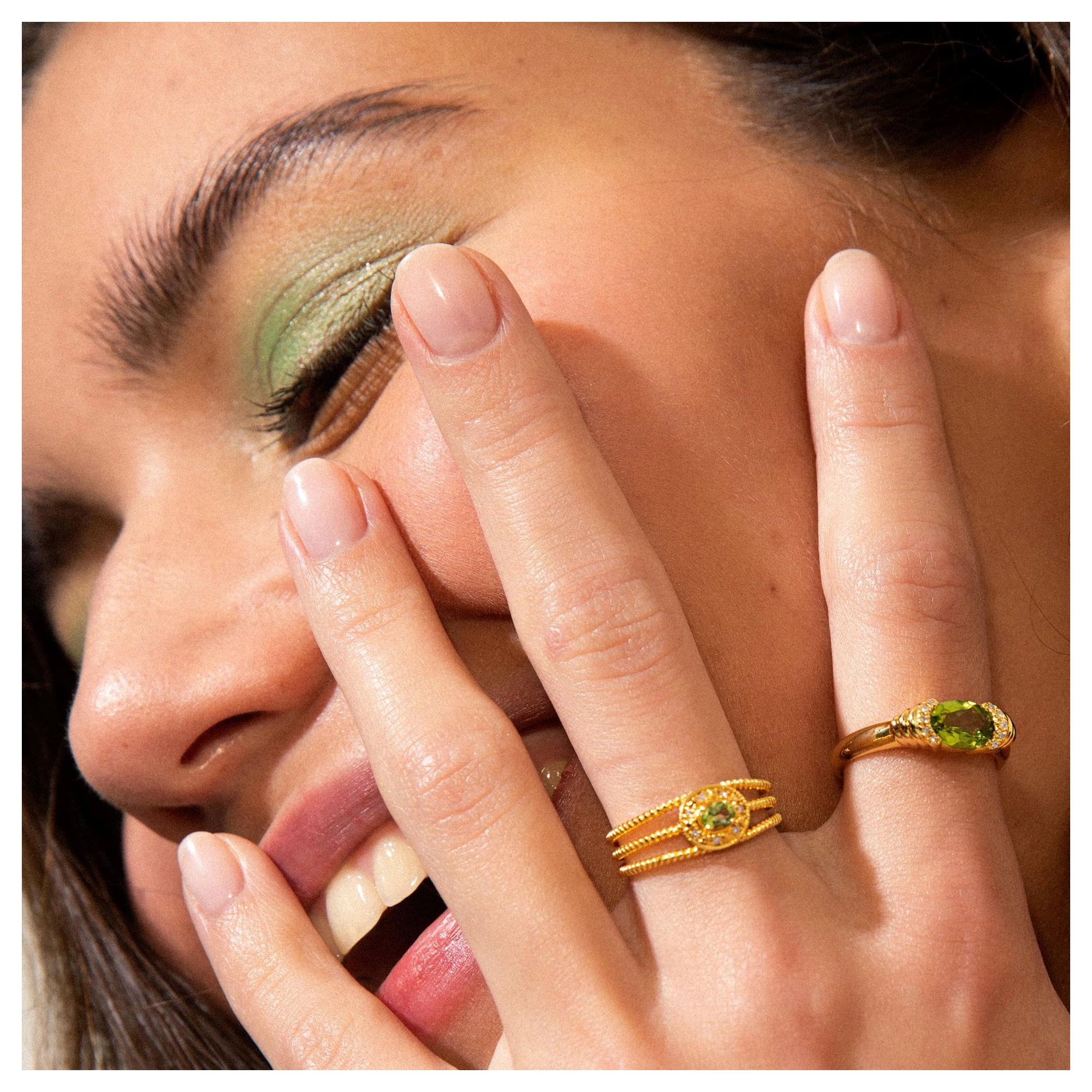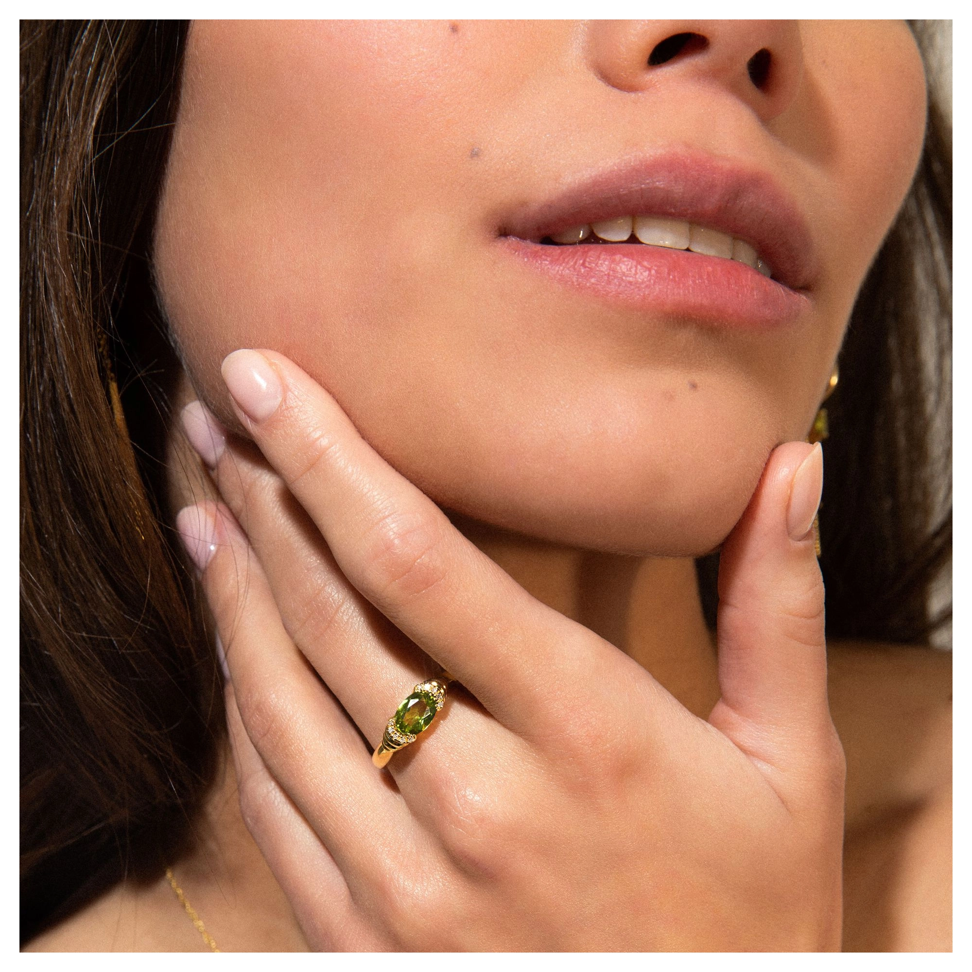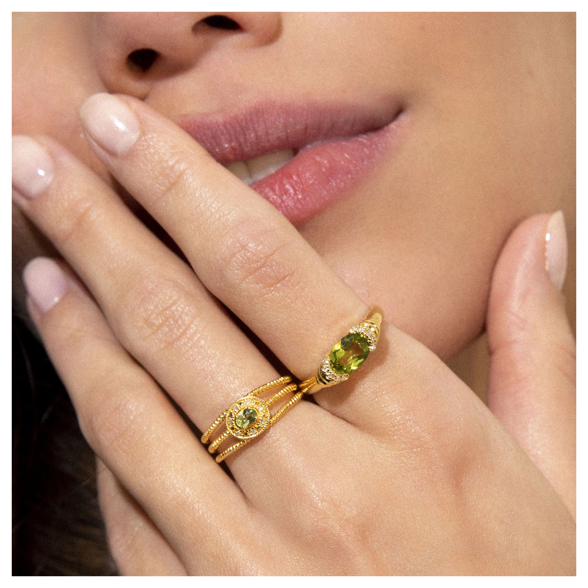 The soft shade of green and layered levels, we love to see in lush greenery landscapes and pistachio gelato. This statement ring with aperidot centre stone and 10x hugging diamonds, is without a doubt our biggest summer crush ever.Styling tip: Go all out Sophia-Loren-style by pairing our Gelato and Dolce Mare ring.