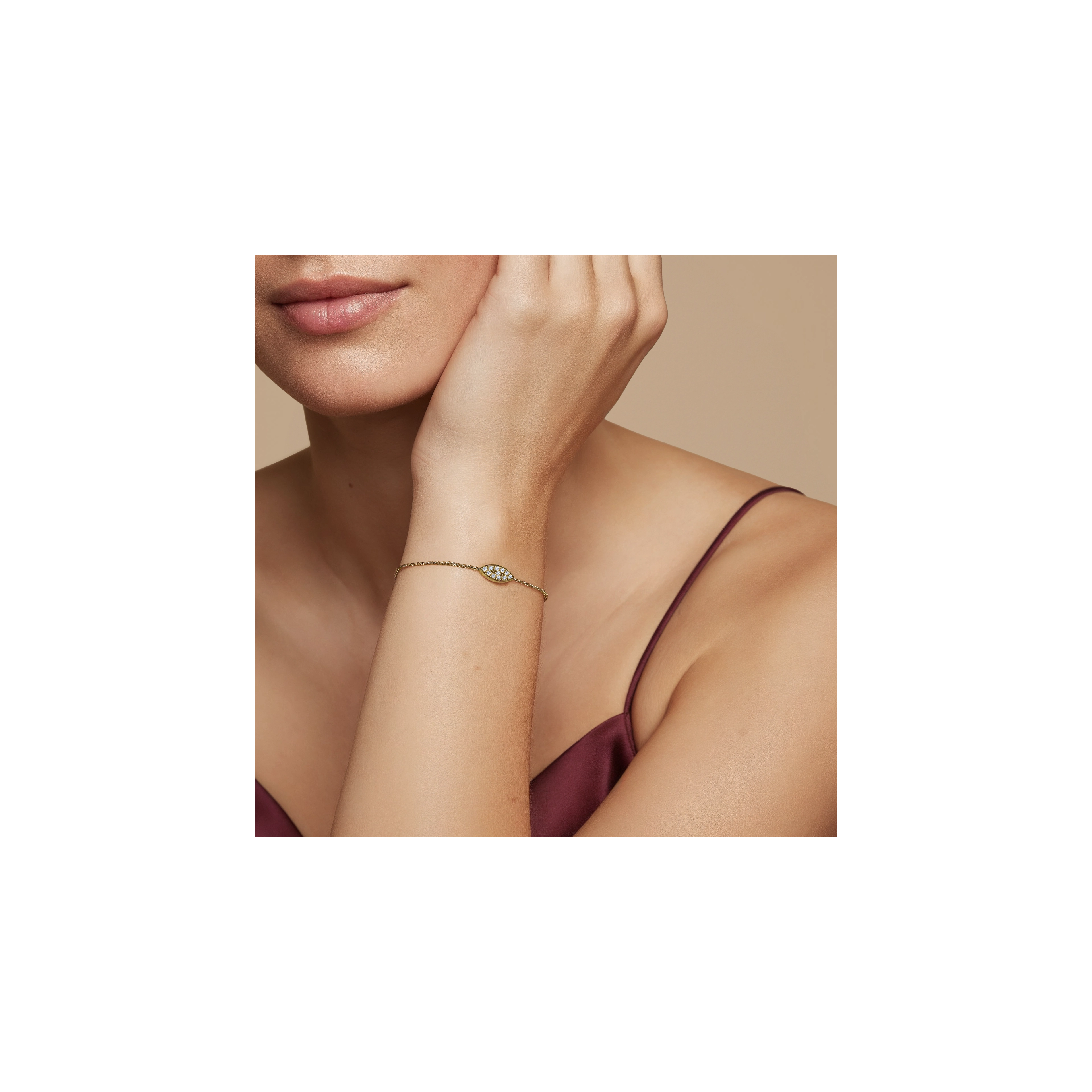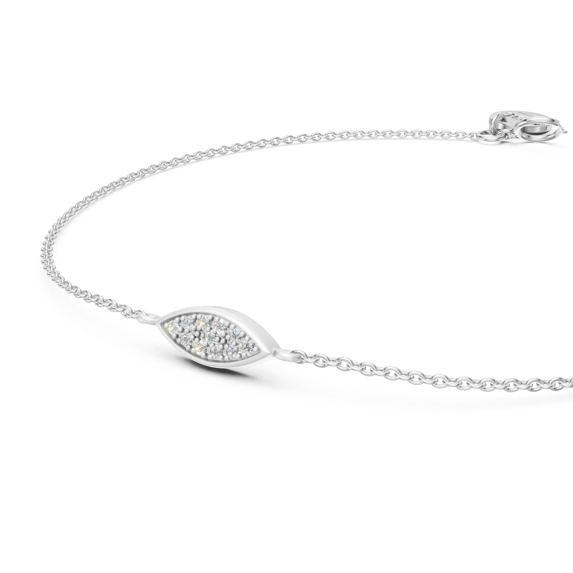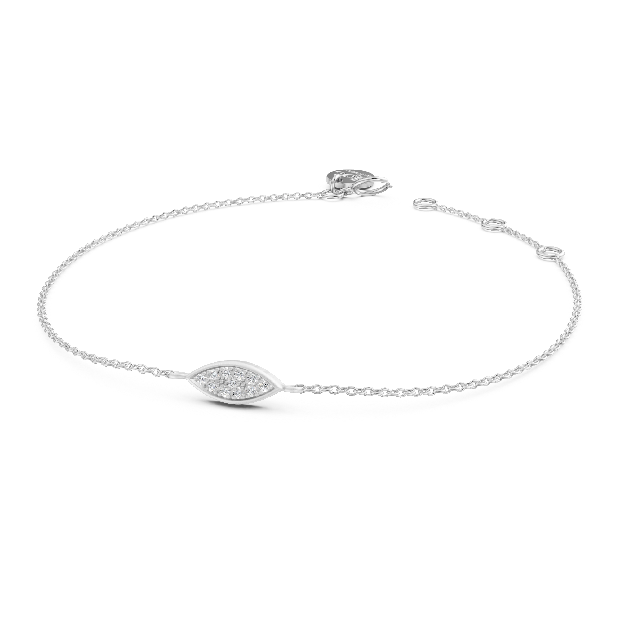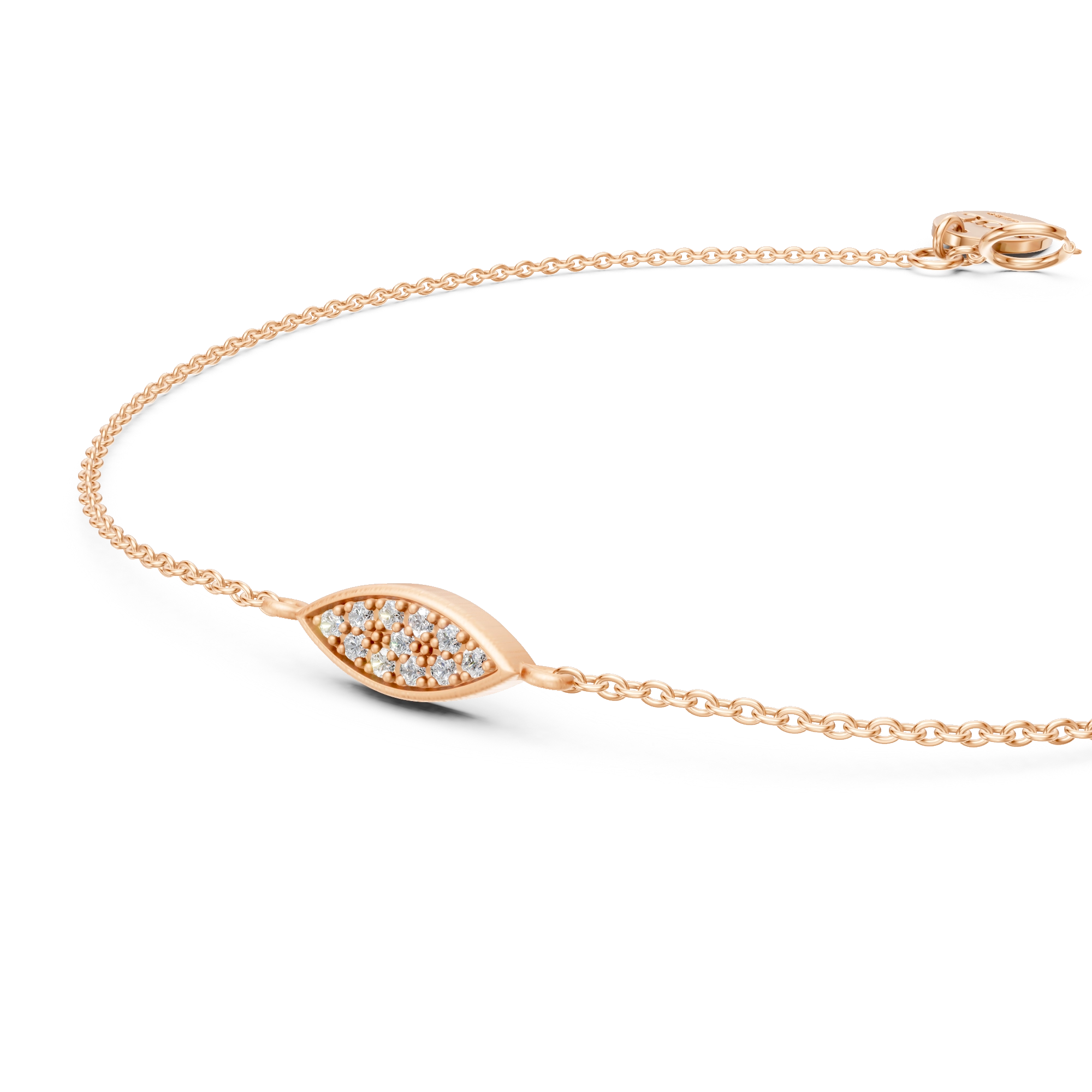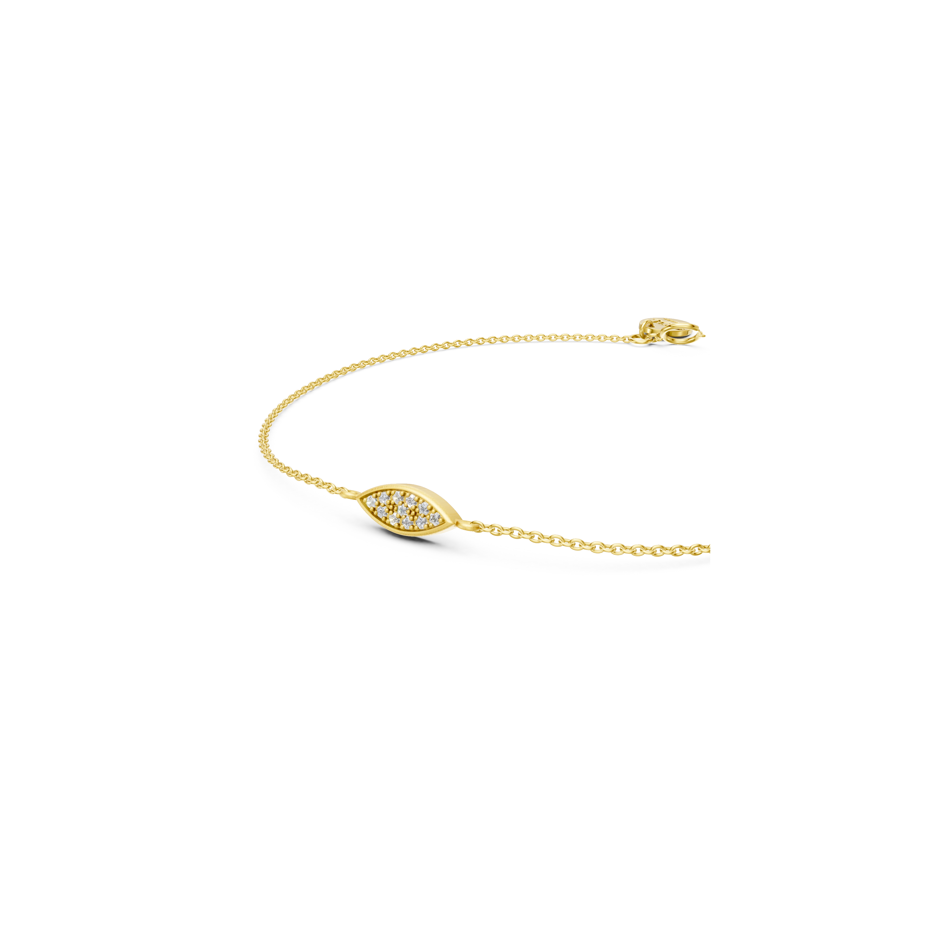 With an eye for elegance, this bracelet showcases a softly brushed marquise-shaped center piece handset with 11x natural diamonds, on an adjustable chain. Its delicate form draws inspiration from the peacock’s flowing feather motifs, all coming together in a true eye-catcher