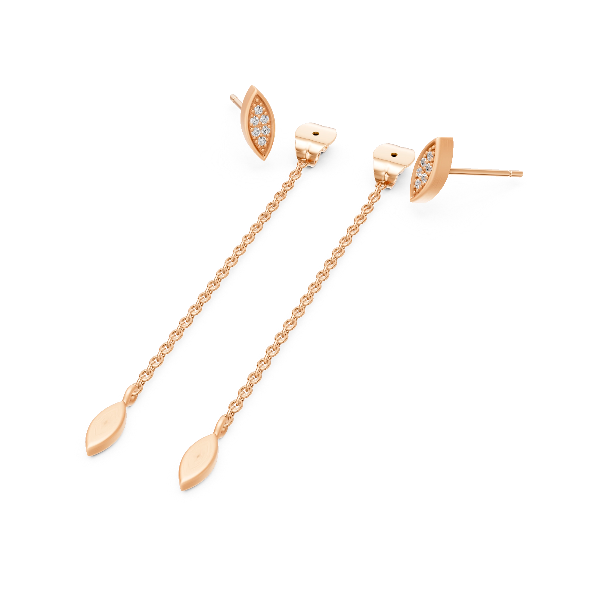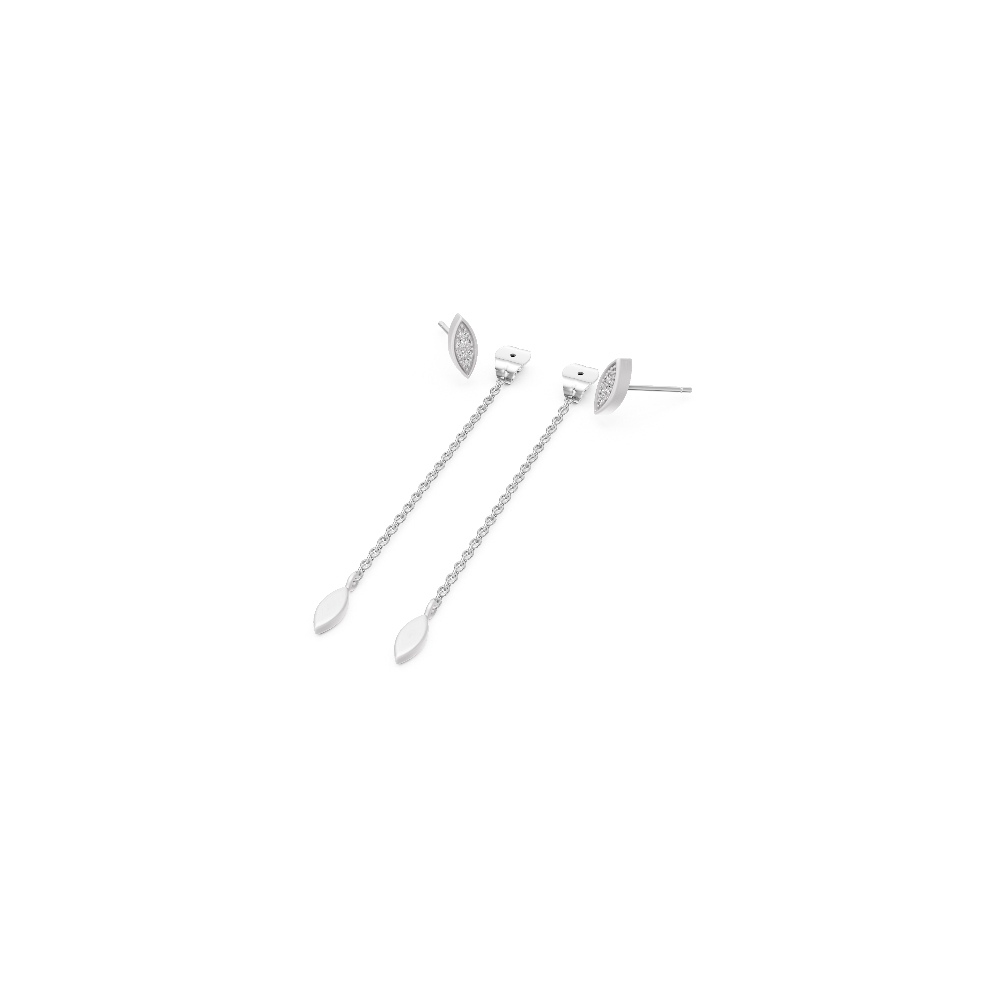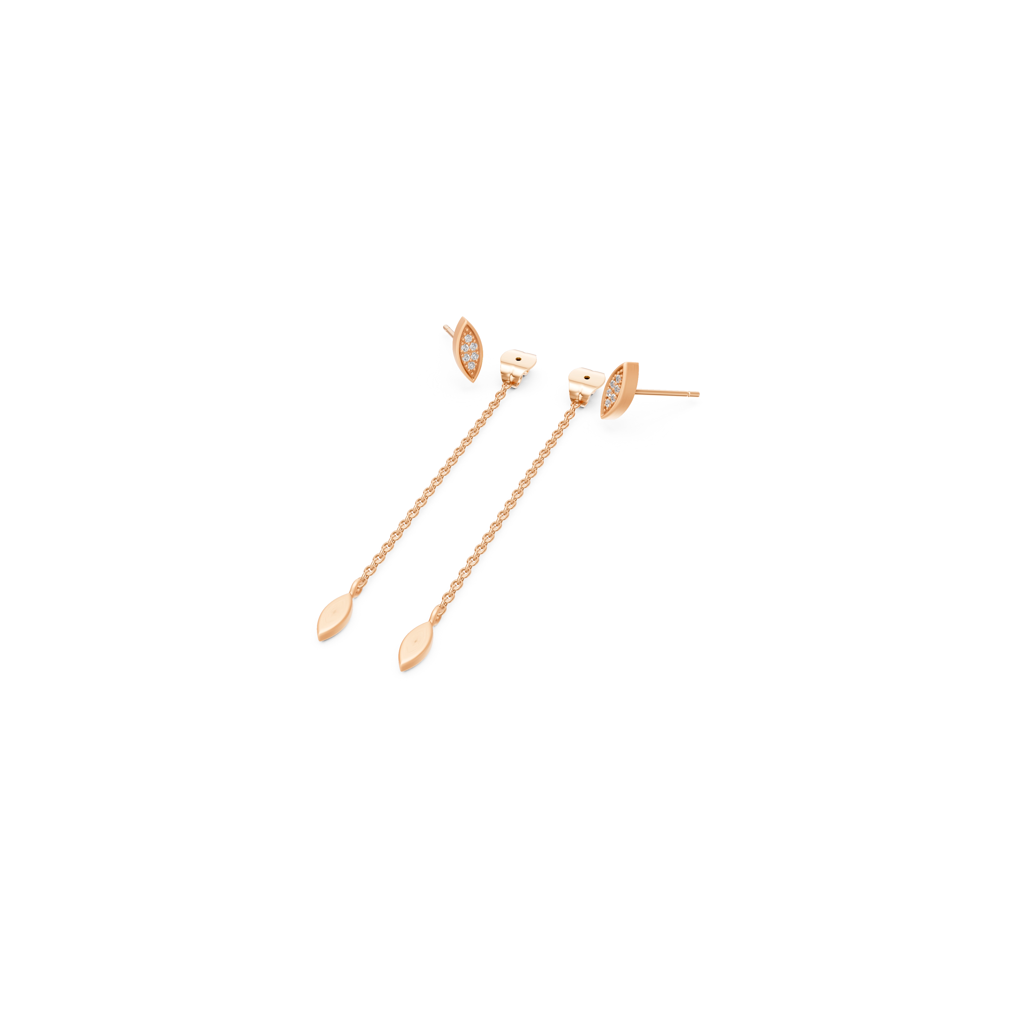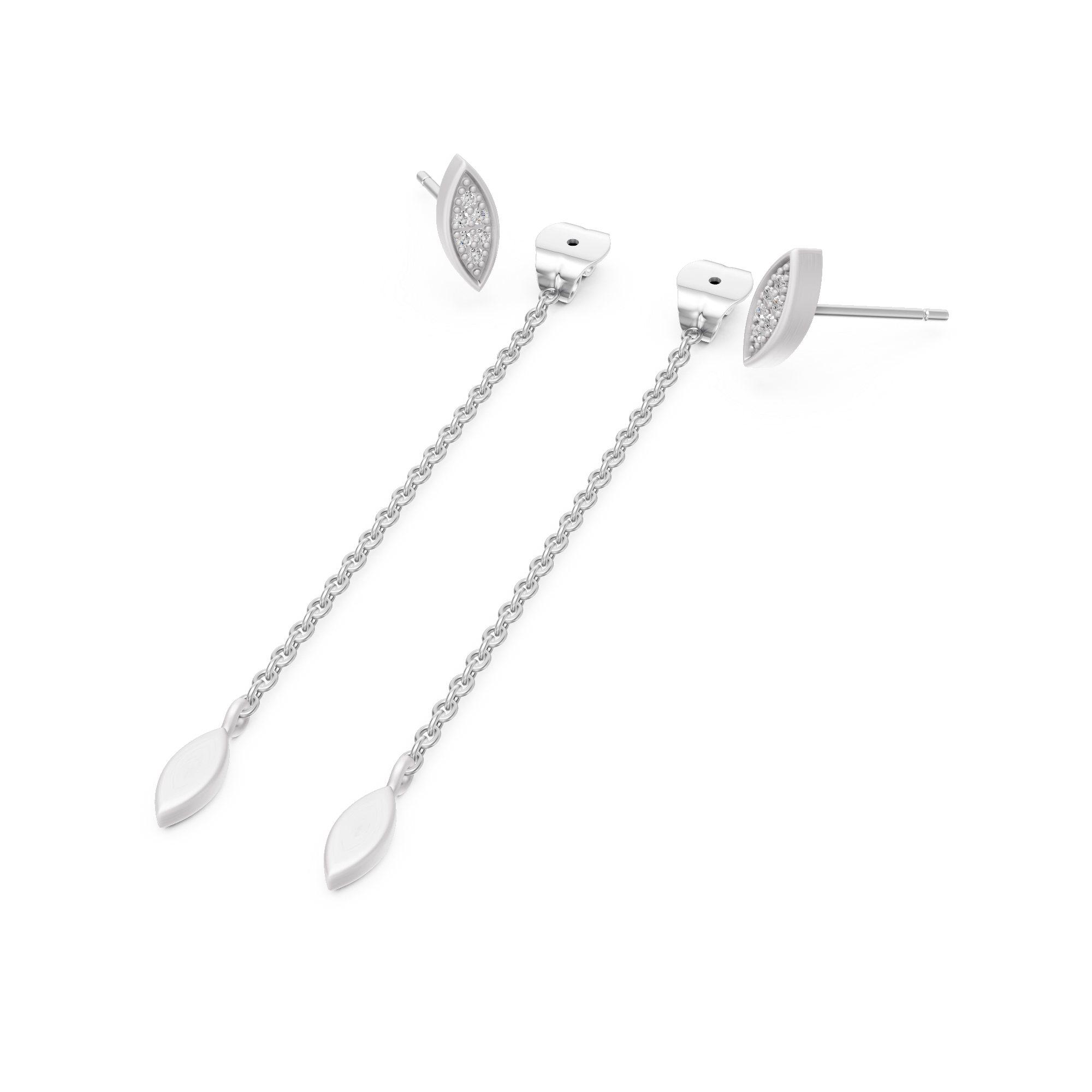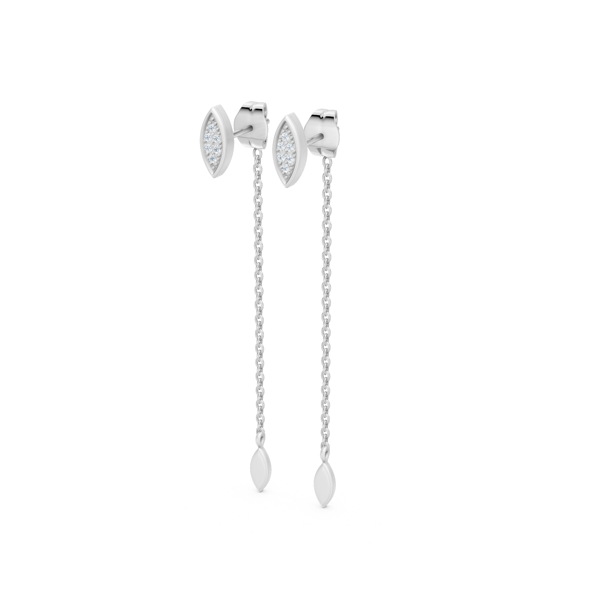 Shake your tail feather with these captivating earrings, where each marquise-shaped stud shimmers with 6x handset natural diamonds. From the butterfly lock, a delicate chain swings gracefully behind the earlobe, ending in a brushed marquise pendant that dances with your every move — embodying the peacock’s intricate elegance with a modern, flirty twist.