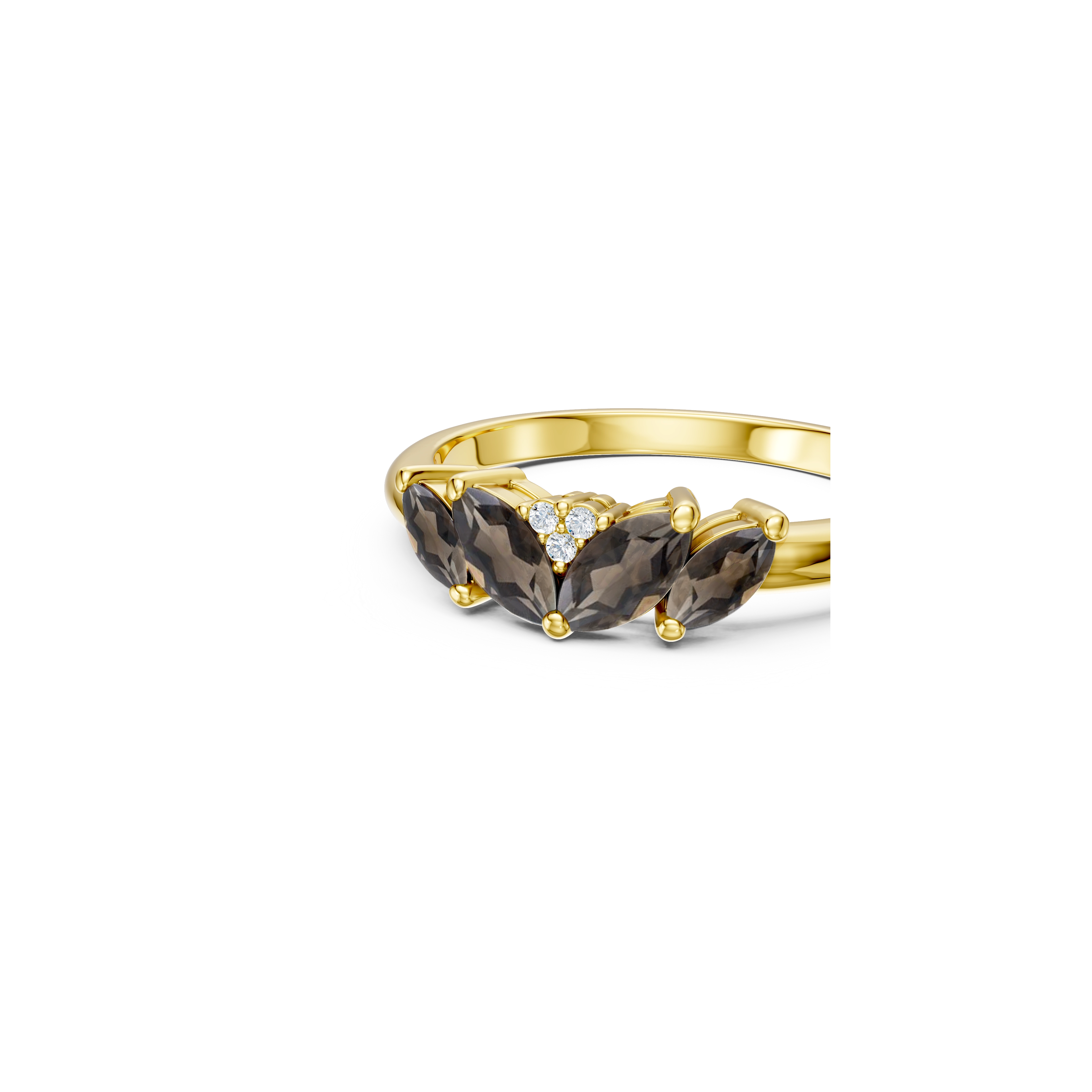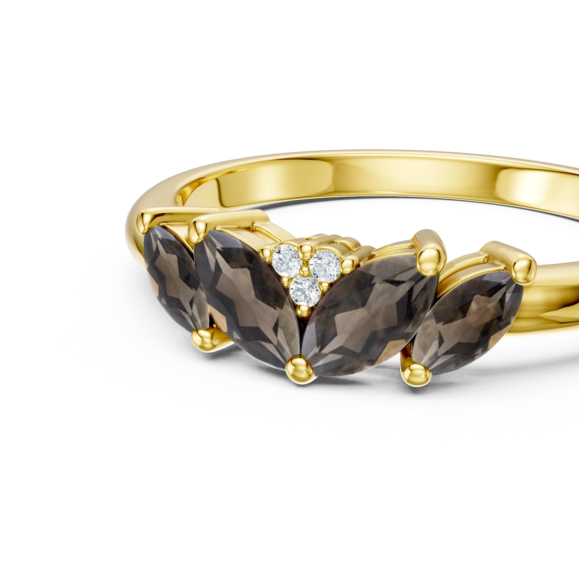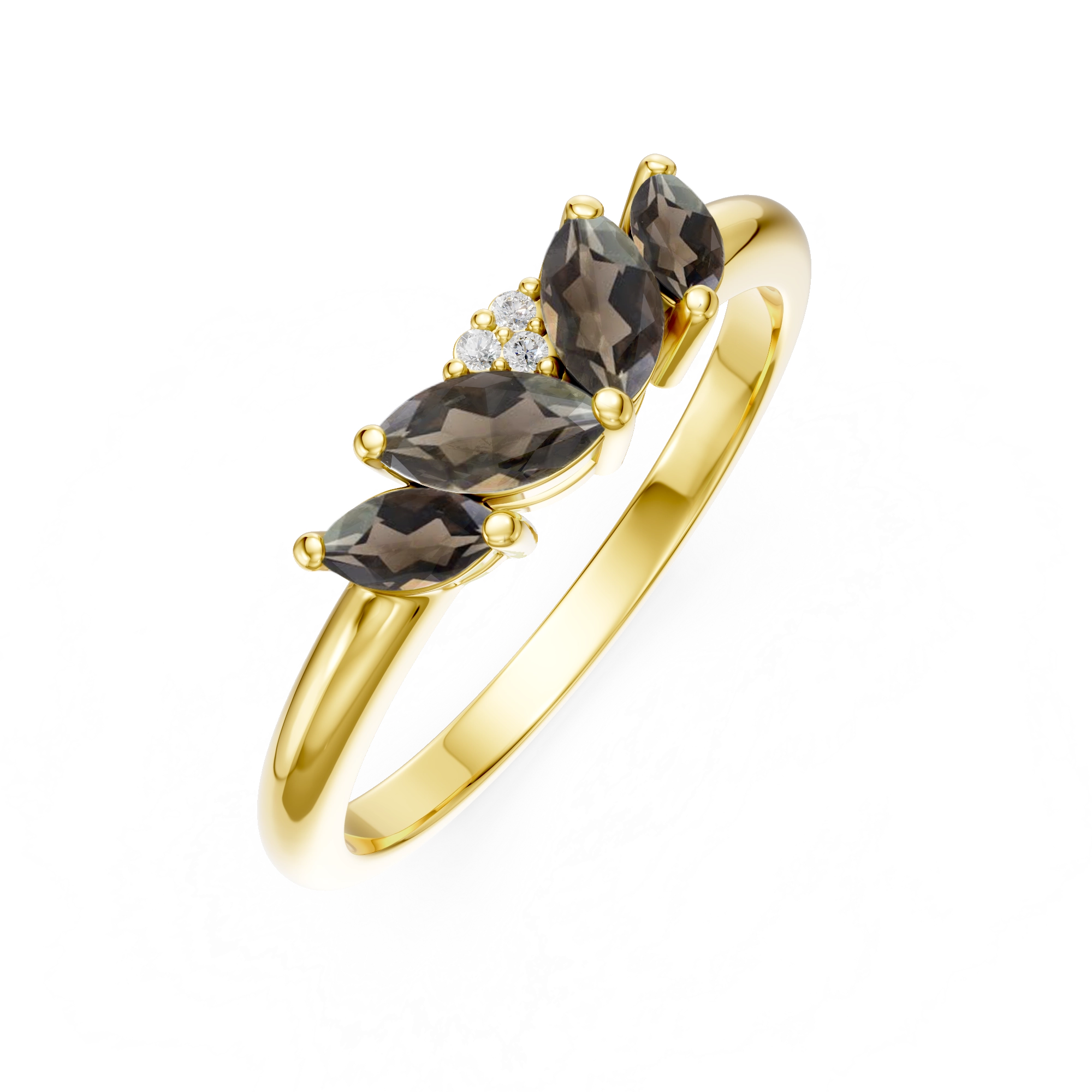 Inspired by the hypnotic curves of a peacock’s feathers, this ring showcases 4x marquise smokey quartz gemstones fanning out in a striking wave. Handset on a polished fine shank of 925 sterling silver, 3x natural diamonds shimmer at the center. Bold yet refined and perfect for adding a touch of quiet drama to your every day