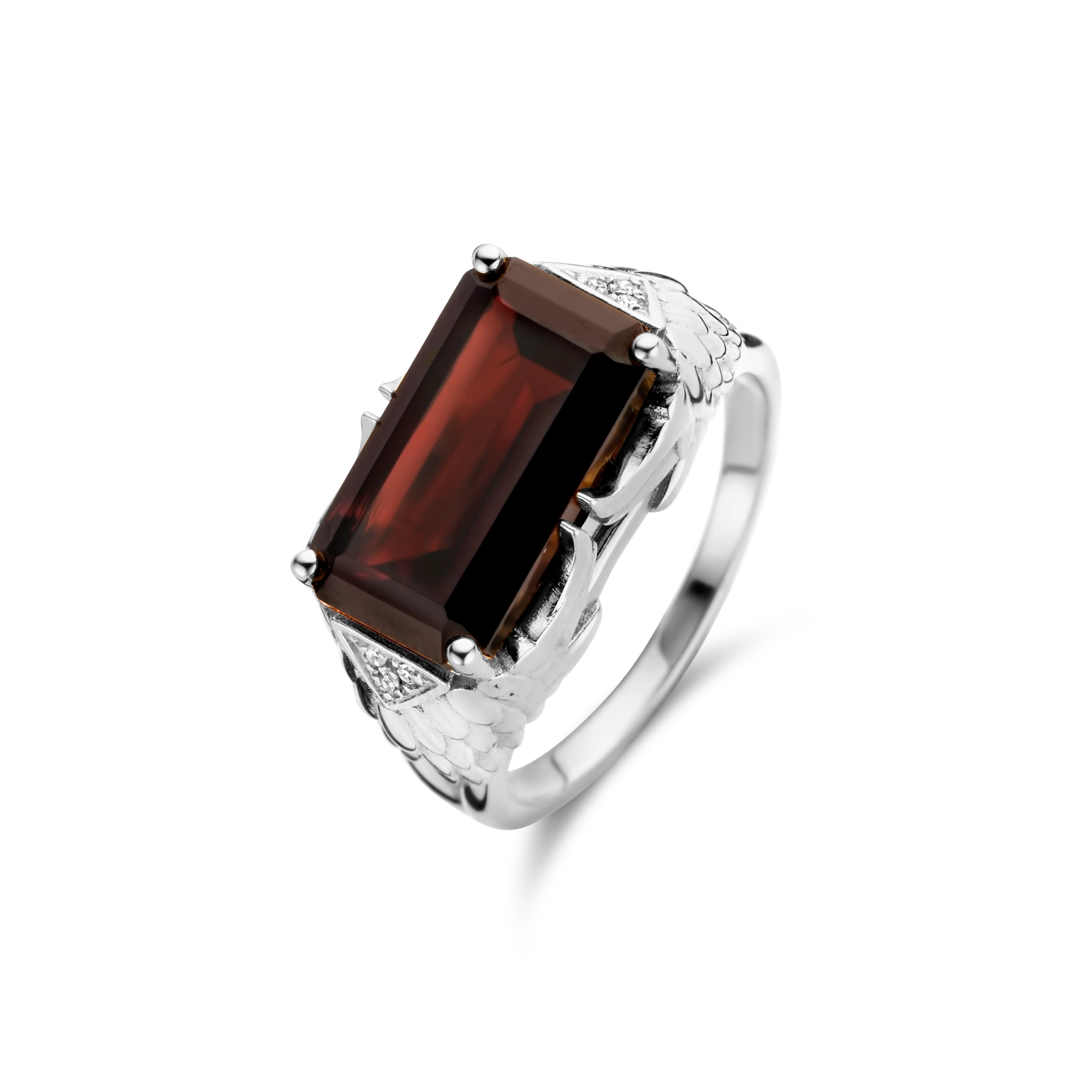'The Moenie ring, named after my beloved grandmother, is designed to encourage you to spread your wings and live a lifefull of love.' A true statement piece with a bold red garnet center stone, locked in by highly detailed feathered wings and 6x crisp white diamonds.