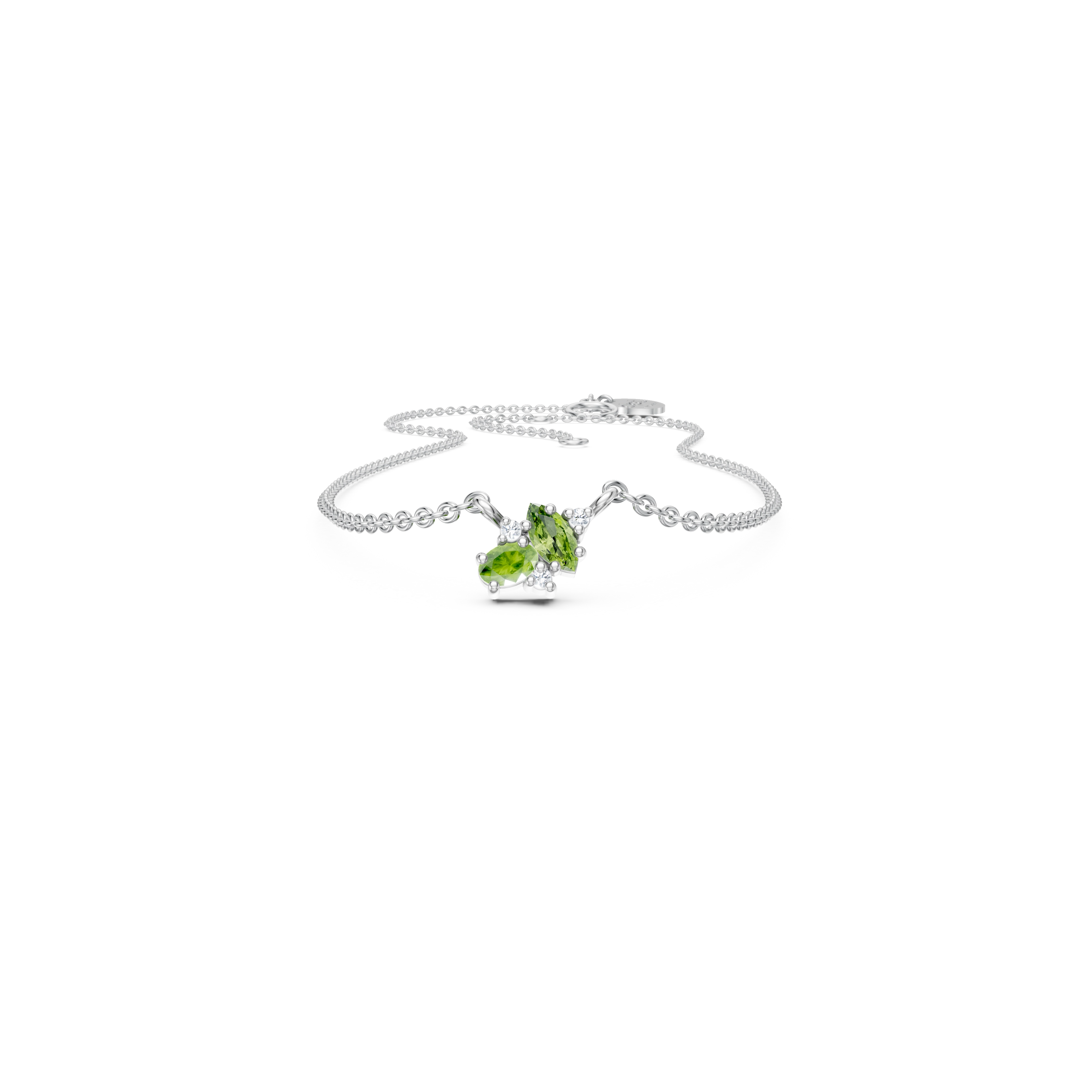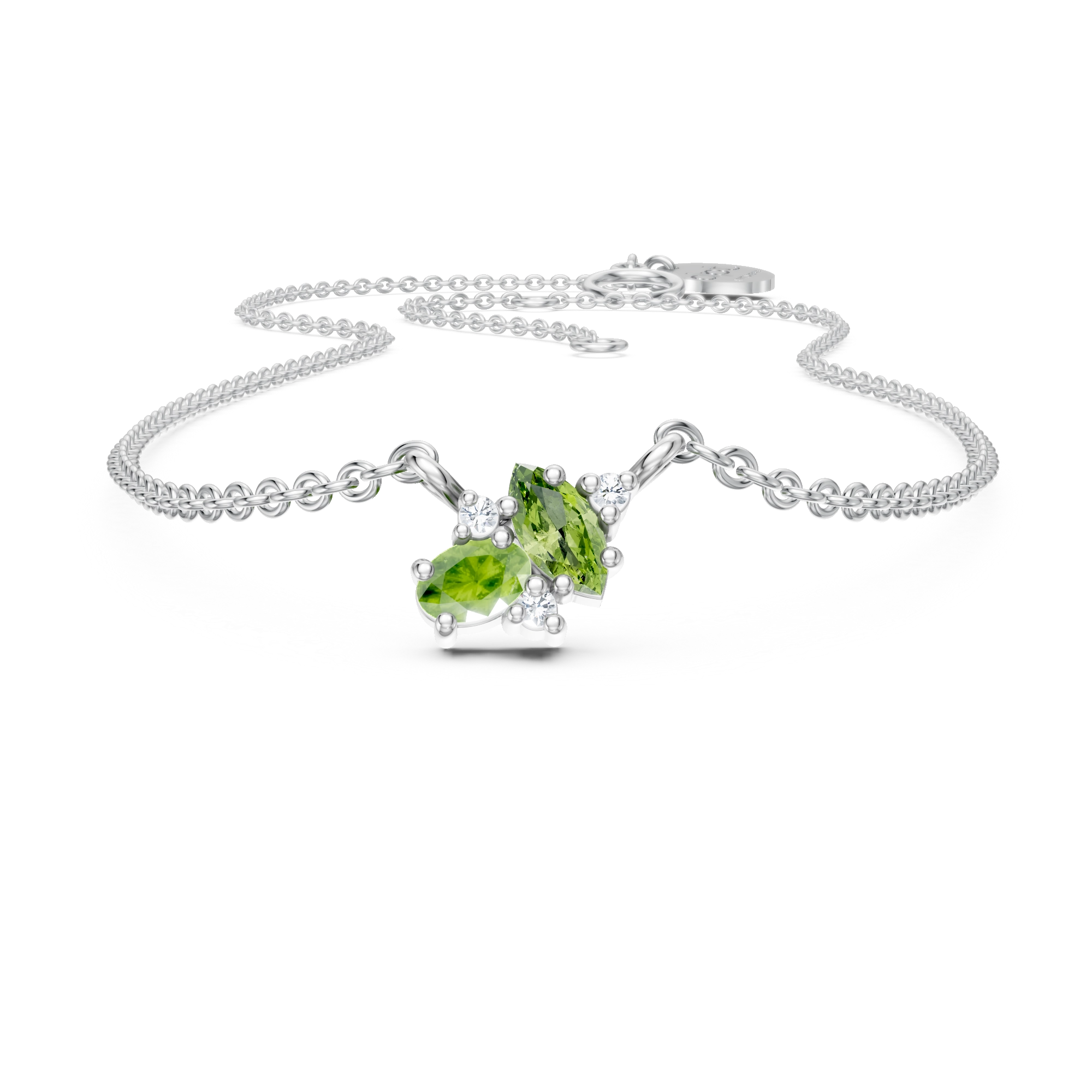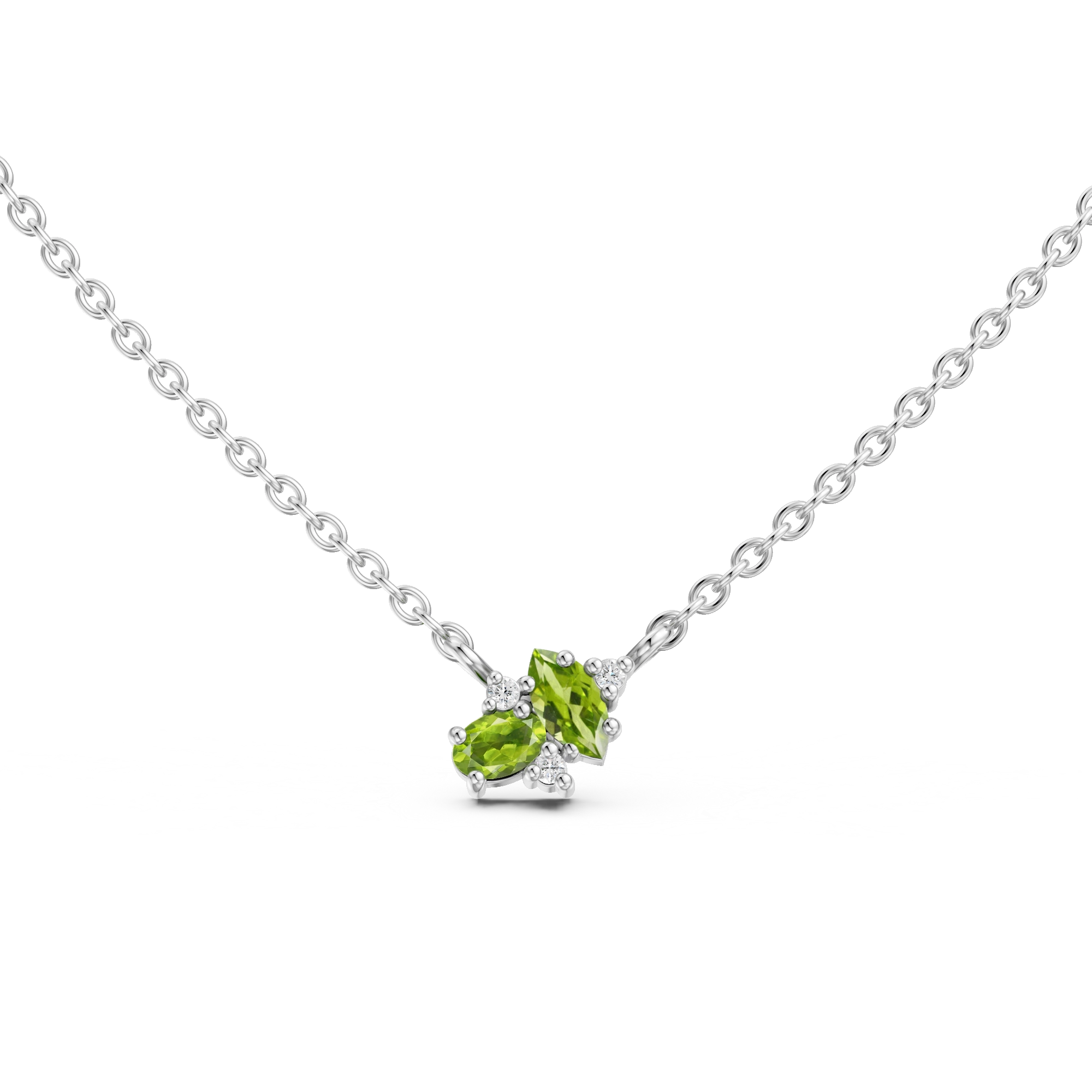 Softly shimmering and effortlessly refined, this fine chain necklace features a delicate cluster of 2x oval peridot gemstones accented with scattered white diamonds. Inspired by the lush greens of a peacock’s plumage, it’s the perfect piece to wear solo or layered for a modern, romantic touch. Crafted with meticulous attention to detail in 925 sterling silver.