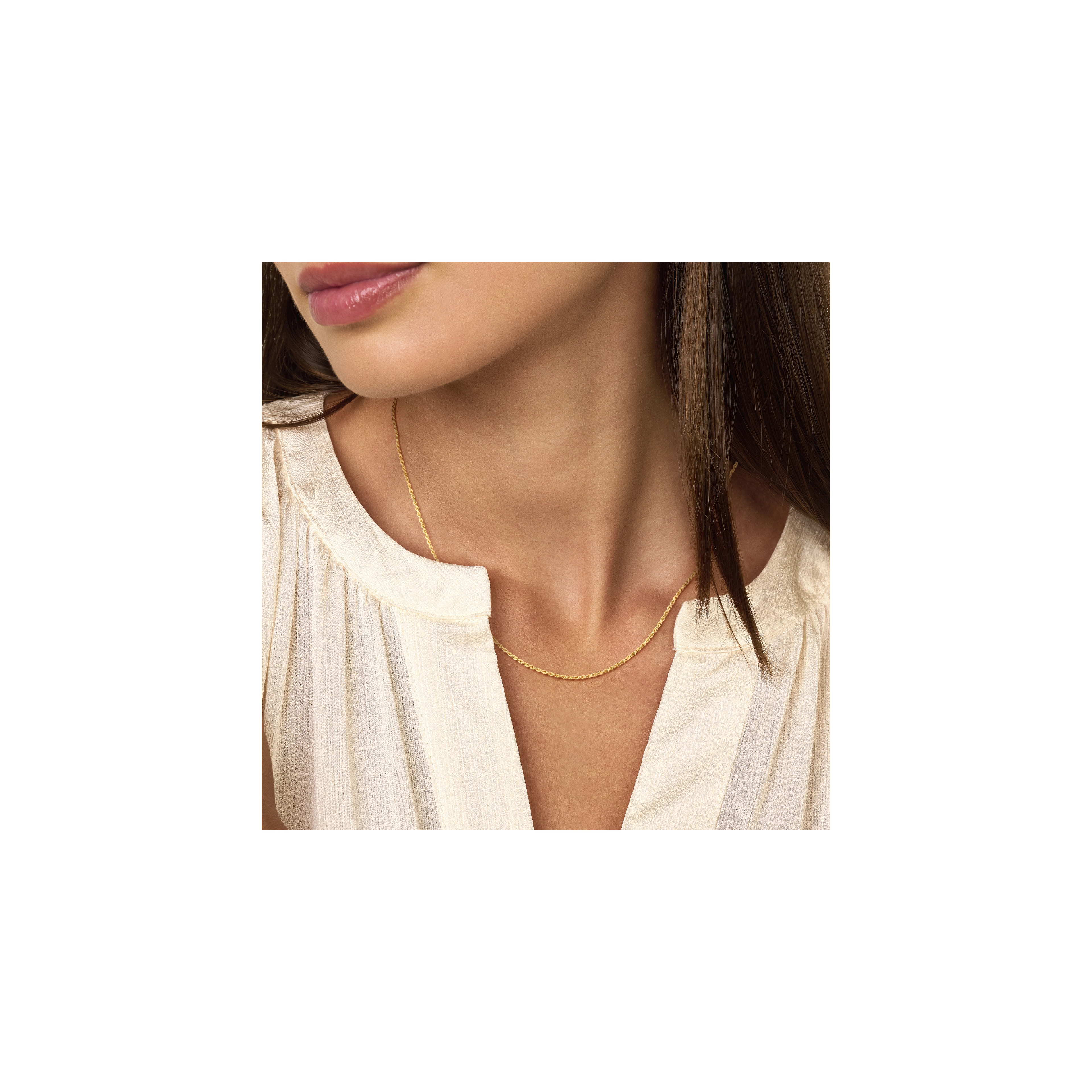 Twisting strands of lustrous metal create a captivating rope design thatcatches and refl ects light beautifully. This chain’s elegant shimmer servesas the perfect backdrop for showcasing your favorite diamond pendants,amplifying their natural radiance.Comes in standard 45-50cm length or add a 10cm extension piece to go longer. For custom sizing, reach out to our service atelier.