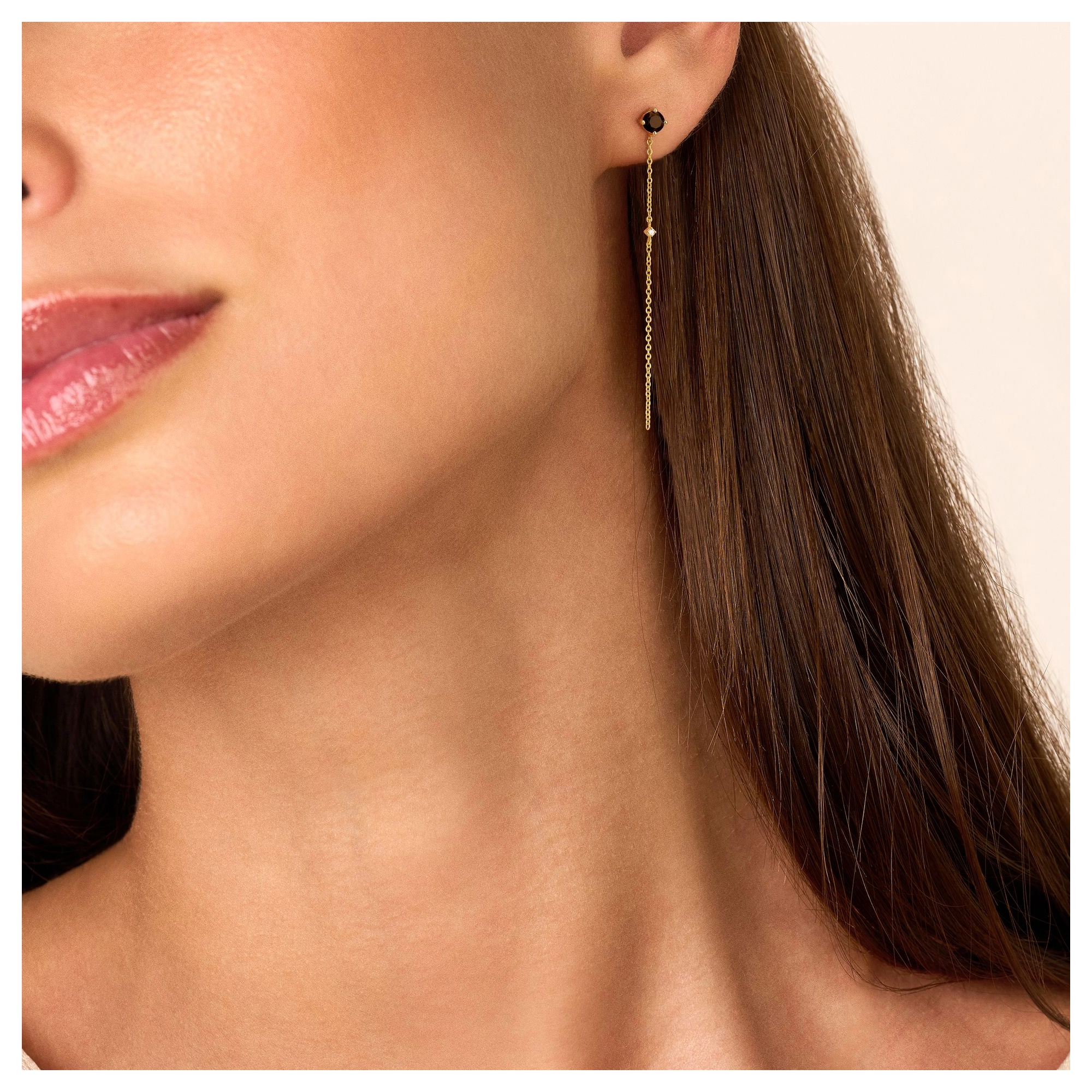 Embracing the mysterious darkness of black onyx gemstones, these round studs are embellished with natural diamonds (2x) fl oating on a sleek chain. It’s your little black dress, jewelry-style.