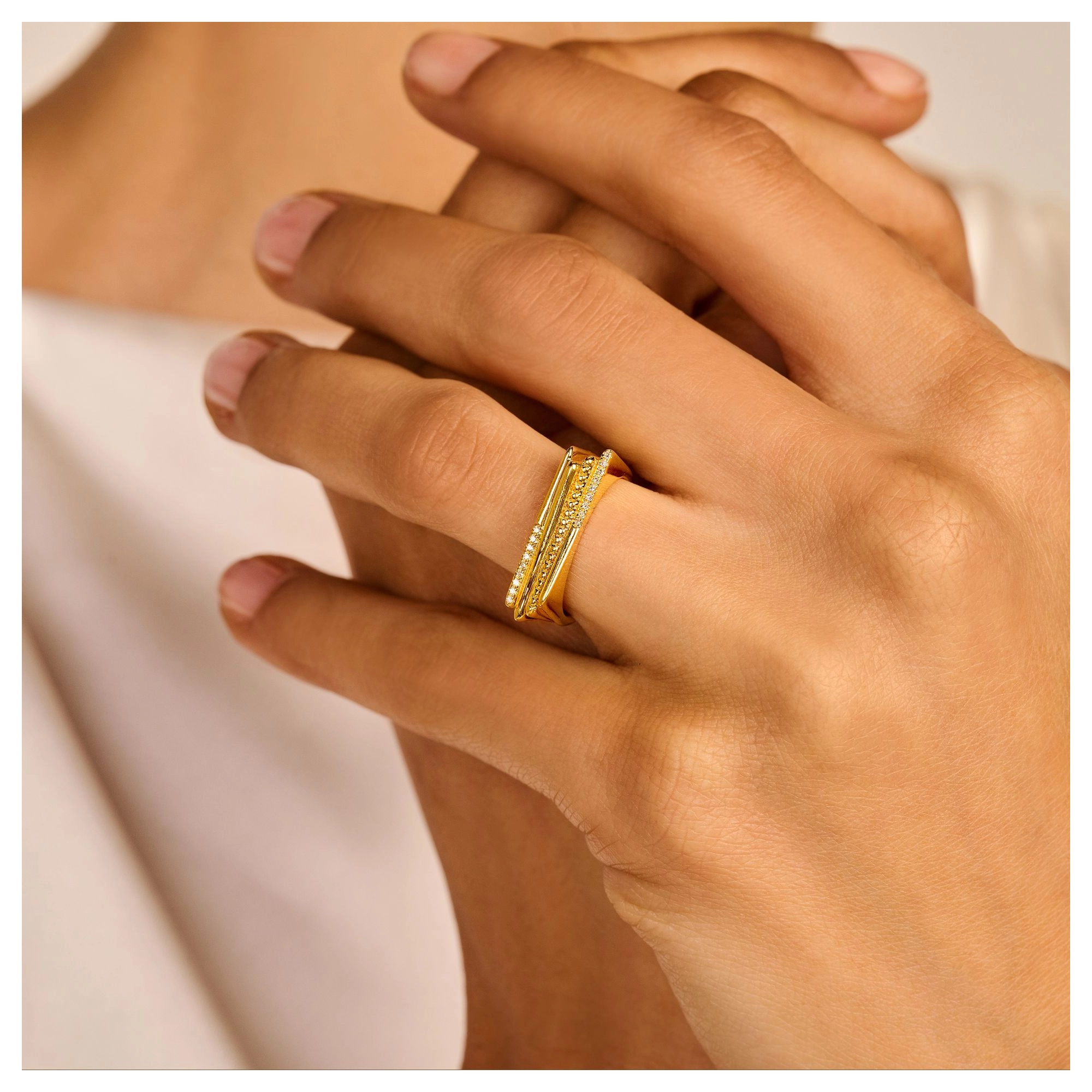Behold - a magnificent quartet ring, crafted of trapeze bars. One plain and polished, the other finished with milgrain detailing, both wrapped by diamond shanks. The razzle-dazzle glow of 18x natural diamonds, matching all the shine of a thousand spotlights.