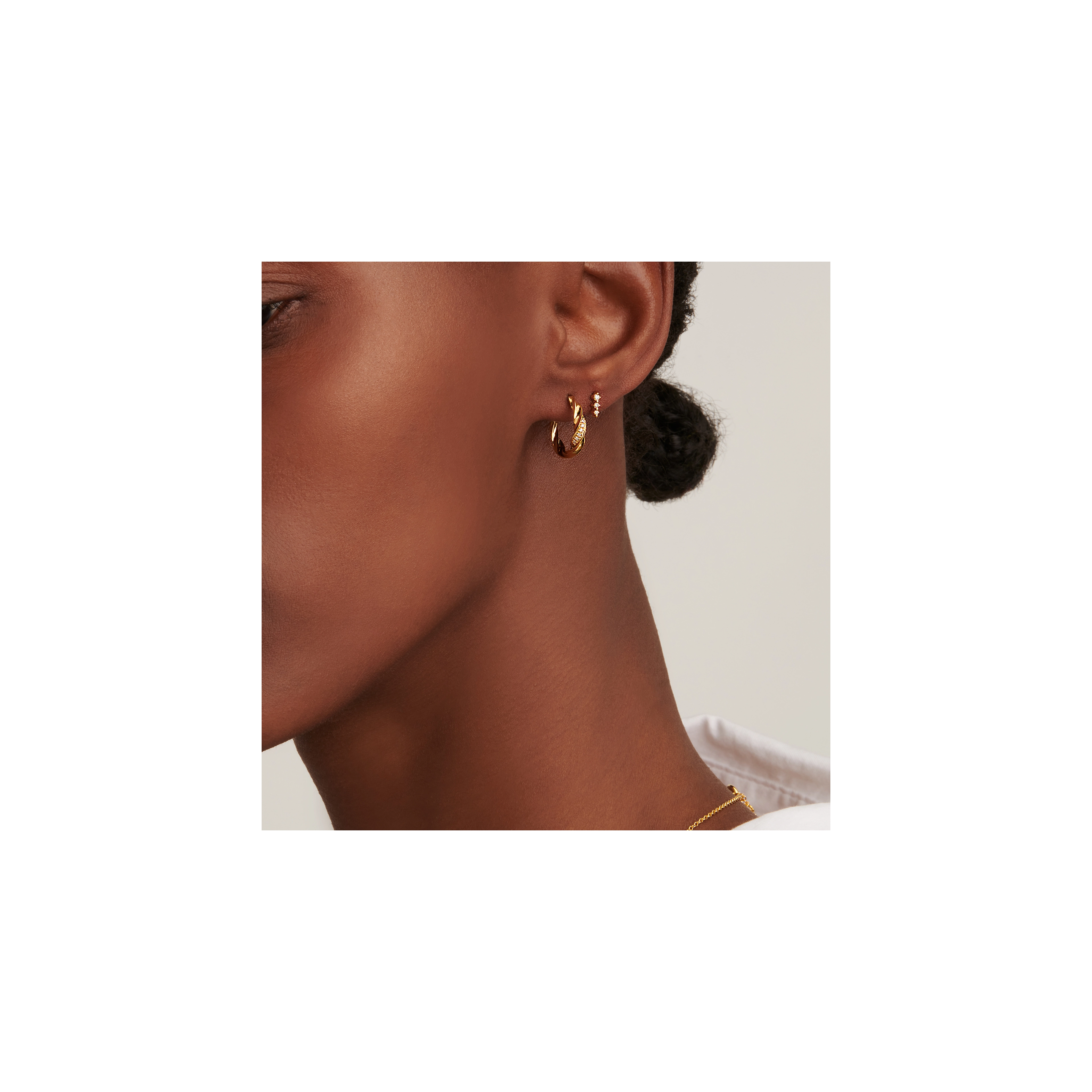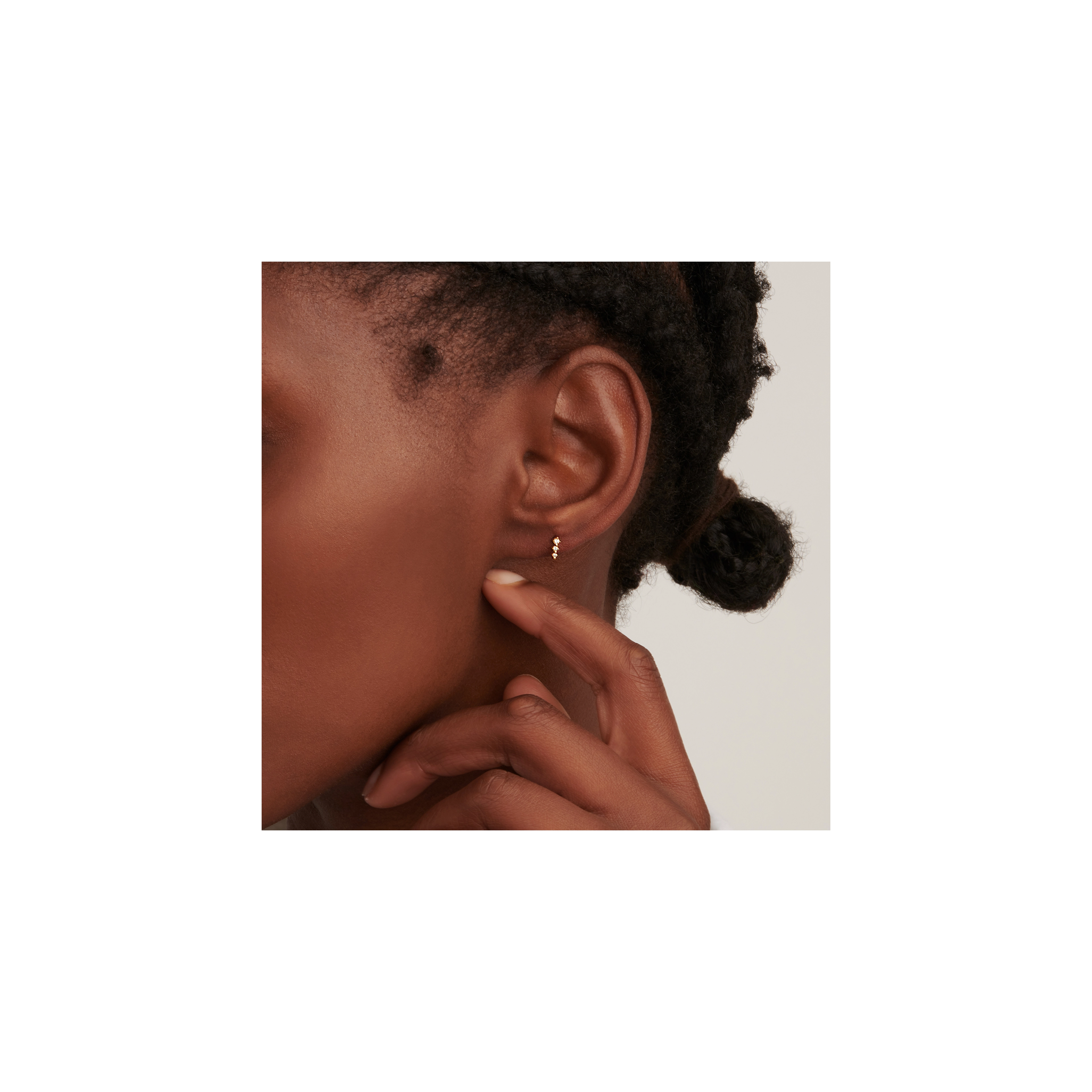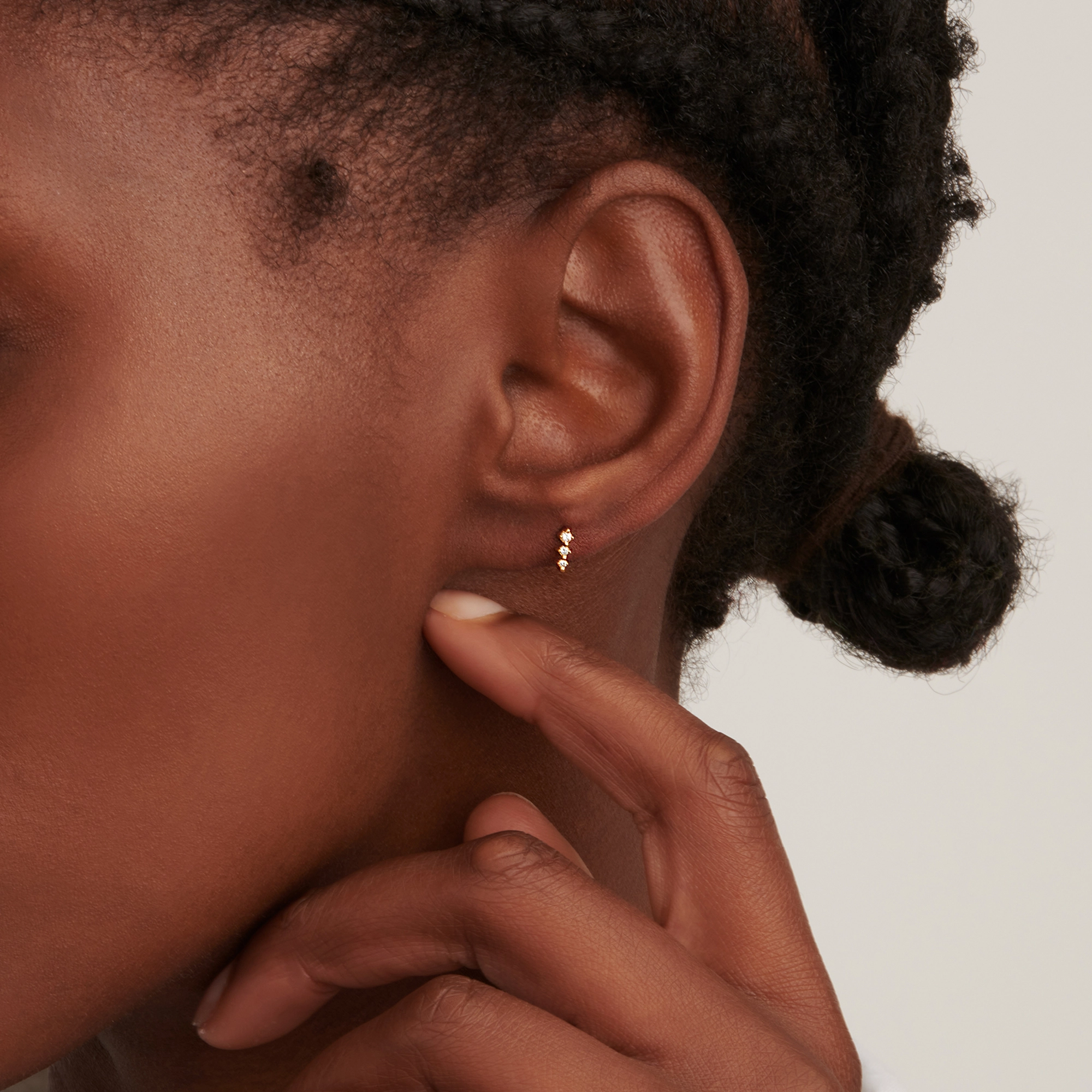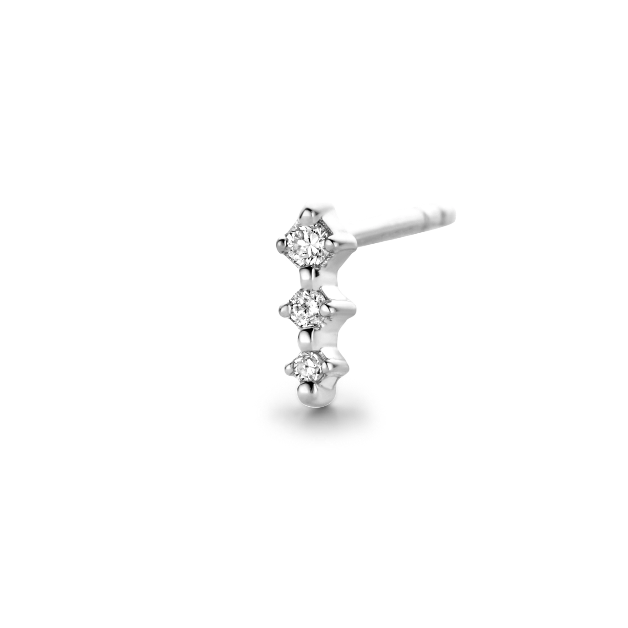 Our signature Twinkle stud, carrying 3x eye-catching white diamonds, suddenly hits you with its undeniable magic. Play around and mix sizes. A great, sparkling sidekick to our Twinkle single hoop.