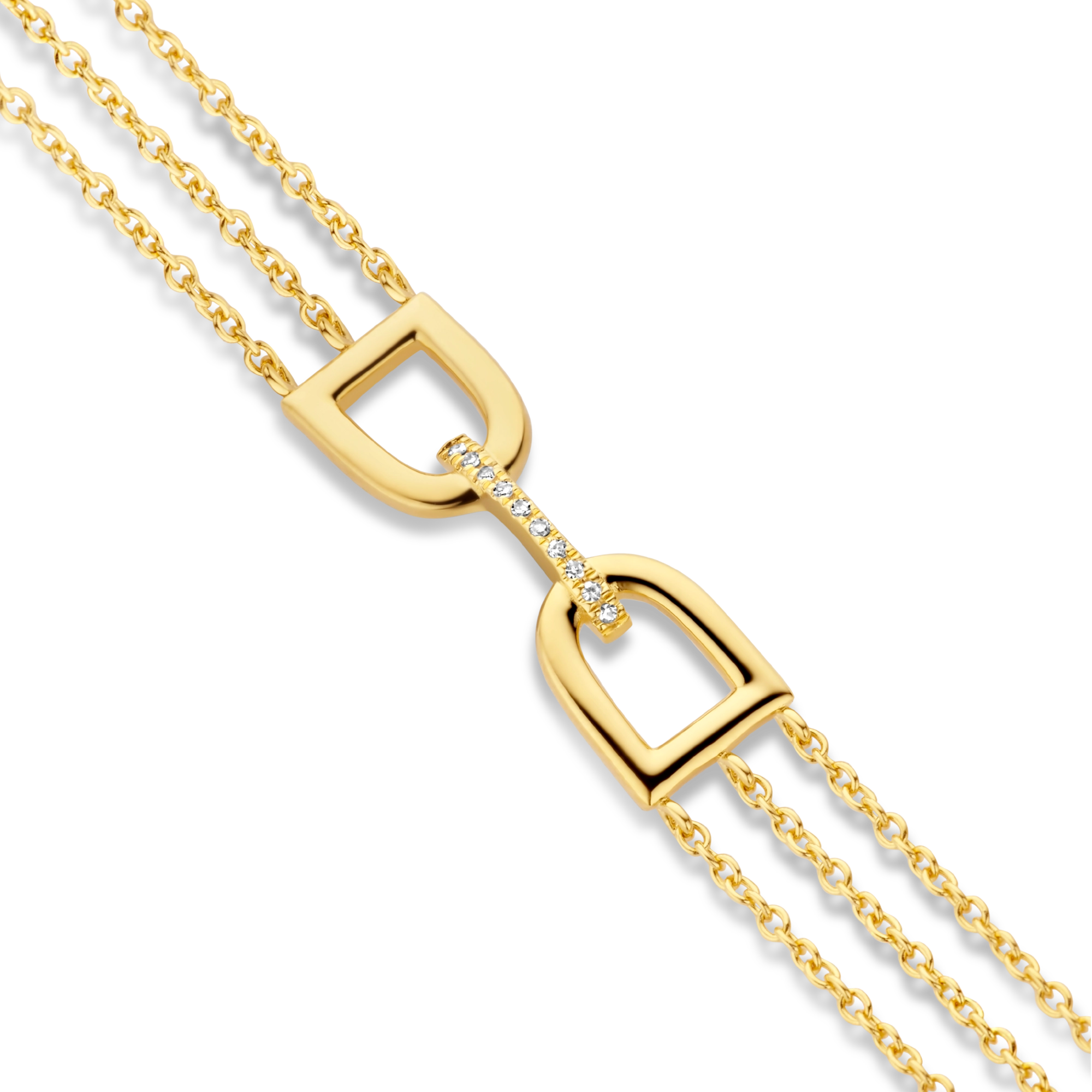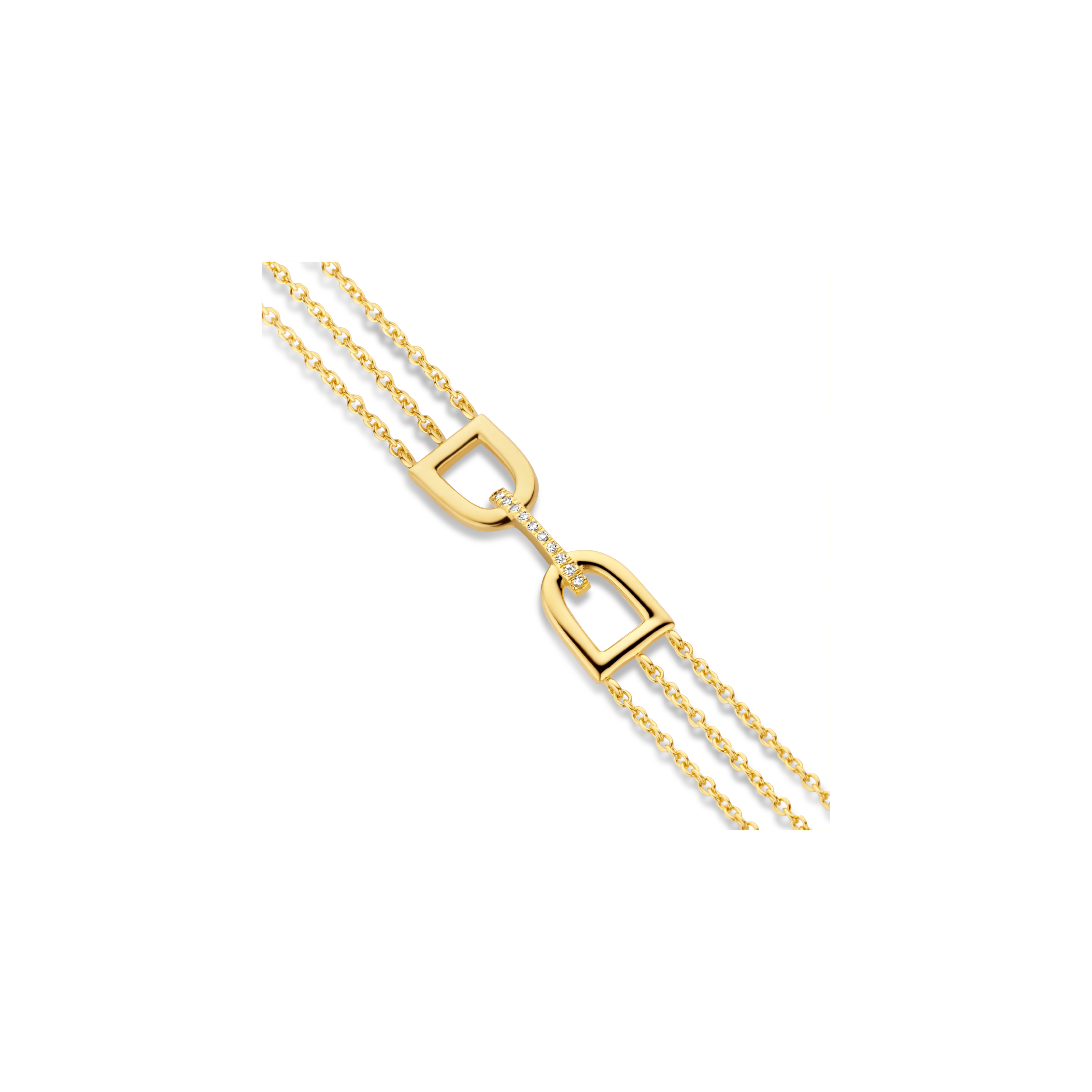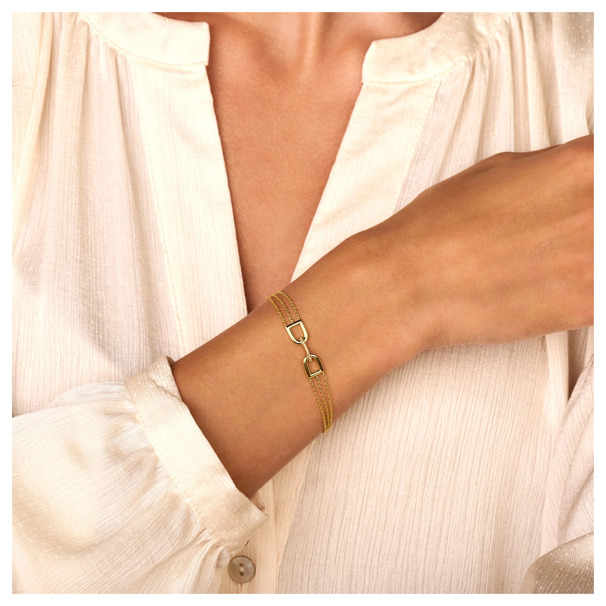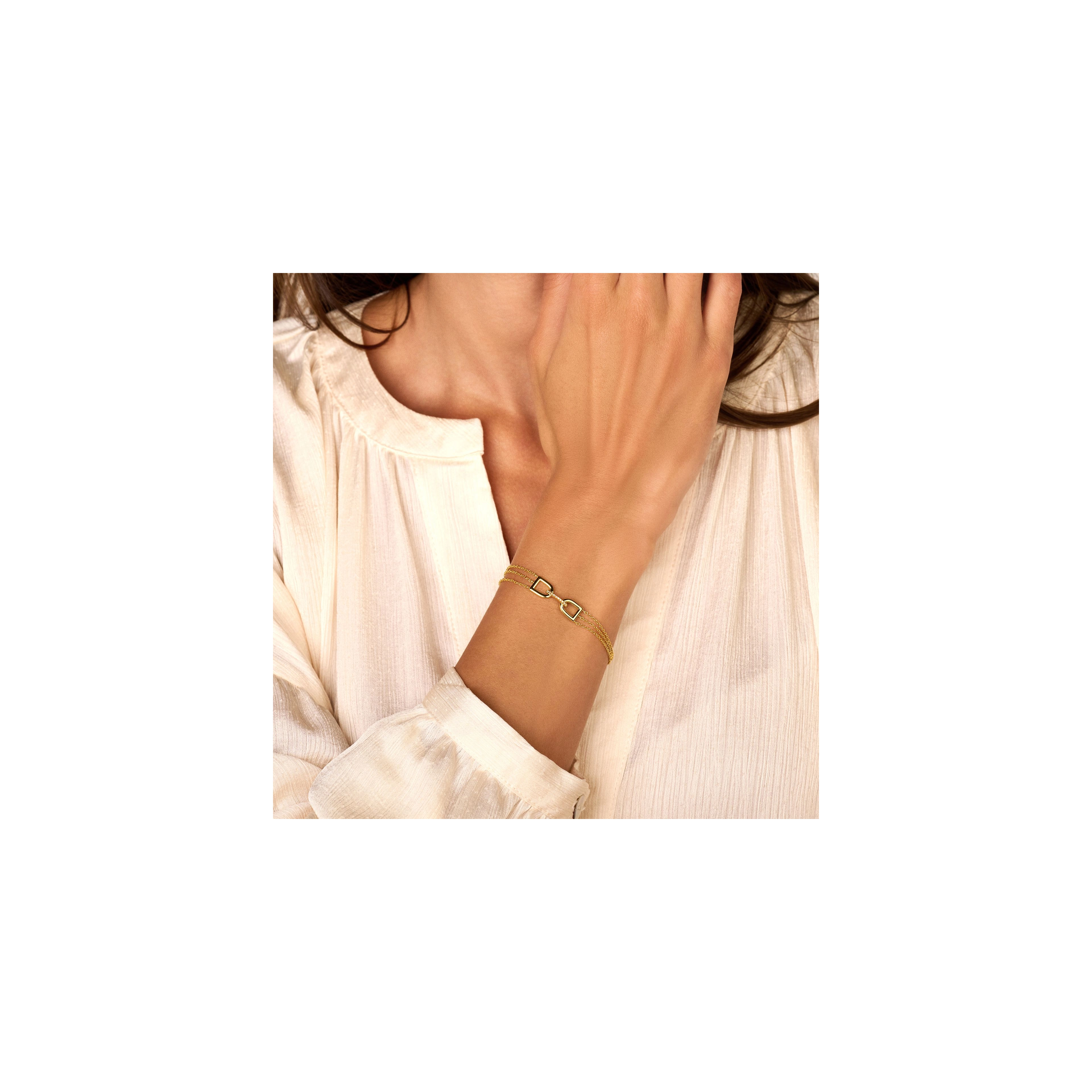 A triple chained bracelet, highlighting a refined center piece of double arches, connected by a paved diamond bridge. Inspired by the shape of enchanting garden gates, you’ll be unlocking a secret scene of beauty and wonder within you.