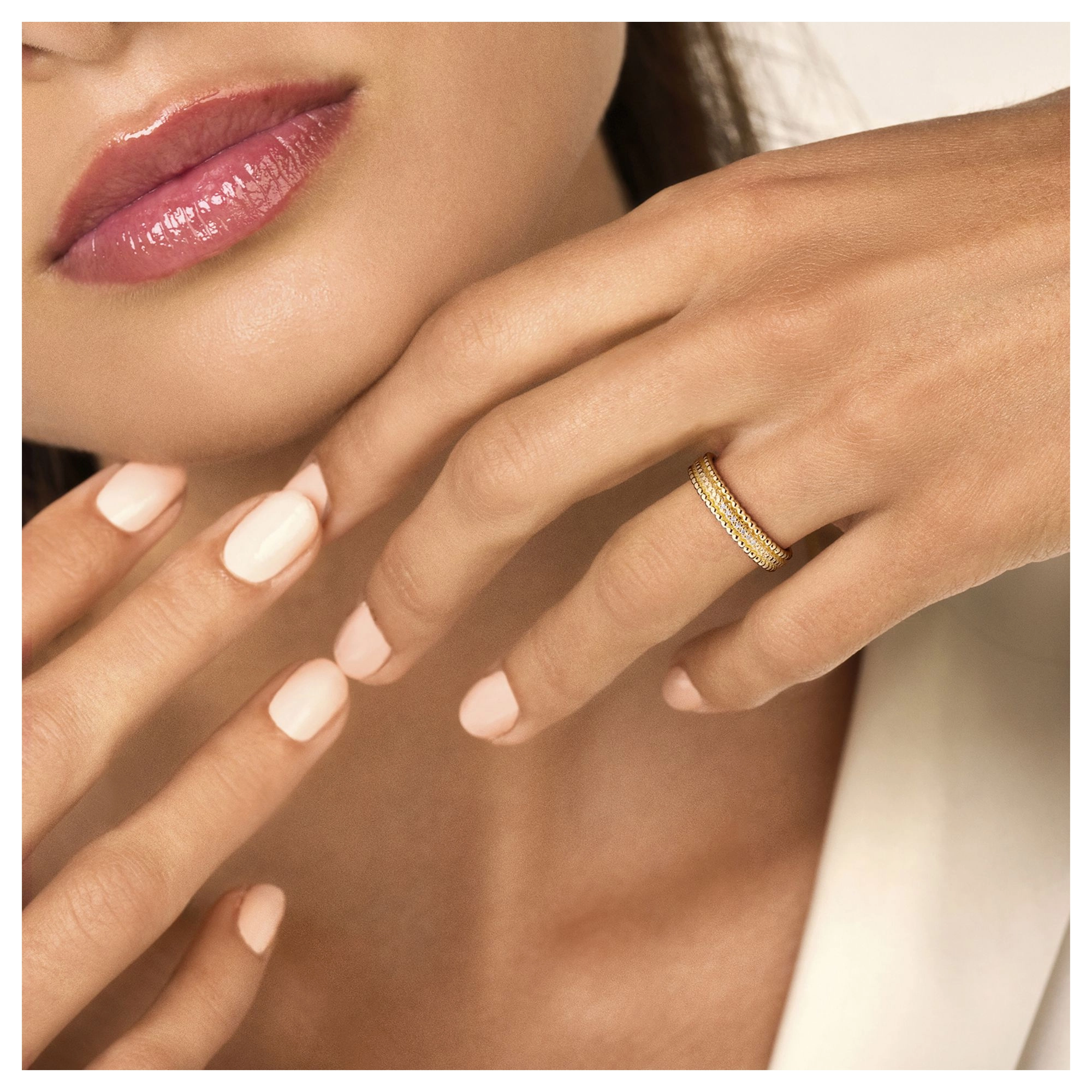 For those dotty about an endless sea of dots, perfected by the brilliance of 7x gleaming white diamonds. Whatever the season, whatever the occasion, wearing this timeless tri-band ring, you’ll be headed beaded for greatness. STYLING TIP Check out our Wonder and Destiny jewels for a full variety on a chic look, covered in beads.