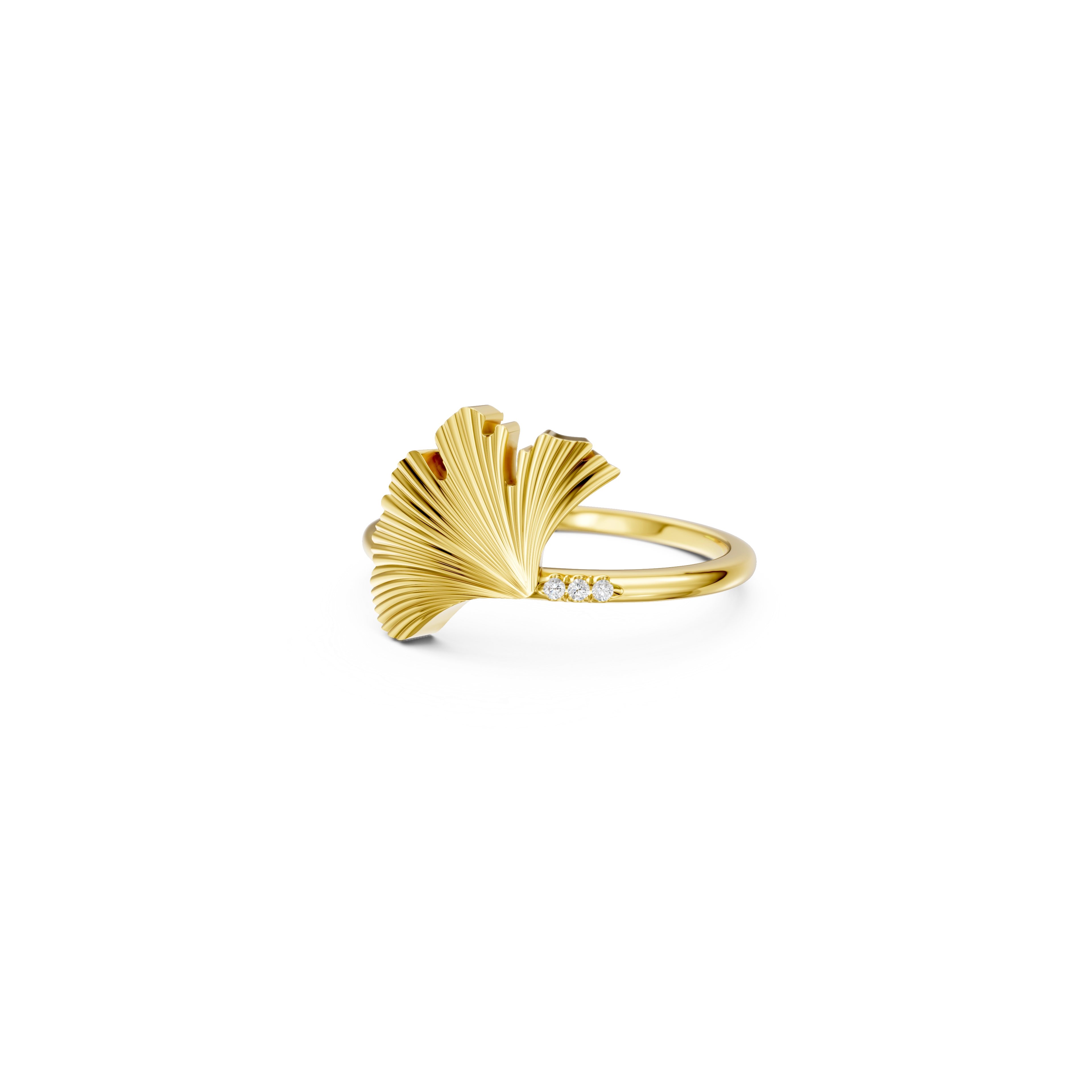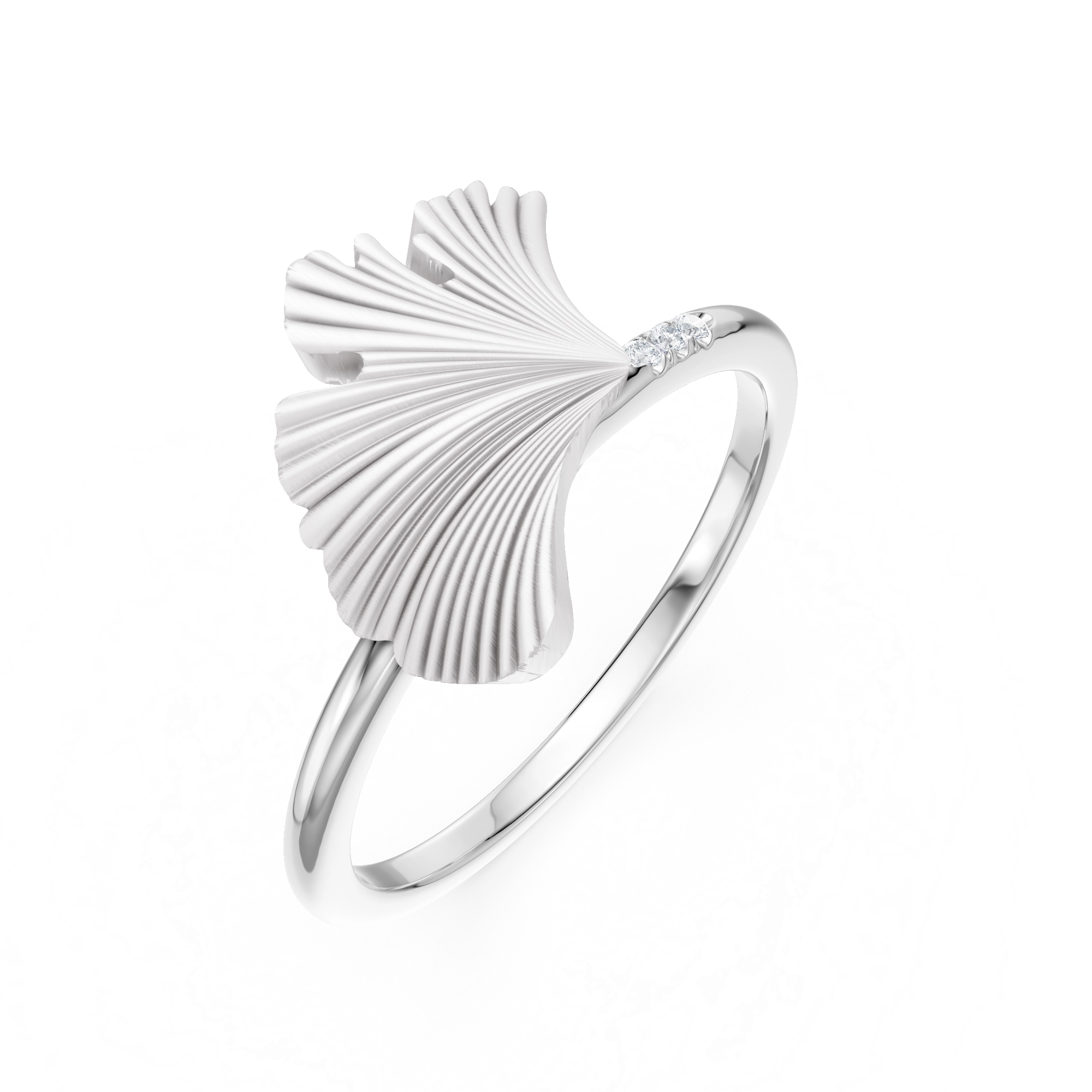 Airy and sculptural, this ring drapes a feathered silhouette across the finger with fluid grace. The brushed fan gently curves, while 3x delicate diamonds are nestled into its edge — subtle sparks of light that symbolize clarity and resilience. With a fine band for comfort and minimalism, this piece balances statement and softness in perfect harmony.