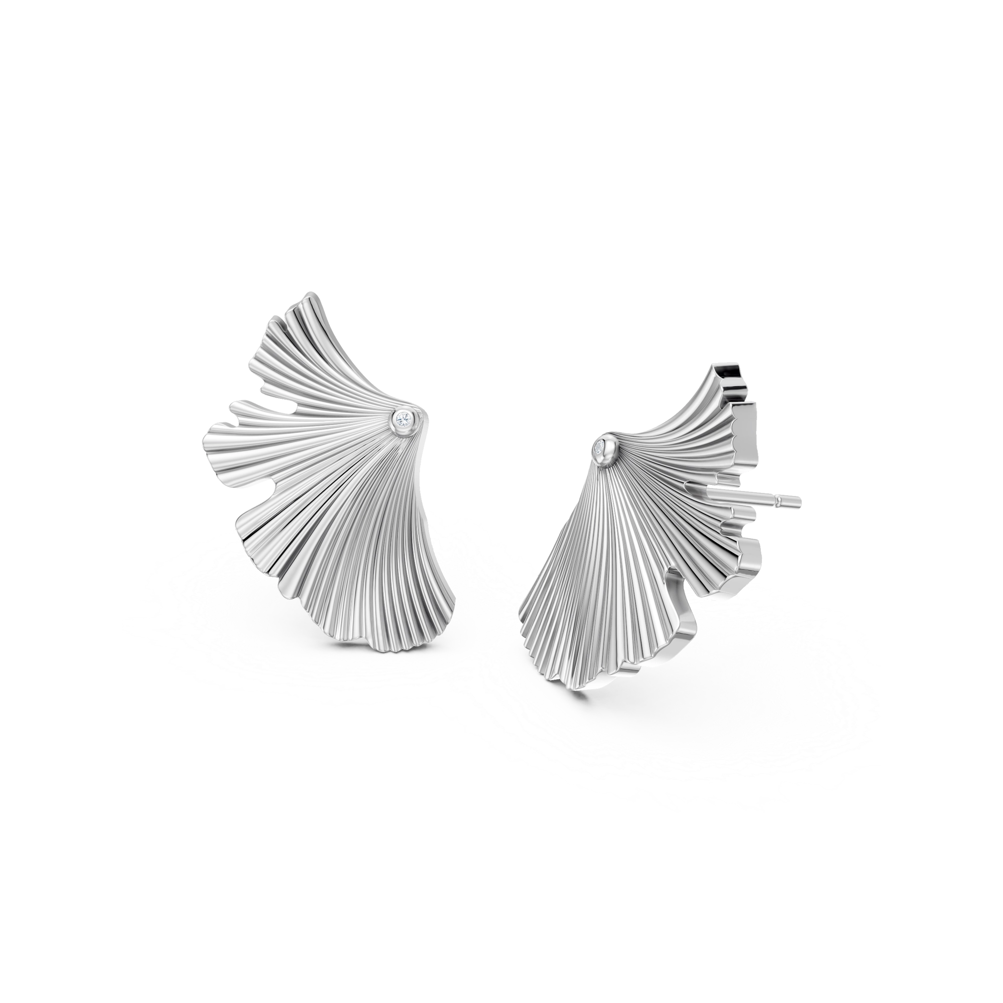 An ode to quiet brilliance. These petite fan-shaped studs embody the gentle grace of the peacock’s plume, capturing its delicate curve in a softly brushed finish. A single diamond nestles at the edge, like the eye of the feather — a subtle nod to clarity, wisdom and inner strength. Understated yet radiant, they are the perfect everyday emblem of graceful self-assurance.
