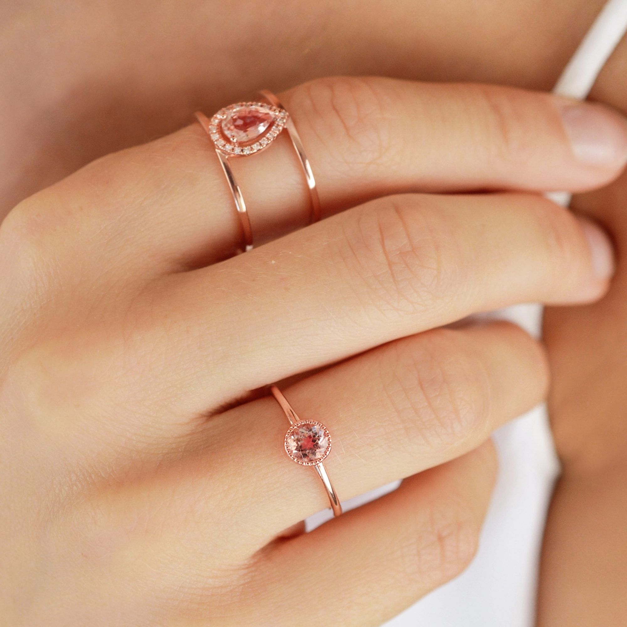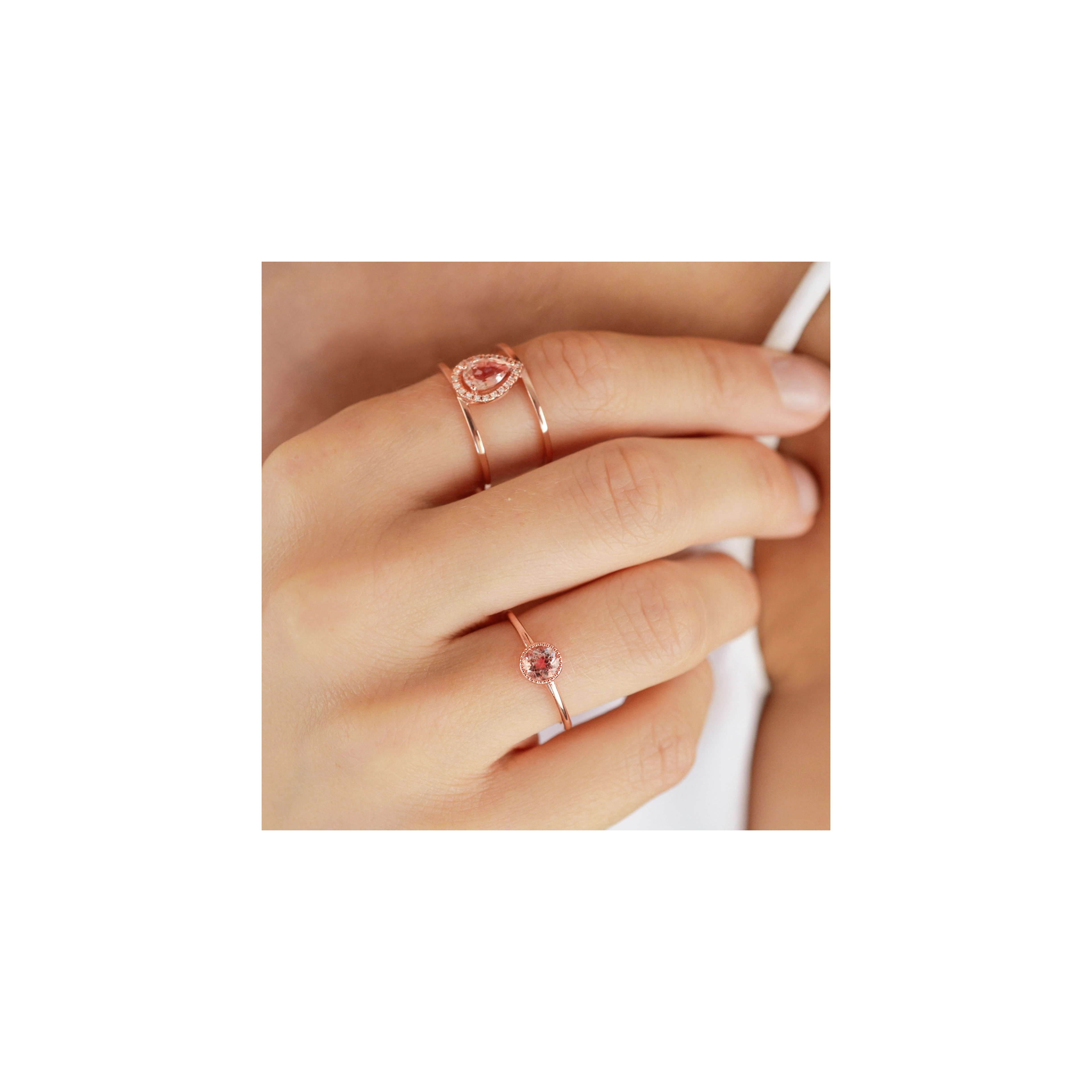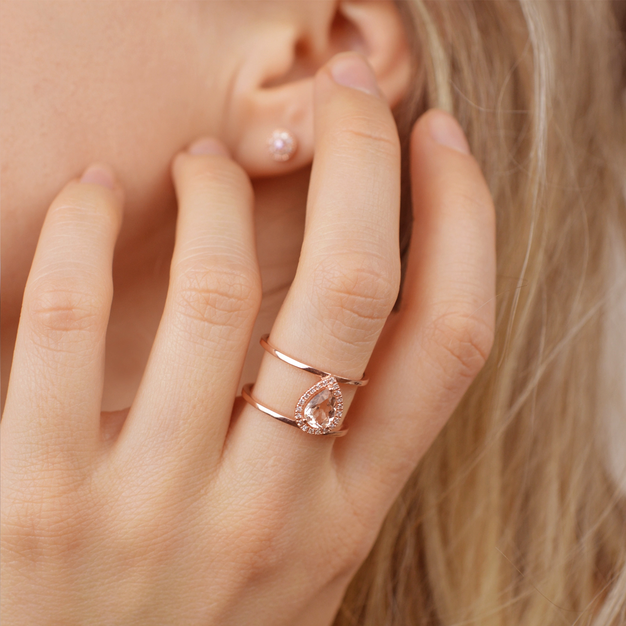 A captivating statement ring, featuring an interstellar fusion of precious stones; an exquisite pear-shaped Morganite gemstone, paved with 20x white diamonds.