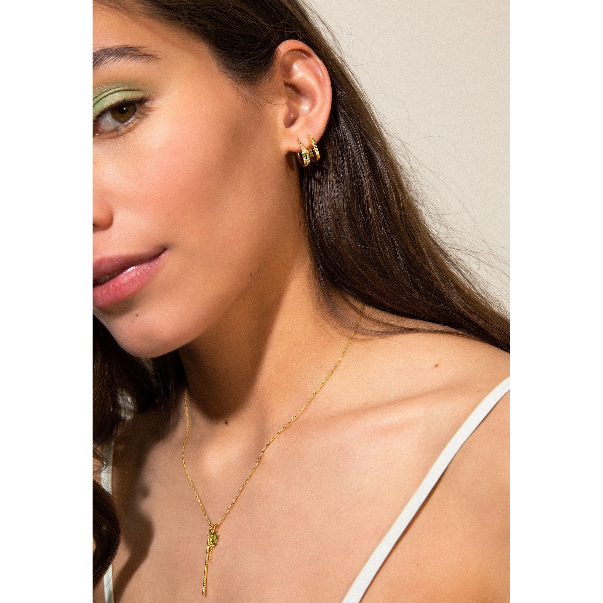 The soft shade of green and layered levels, we love to see in lush greenery landscapes and pistachio gelato. These peridot hugging hoops are the perfect refreshment on a hot summer day. Styling tip: Match with our Dolce Mare single hoop for the tastiest of looks.