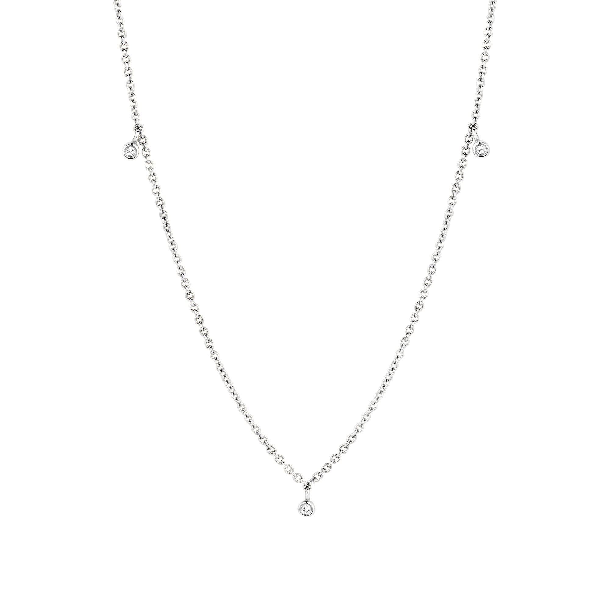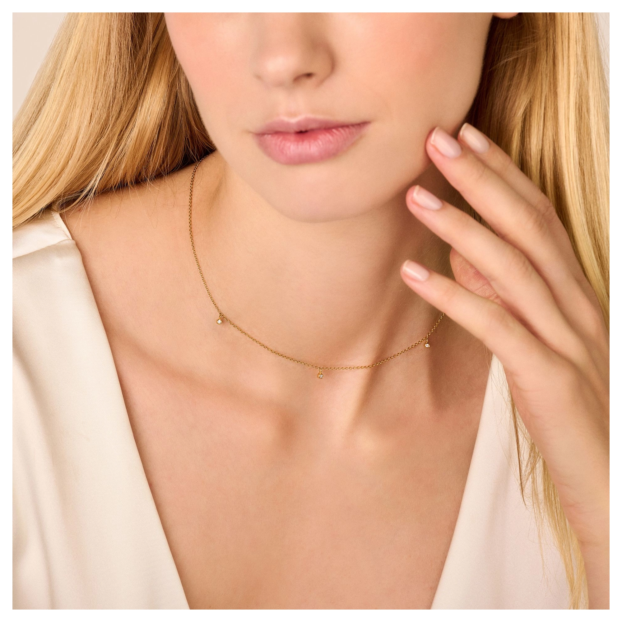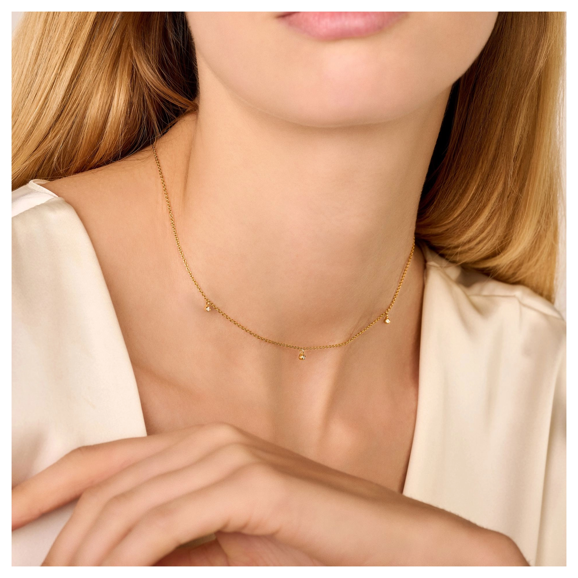 A subtle necklace carrying 3x white diamond drops, your 14 carat golden touch for an everlasting glow.