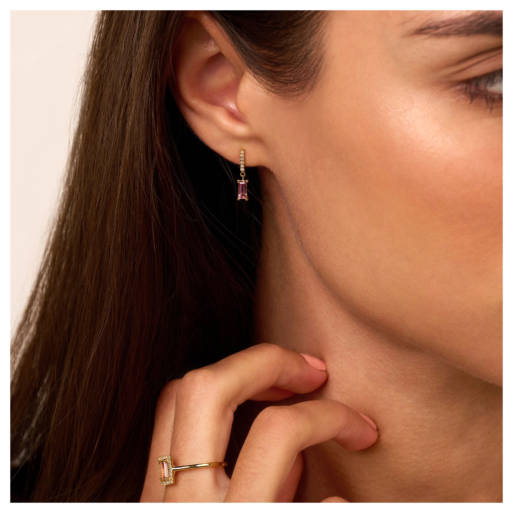 Striking pink Tourmalines add a soft touch to these contemporary and ravishing 14 carat gold earrings. Defining pure beauty as 12x white diamonds catch the playful light of day.
