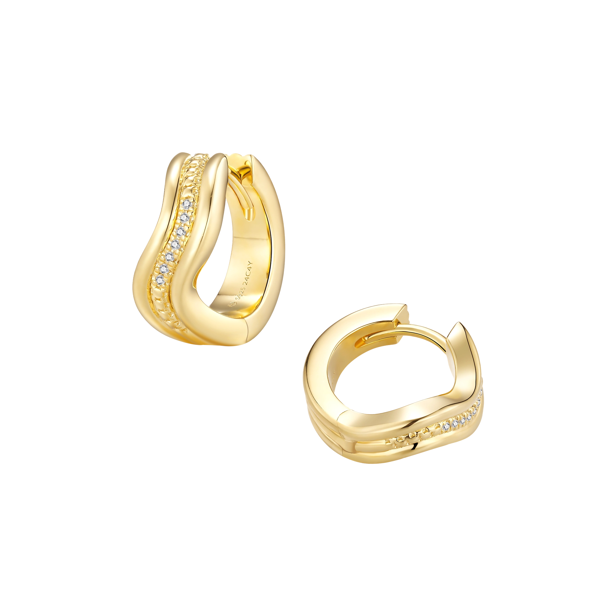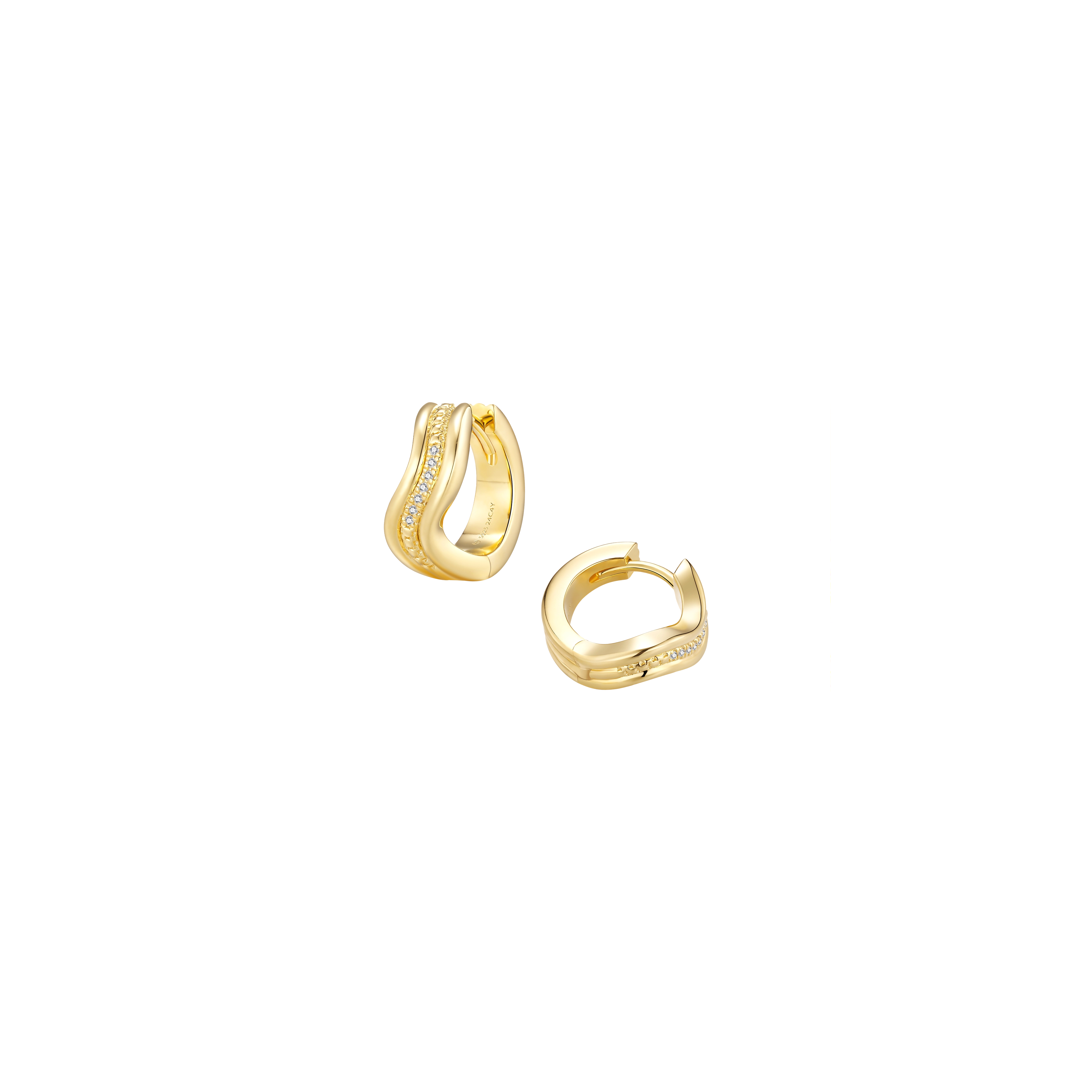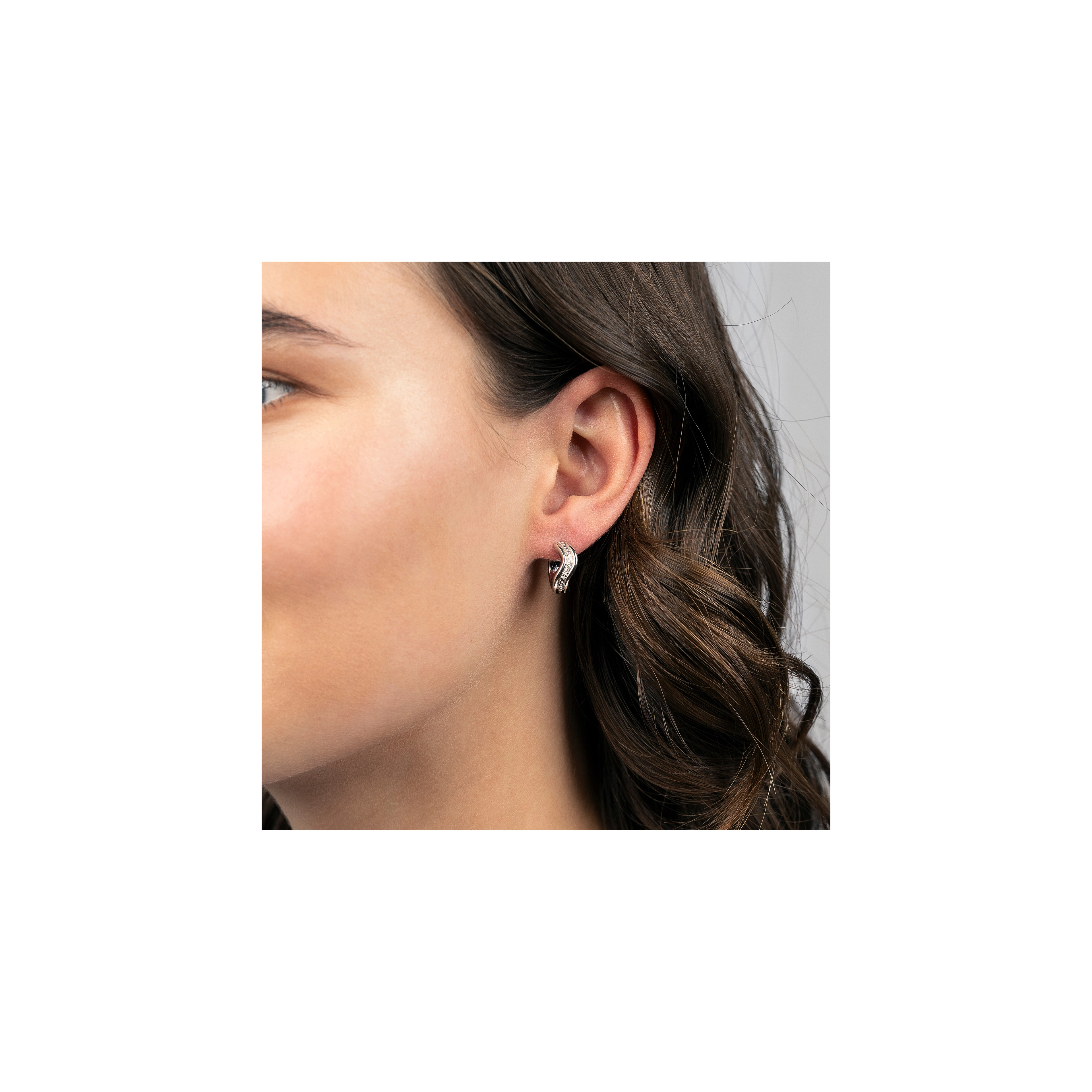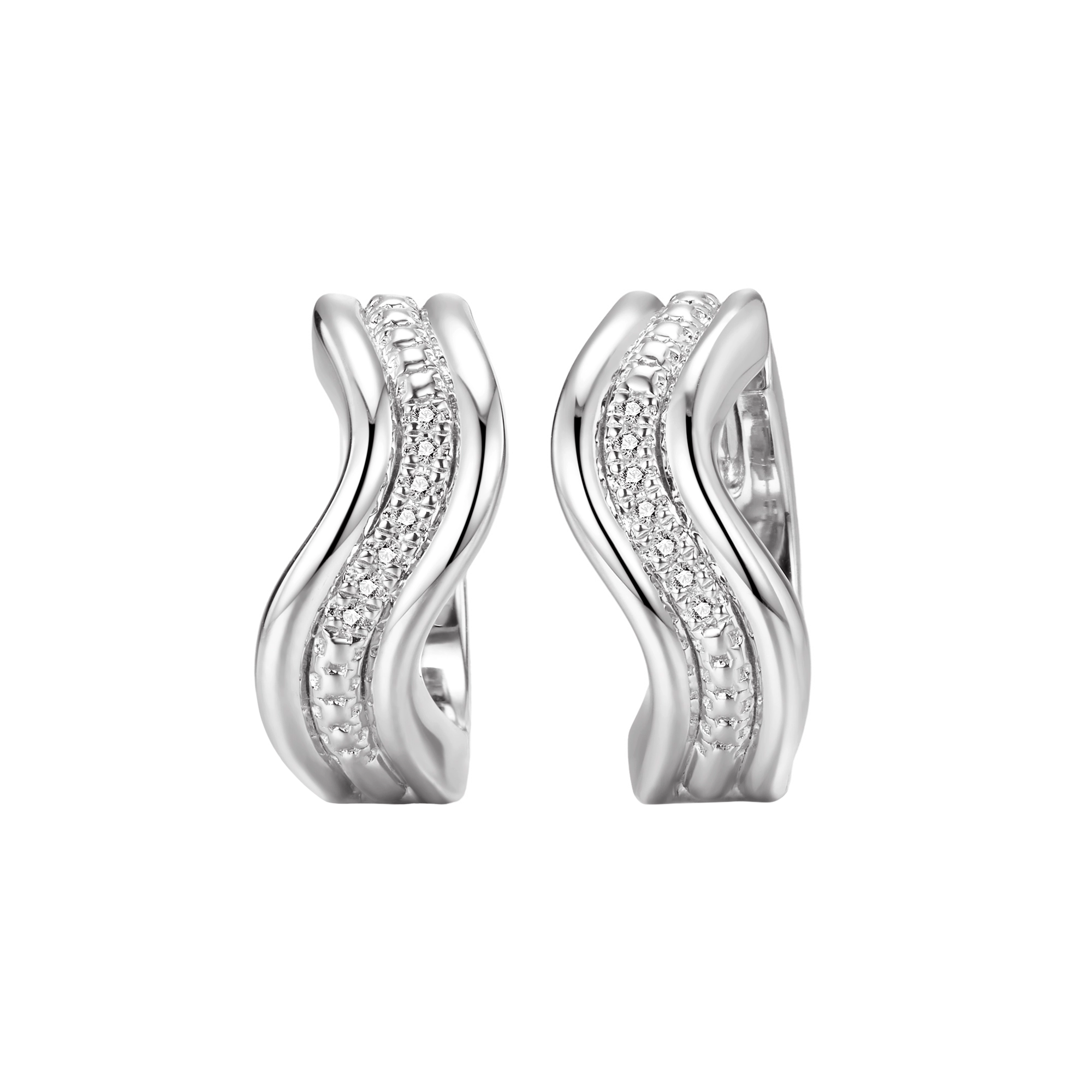 Dive into elegance — a pair of hugging hoops, inspired by the graceful stream of the water element. Three fl owing bands that swirl together mimic the fluidity and movement of the ocean’s currents. The center band, handset with7x sparkling natural diamonds, catches the light like glistening waves.